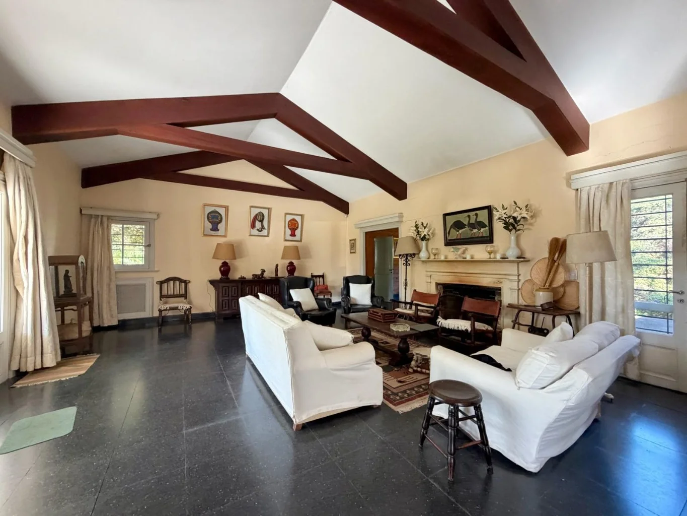 Amplio Living con estufa a leña y vigas de madera a la vista.