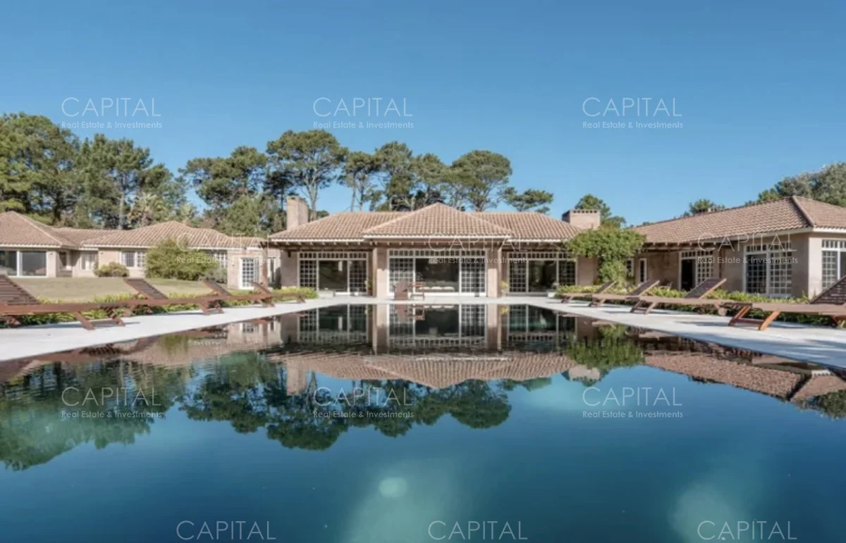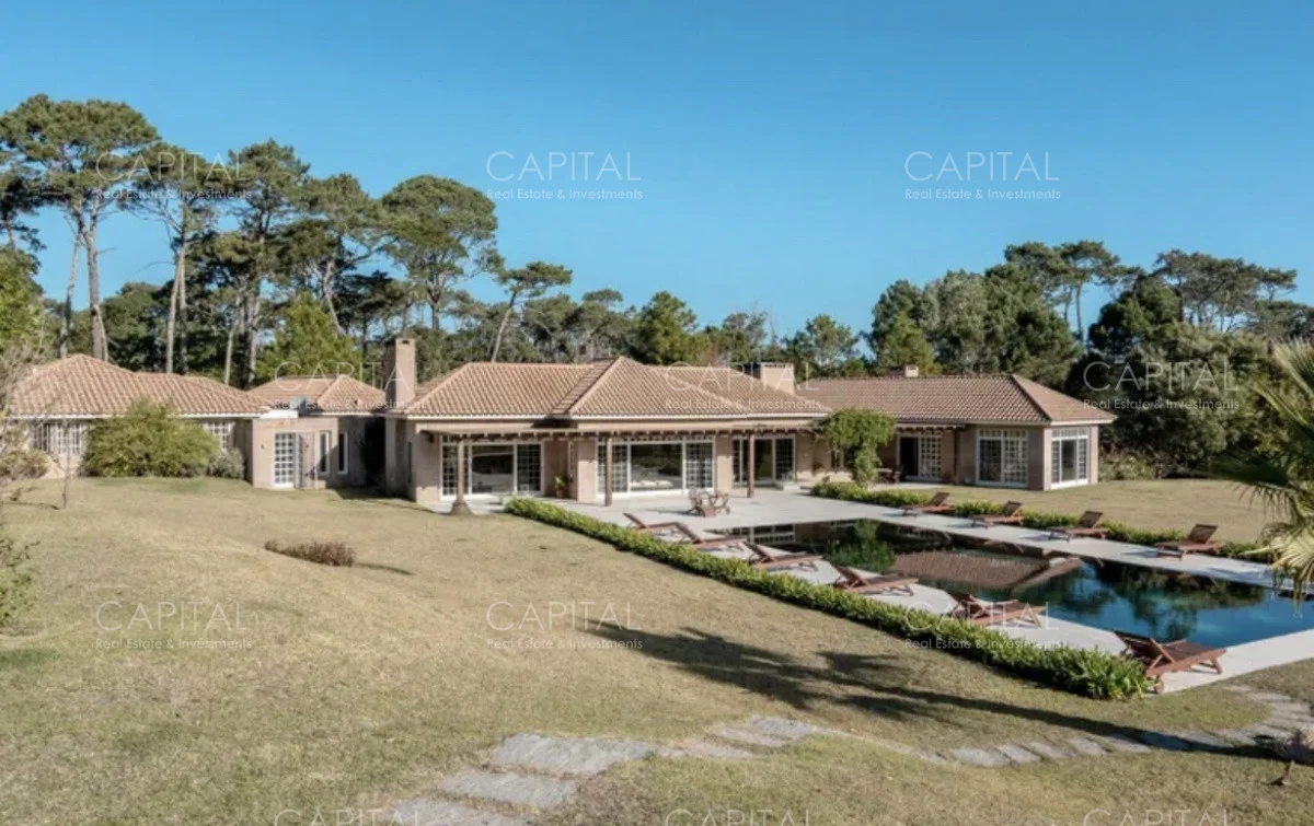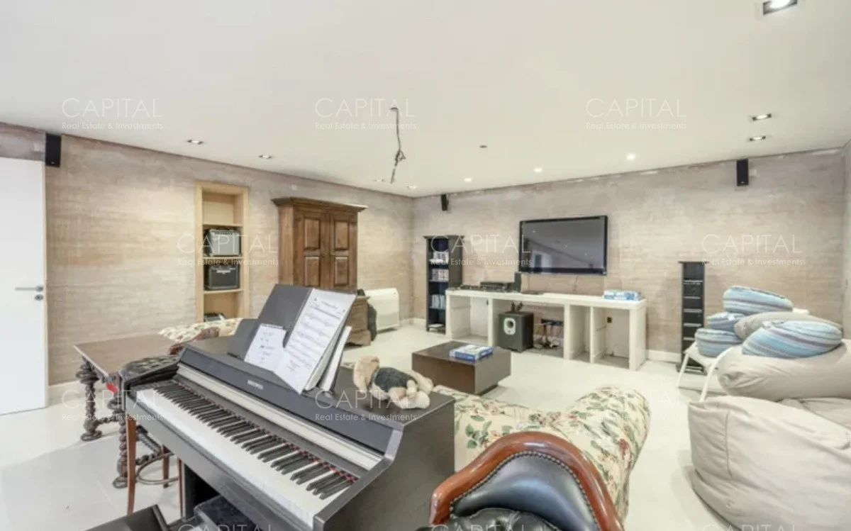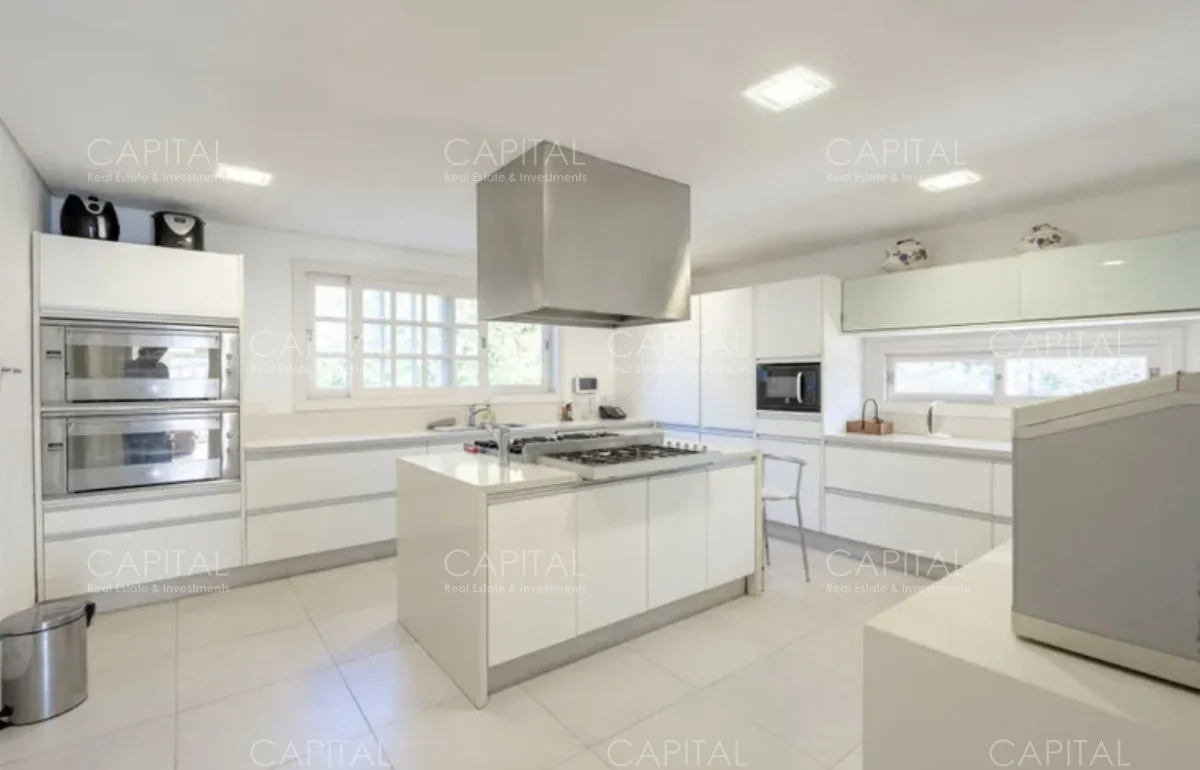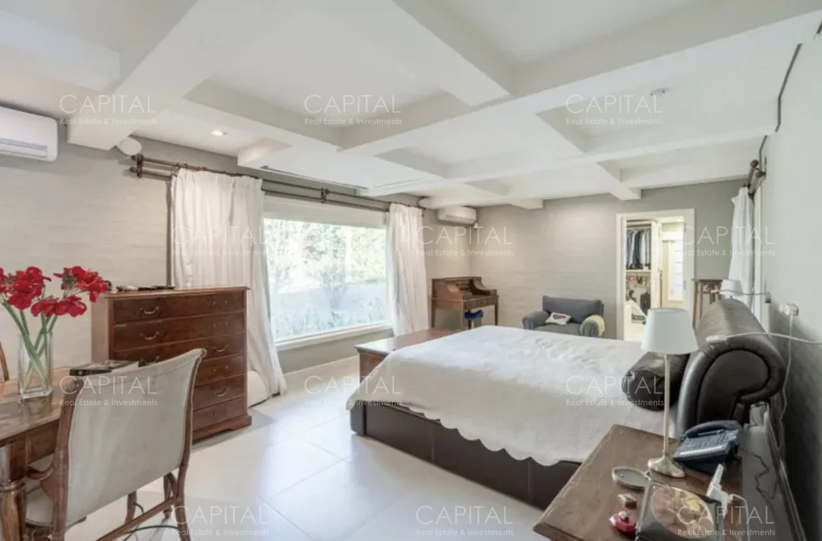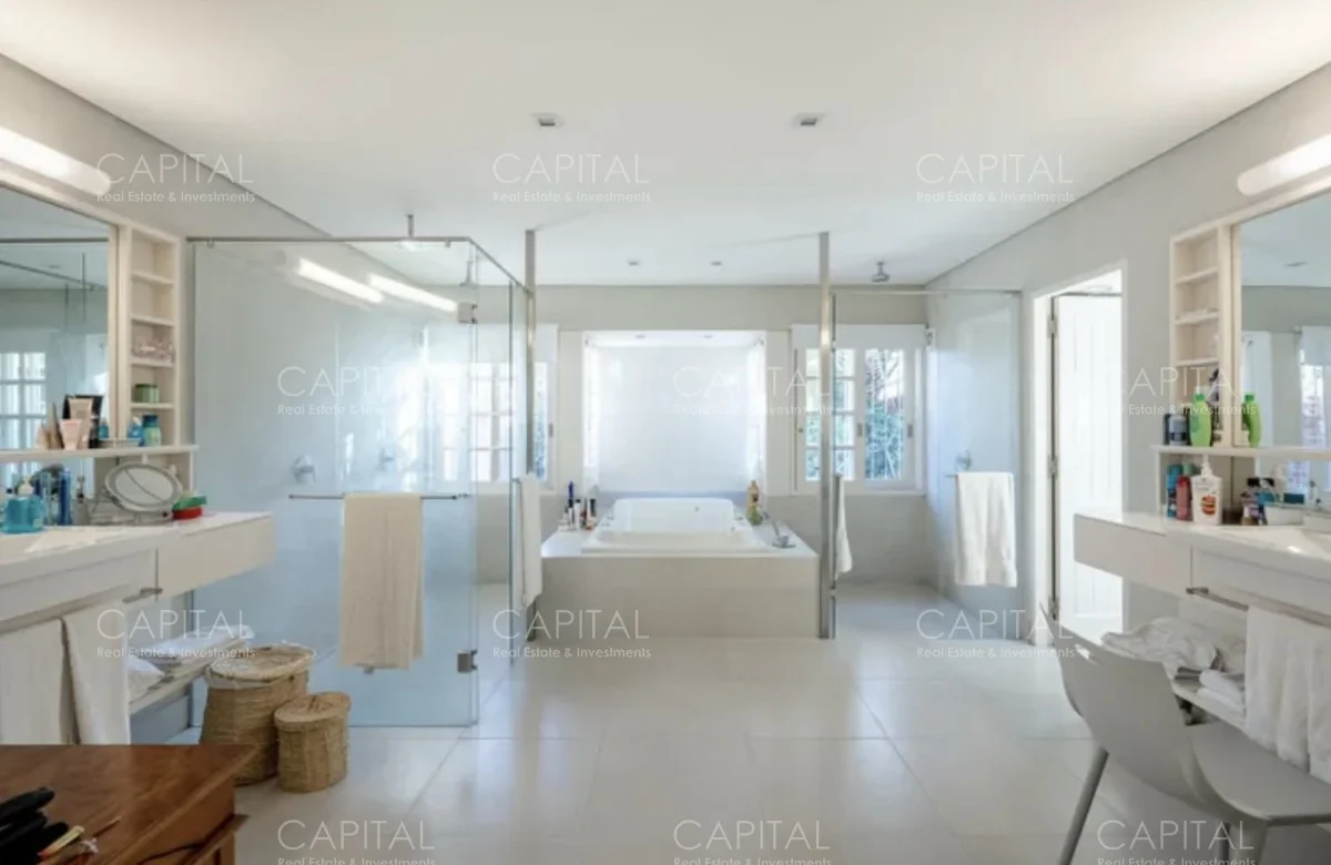 Cuenta con 9 habitaciones en suite (principal suite con amplio vestidor y baño doble con duchas y jacuzzi), 12 baños, oficina, amplia sala, comedor y sala de estar con chimenea, todo con grandes ventanales con vista al parque y piscina. Cocina, amplio quincho, play-room con home cinema, losa radiante a gas, agua caliente central, cancha de tenis, despensa, dependencia de servicio, jardín interior y amplia galería. Lavadero y garaje para 3 coches. Piscina climatizada exterior con deck.
