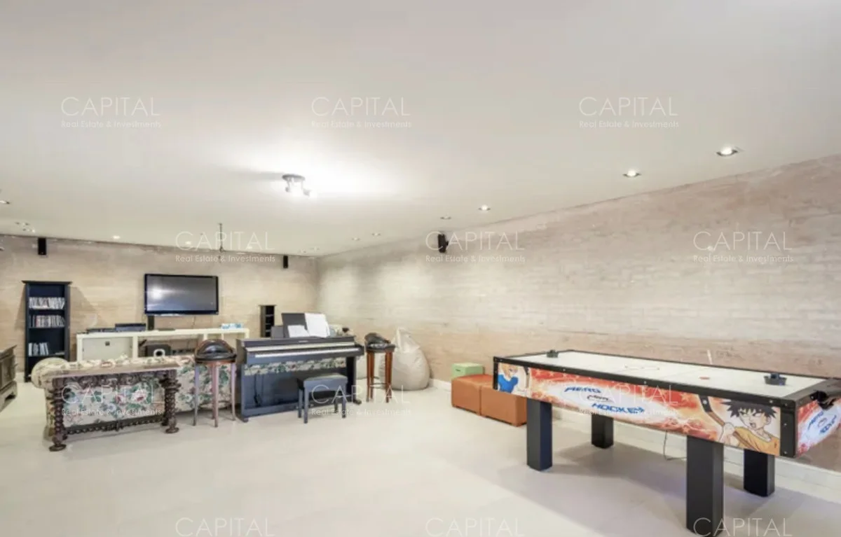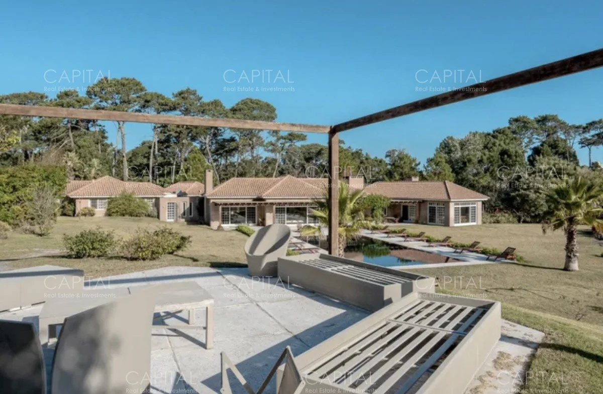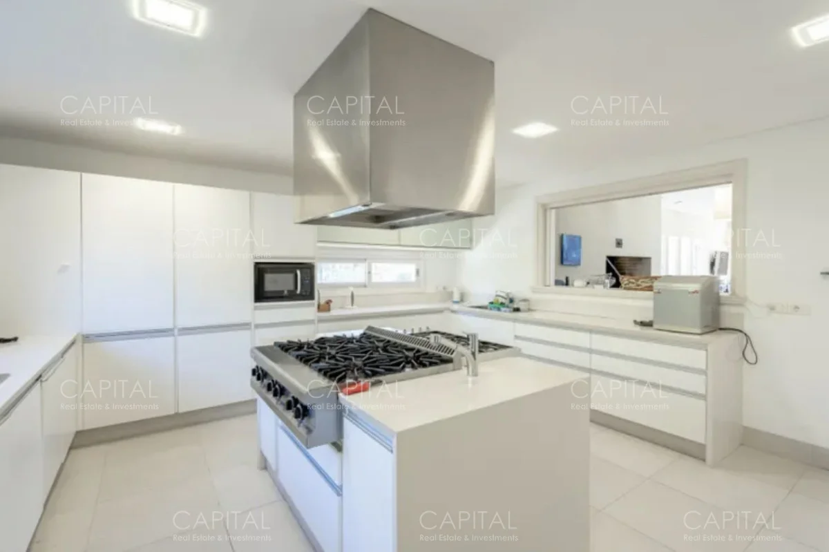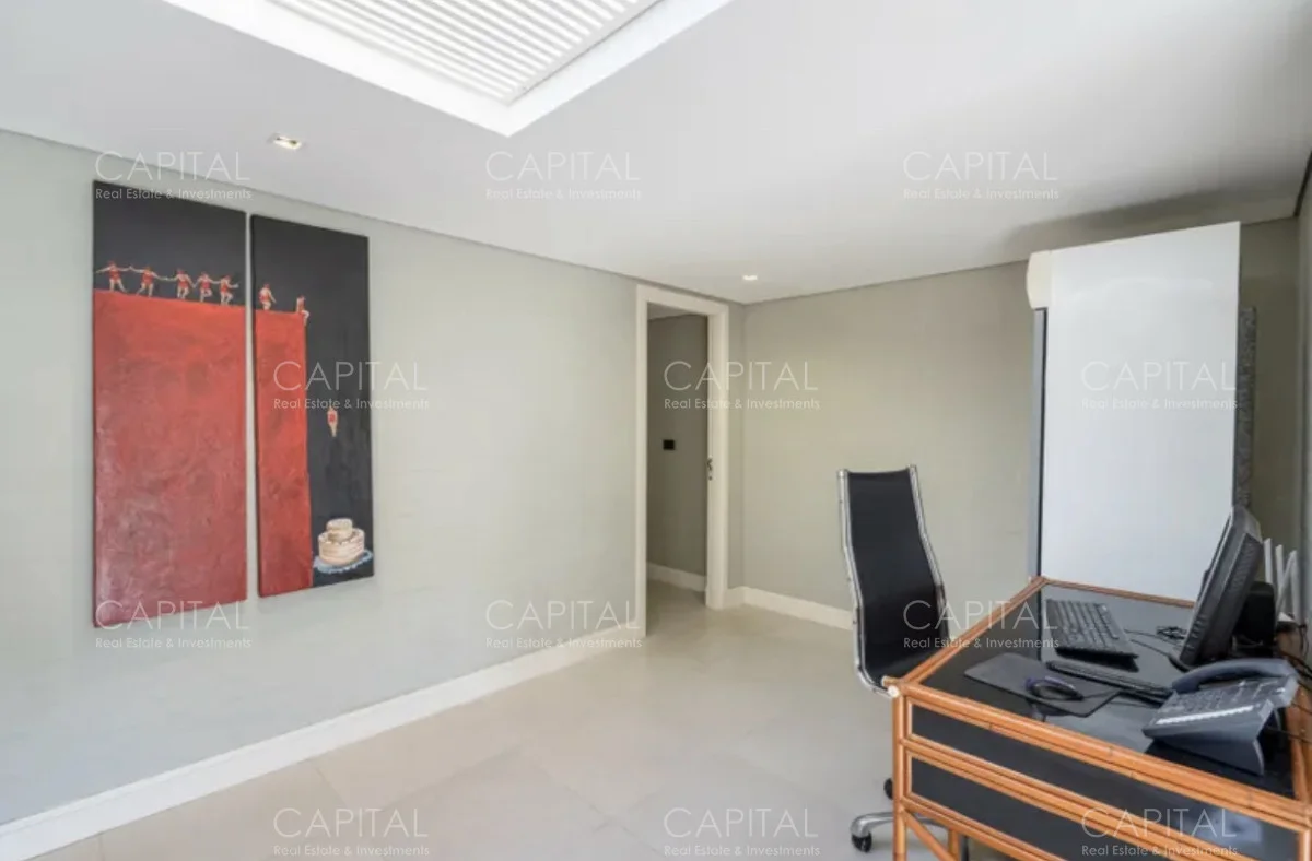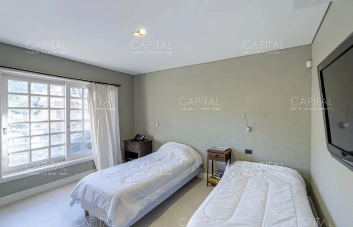 Cuenta con 9 habitaciones en suite (principal suite con amplio vestidor y baño doble con duchas y jacuzzi), 12 baños, oficina, amplia sala, comedor y sala de estar con chimenea, todo con grandes ventanales con vista al parque y piscina. Cocina, amplio quincho, play-room con home cinema, losa radiante a gas, agua caliente central, cancha de tenis, despensa, dependencia de servicio, jardín interior y amplia galería. Lavadero y garaje para 3 coches. Piscina climatizada exterior con deck.