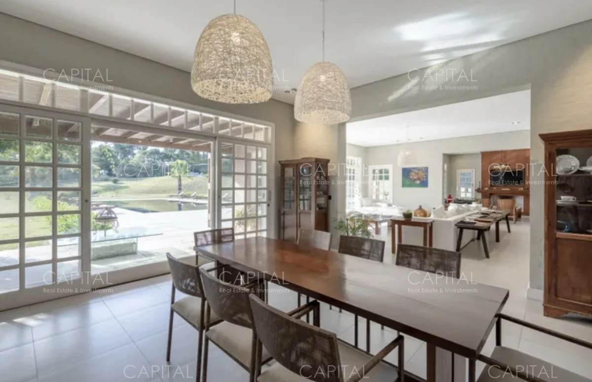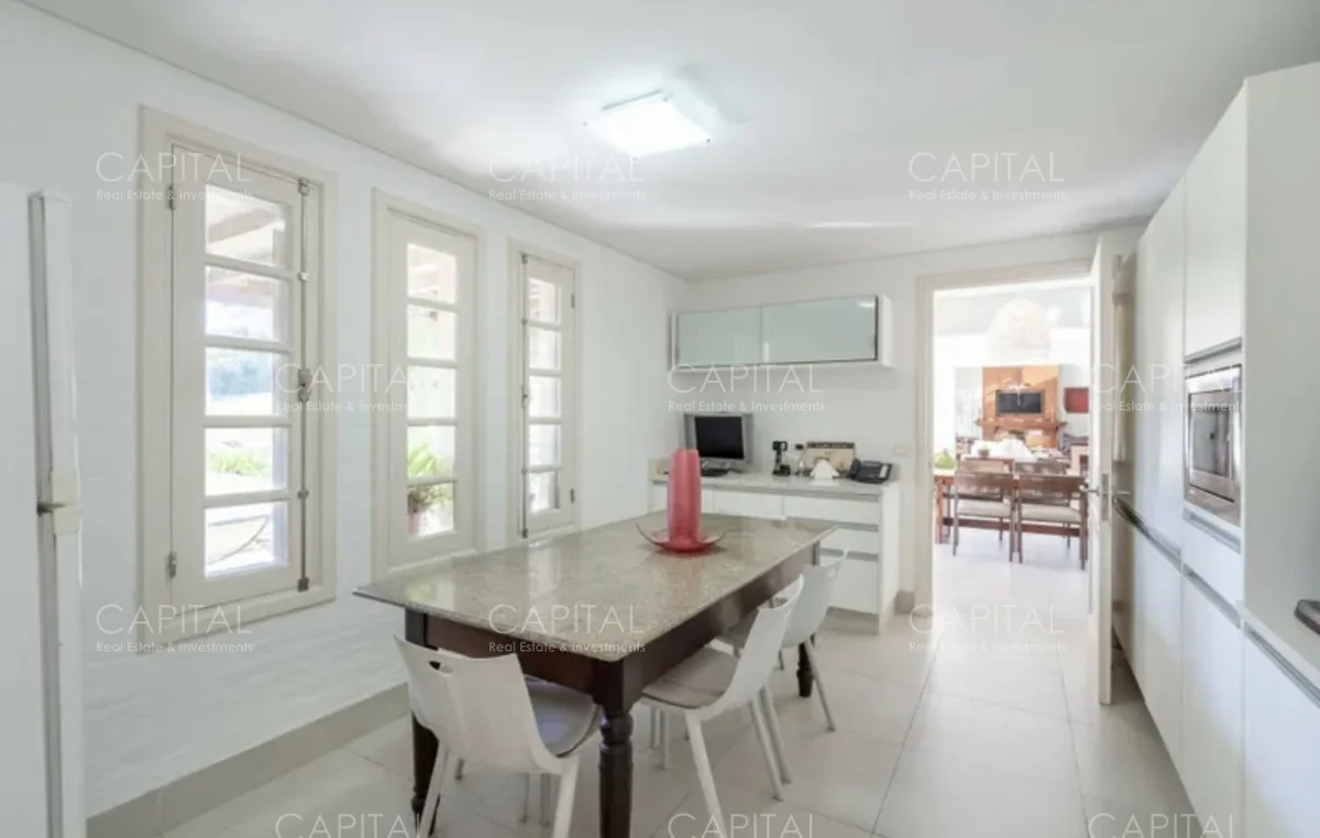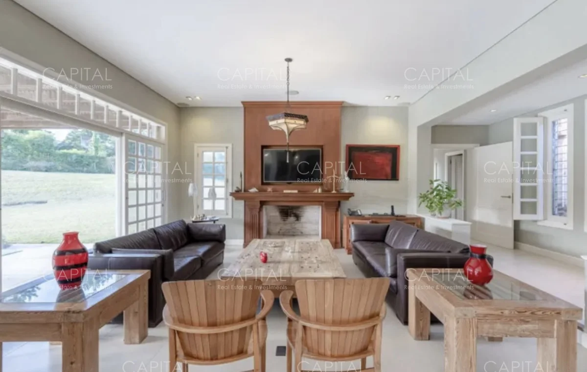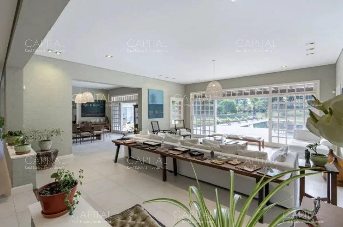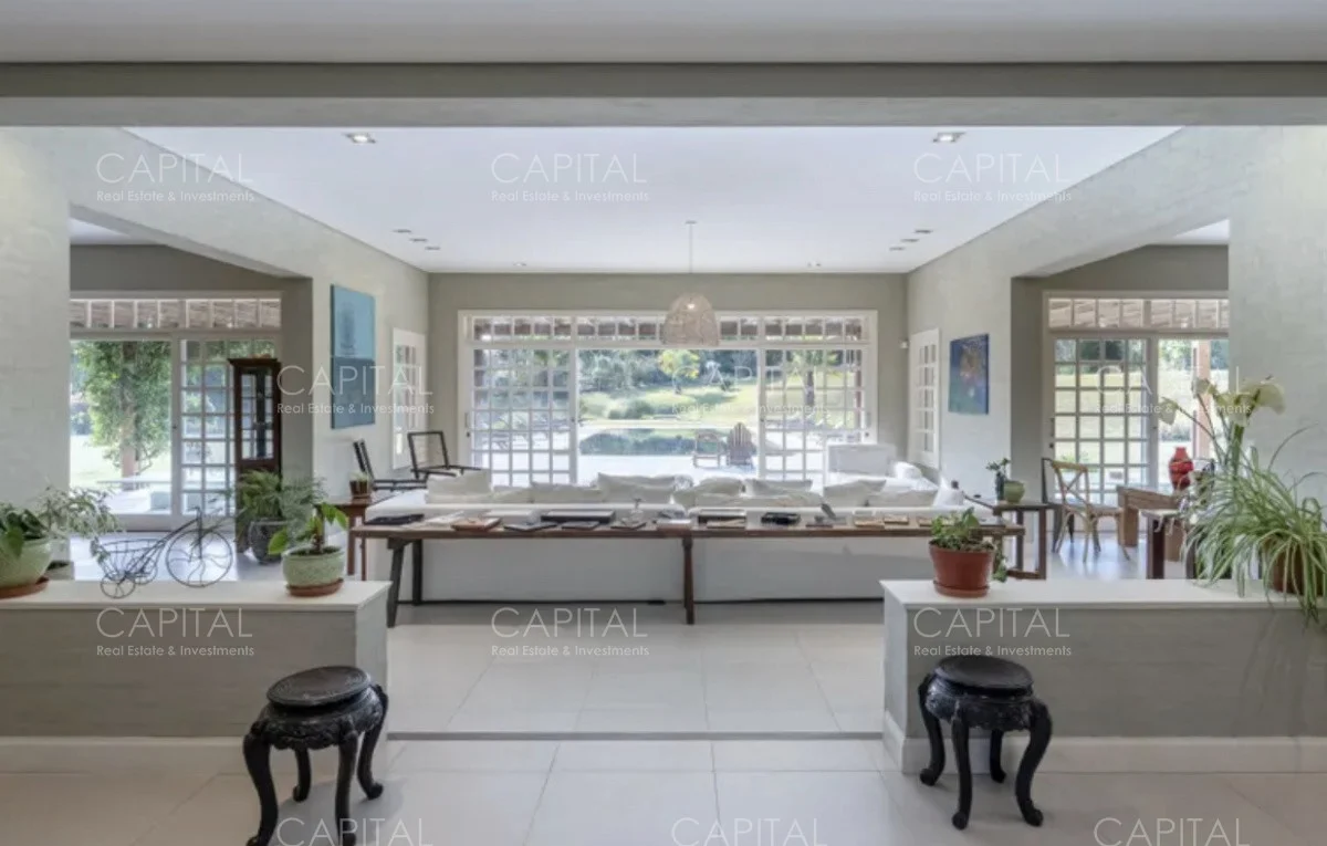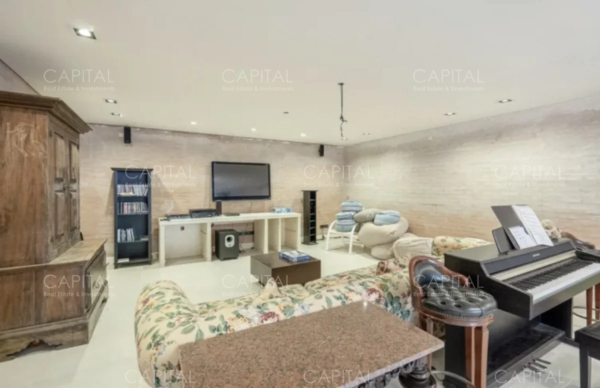 Cuenta con 9 habitaciones en suite (principal suite con amplio vestidor y baño doble con duchas y jacuzzi), 12 baños, oficina, amplia sala, comedor y sala de estar con chimenea, todo con grandes ventanales con vista al parque y piscina. Cocina, amplio quincho, play-room con home cinema, losa radiante a gas, agua caliente central, cancha de tenis, despensa, dependencia de servicio, jardín interior y amplia galería. Lavadero y garaje para 3 coches. Piscina climatizada exterior con deck.