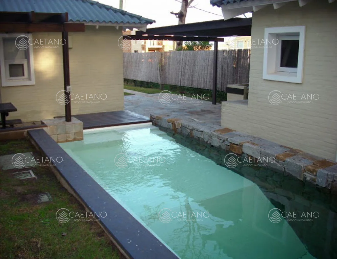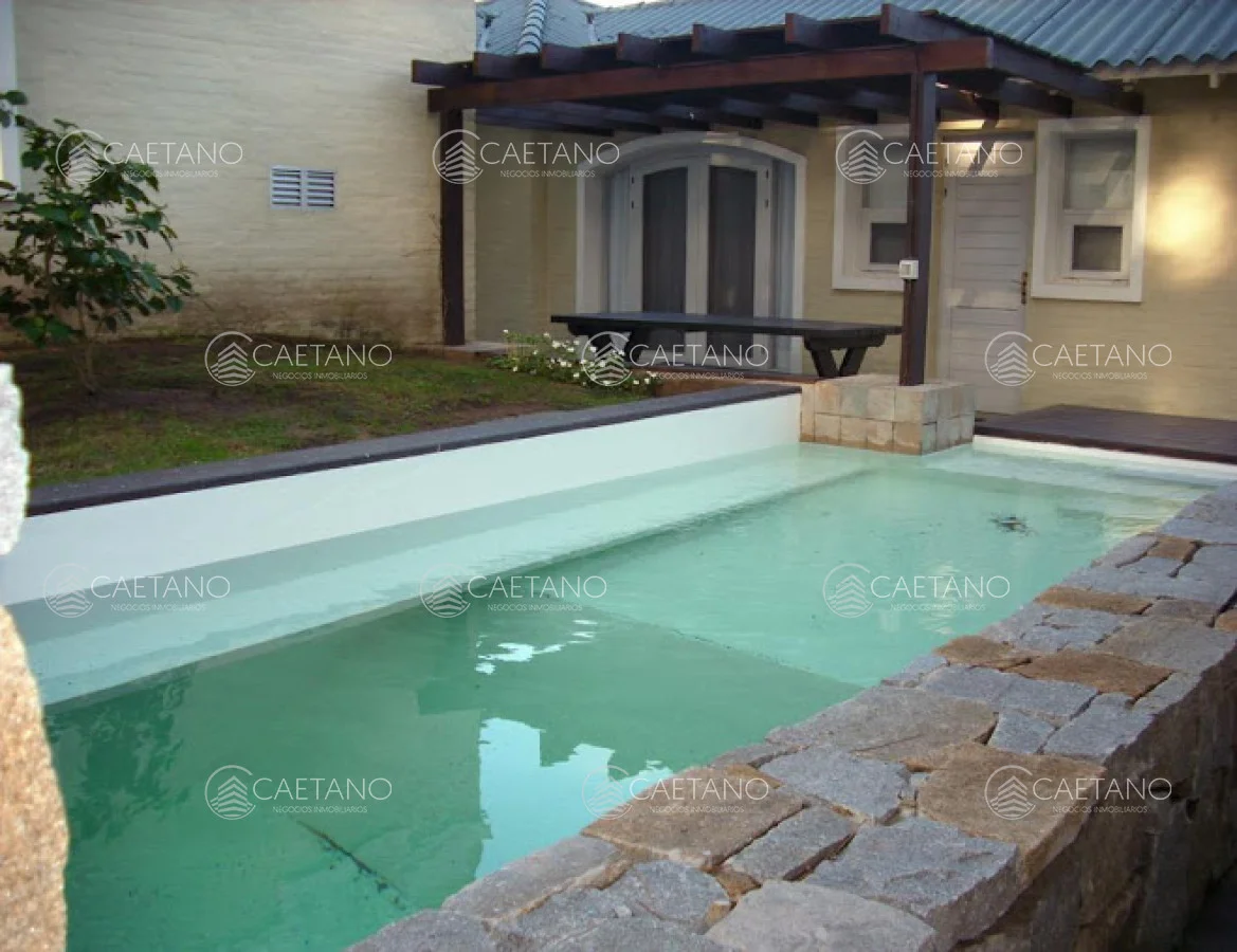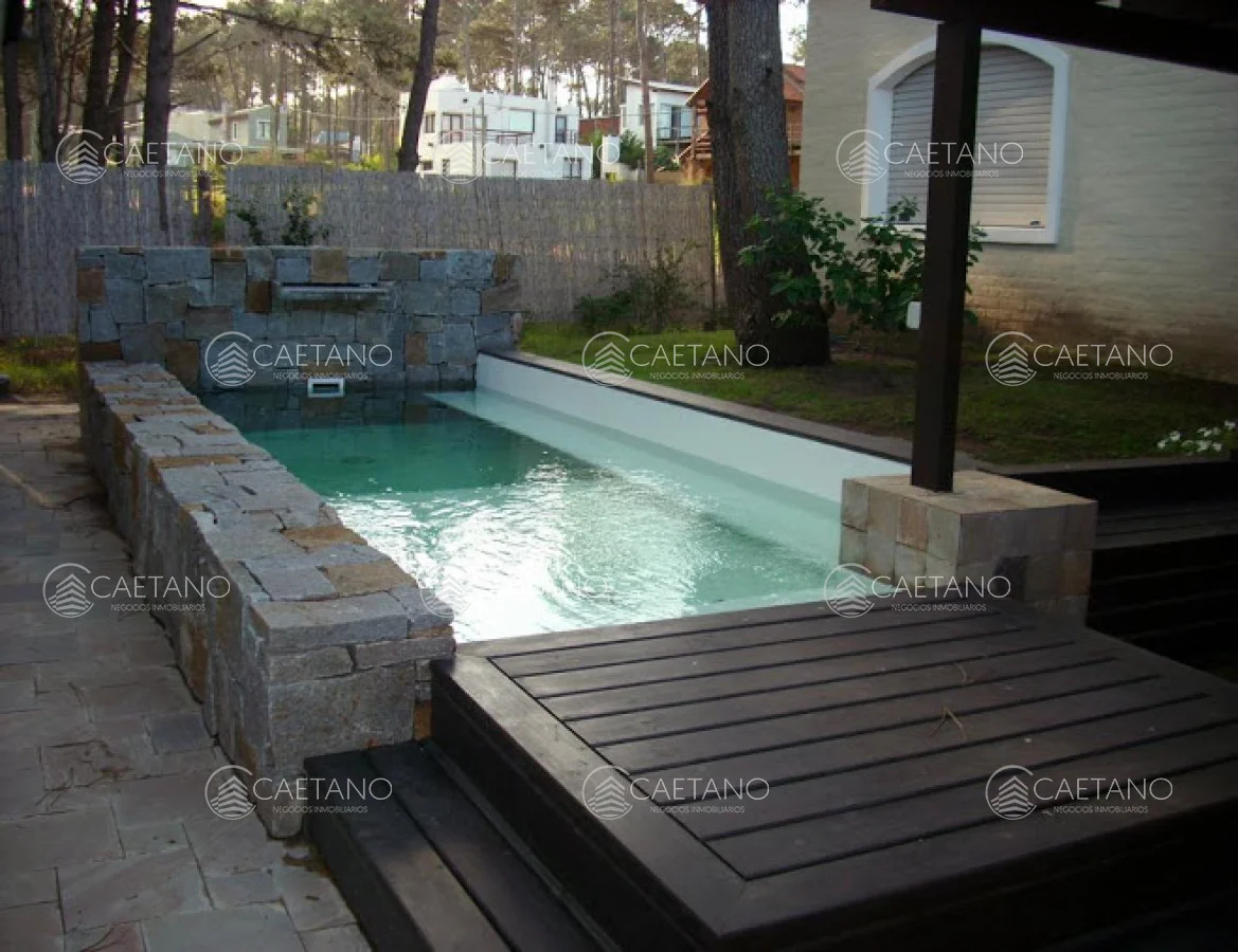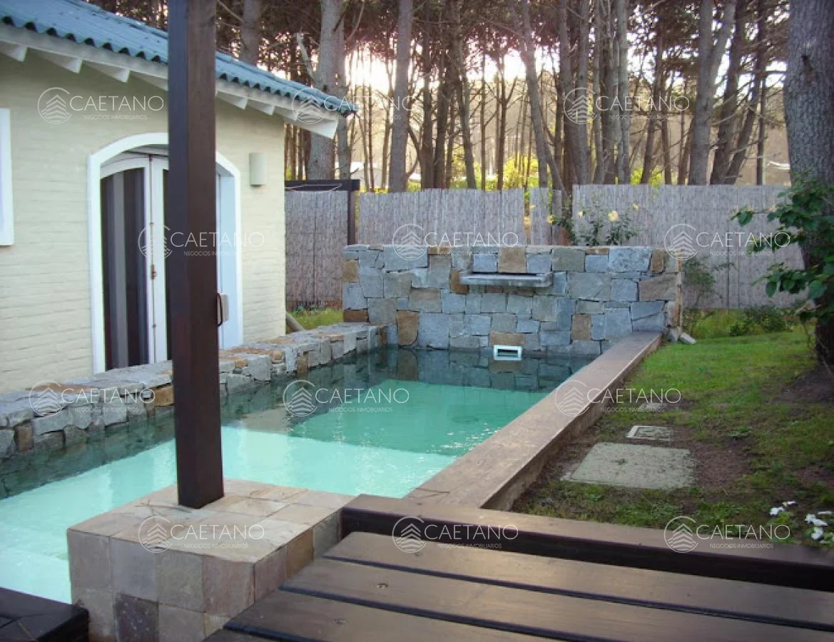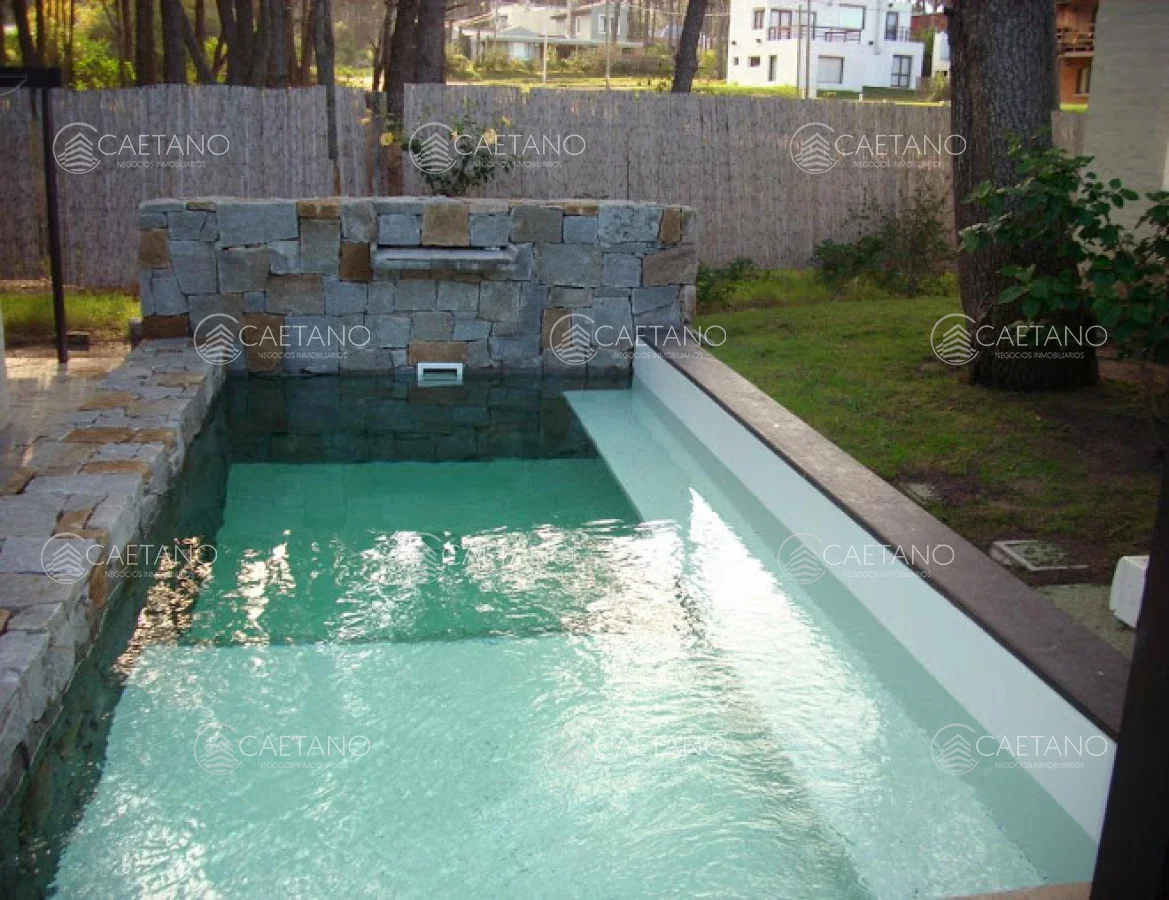 Piscina pequeña con terminaciones en piedra rústica natural.-