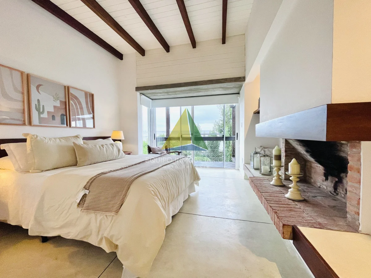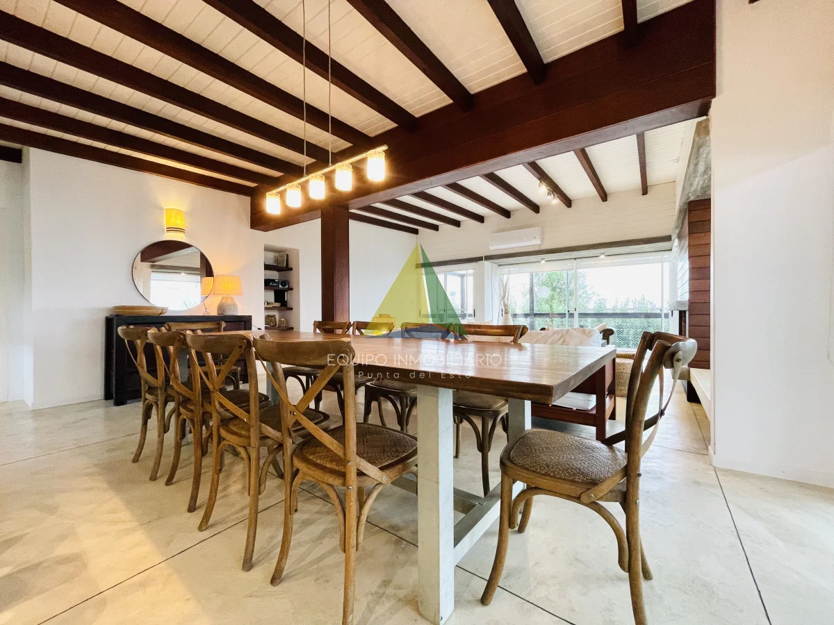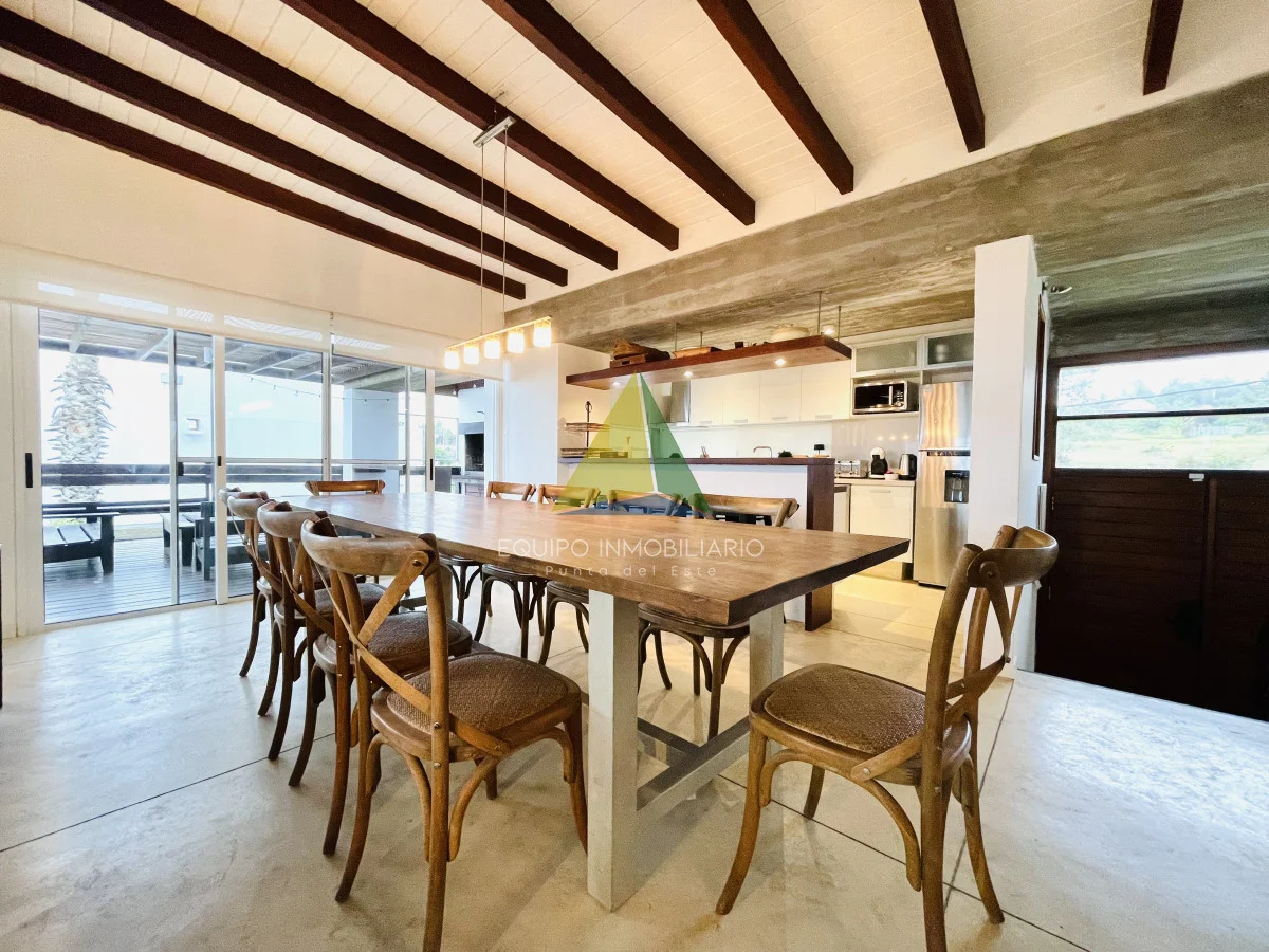 Dispone de amplio living comedor con excelente vista hacia el mar, estufa a leña, y salida al deck que rodea toda la planta alta; donde está ubicado el parrillero y estar exterior. Cocina bien equipada. Cinco cómodos dormitorios, dos de ellos en suite, más dependencia de servicio con baño (capacidad para 11 plazas en confortables sommiers).