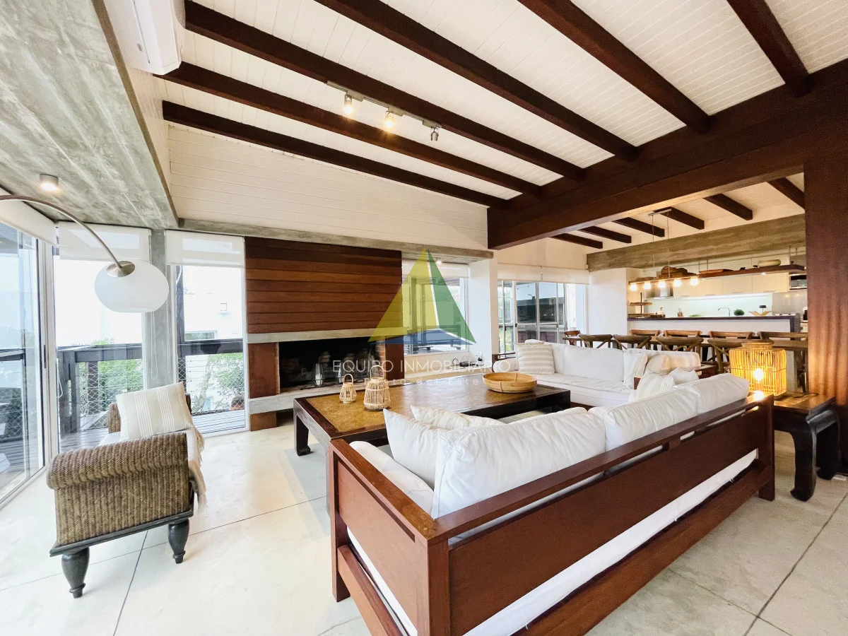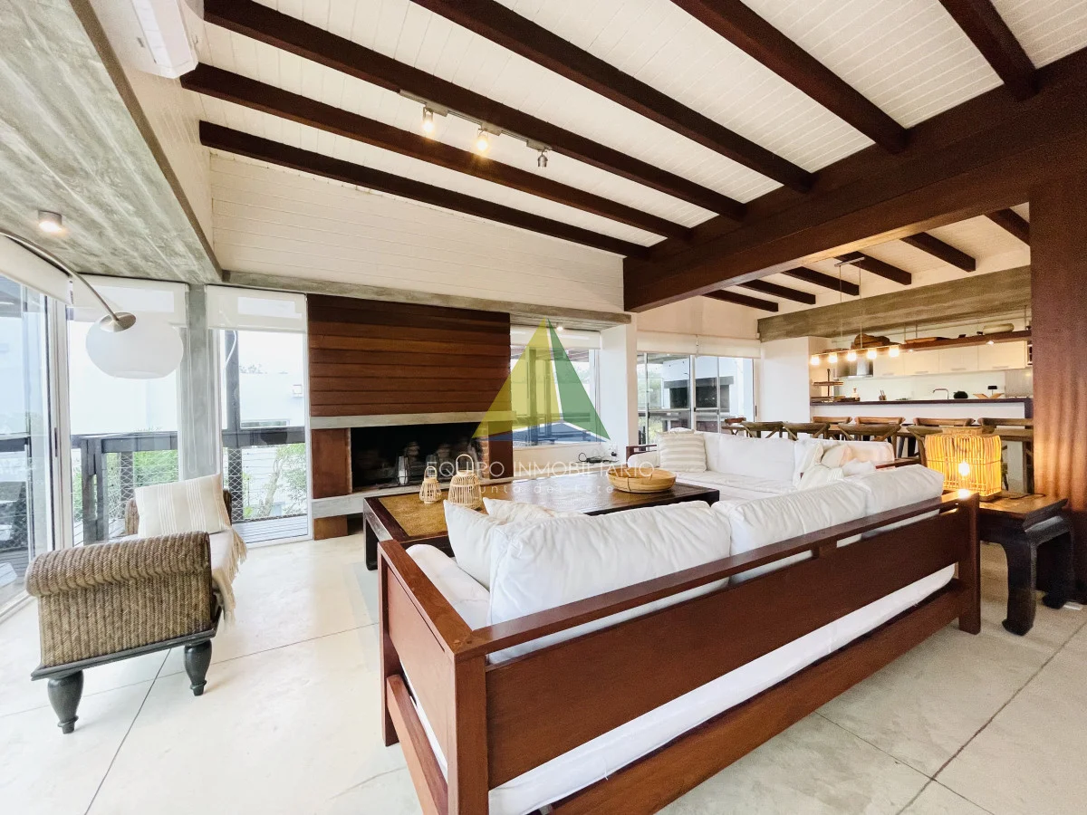 Dispone de amplio living comedor con excelente vista hacia el mar, estufa a leña, y salida al deck que rodea toda la planta alta; donde está ubicado el parrillero y estar exterior. Cocina bien equipada. Cinco cómodos dormitorios, dos de ellos en suite, más dependencia de servicio con baño (capacidad para 11 plazas en confortables sommiers).