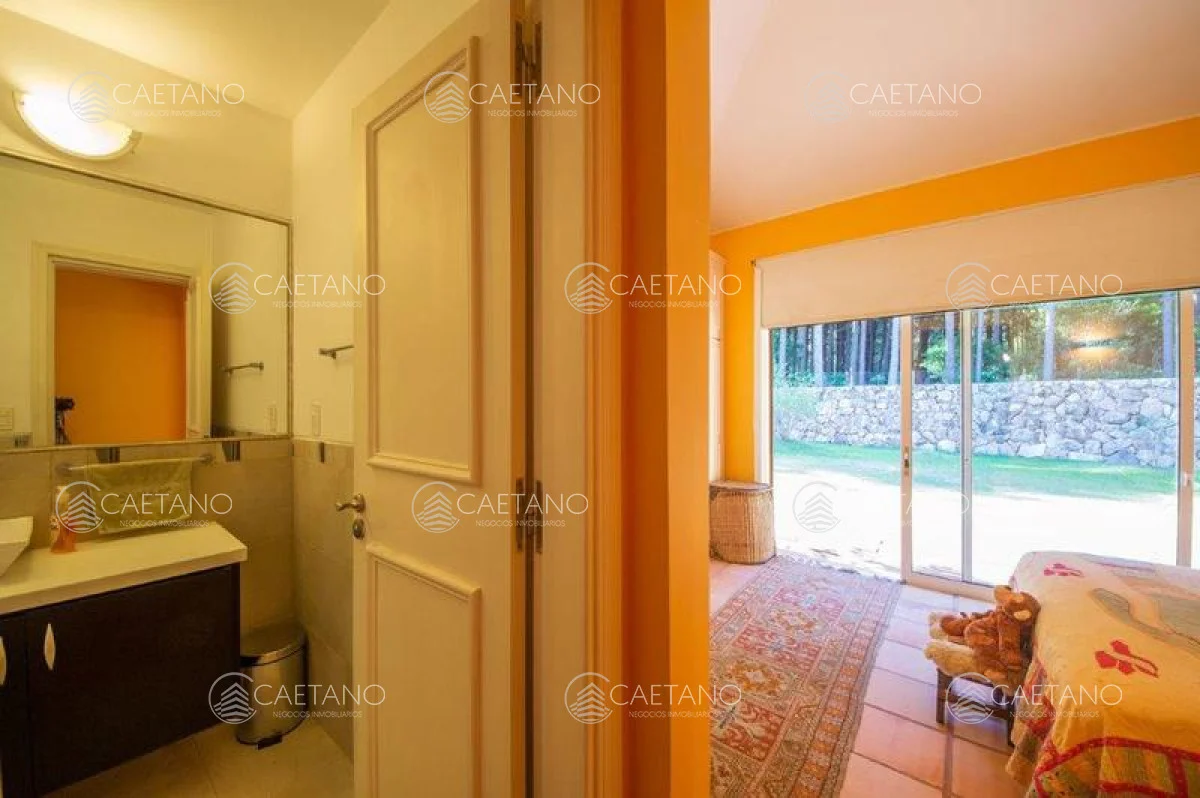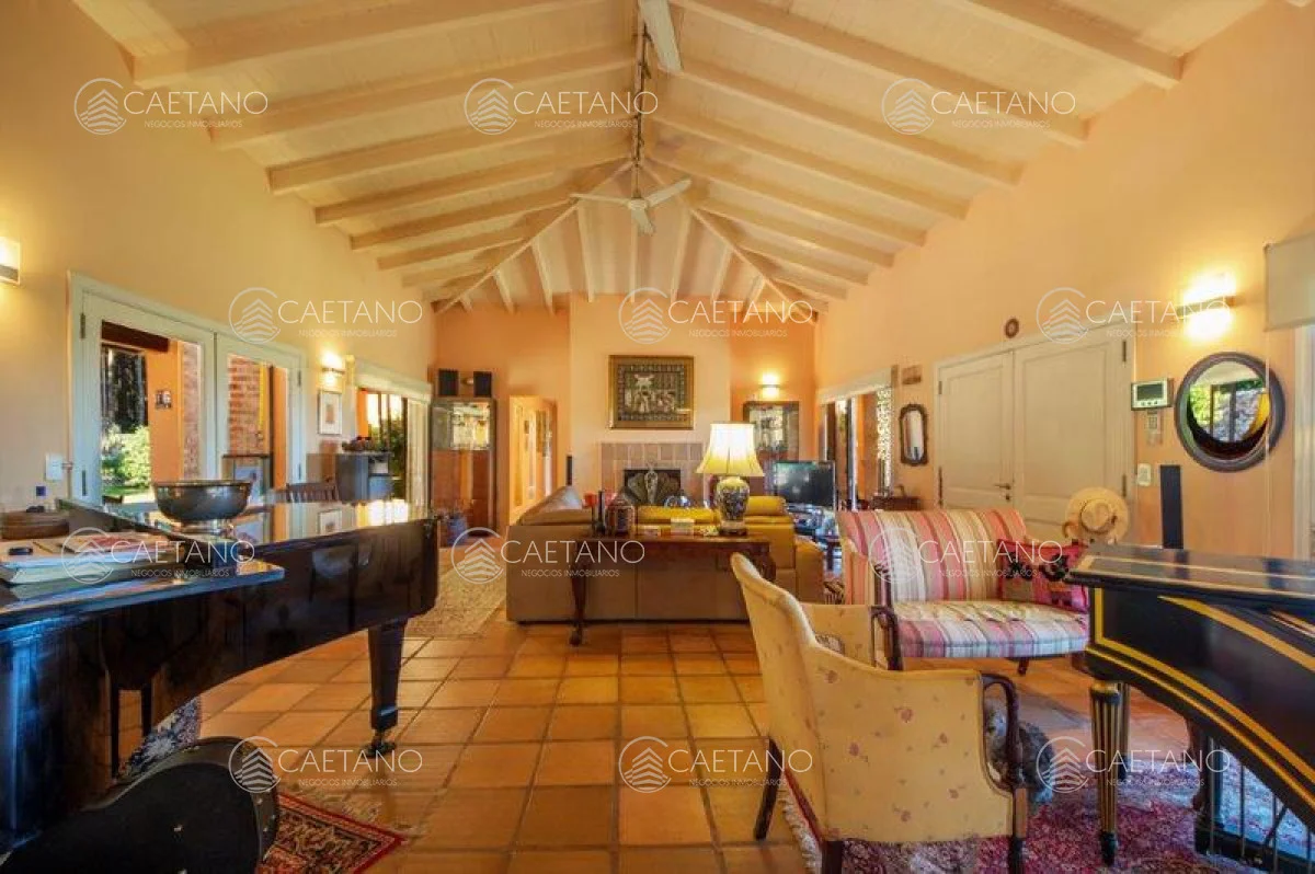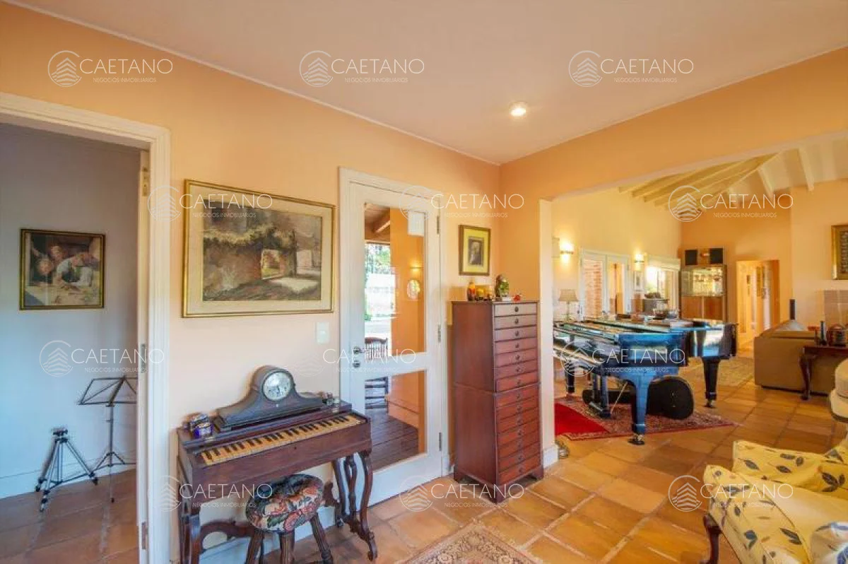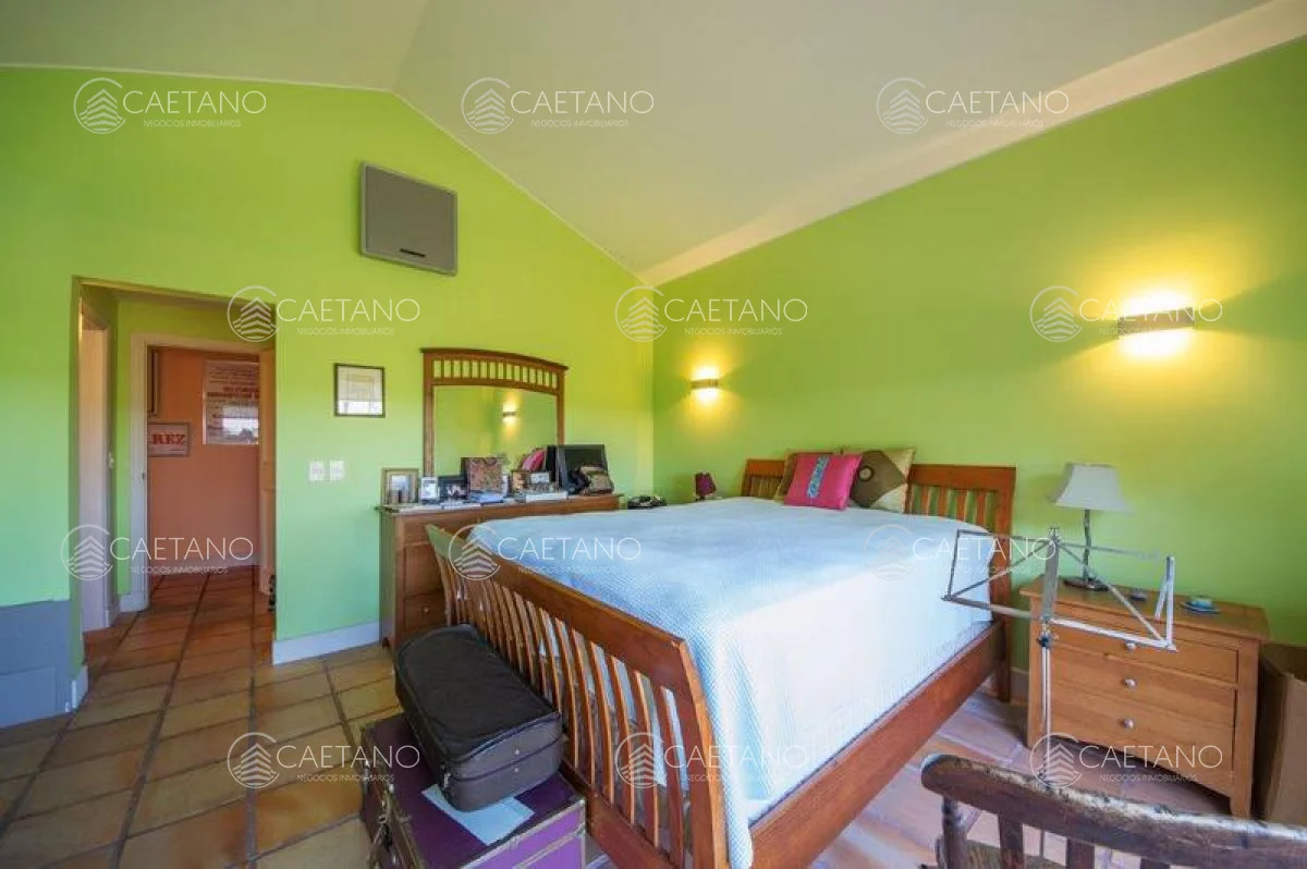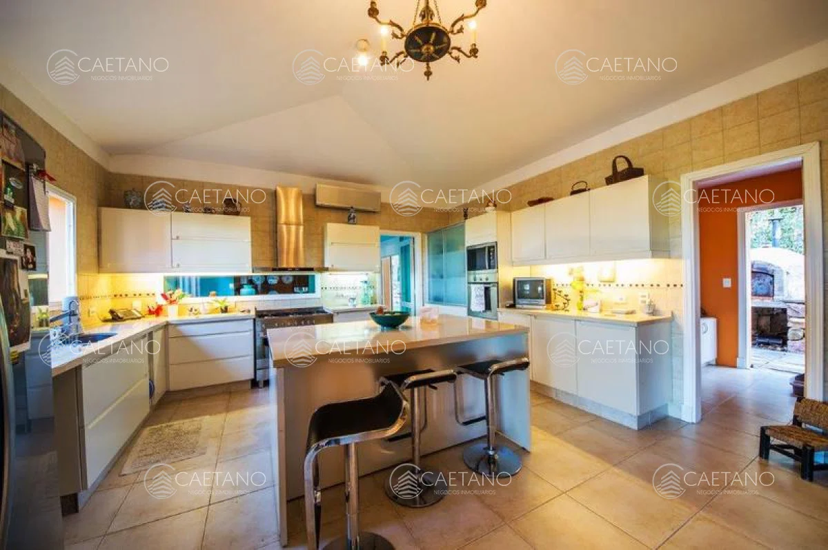La casa principal tiene 4 dormitorios en suite, gran living, comendor, toilette, cocina, comedor diario, alacena y servicio.
