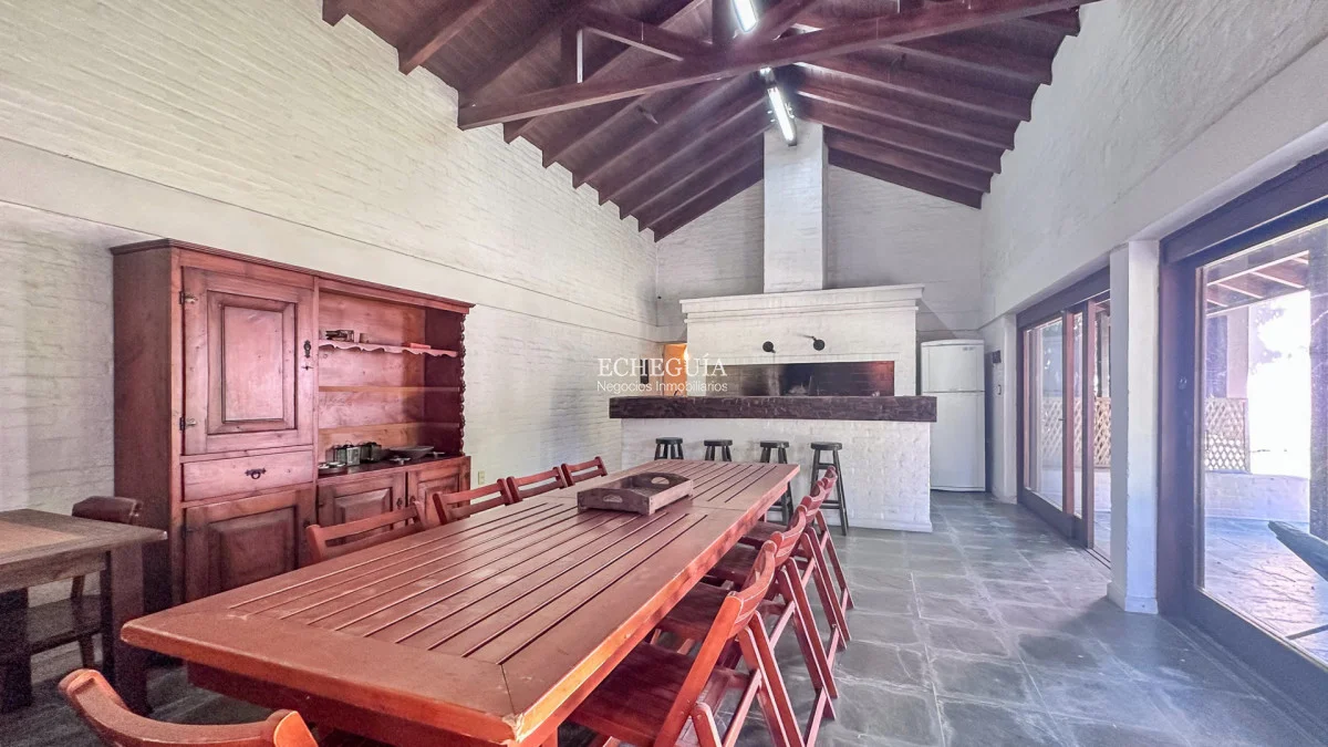 La barbacoa de gran tamaño y con estufa a leña, cuenta con parrilla, área de kitchenette, baño completo, lavadero y dormitorio de servicio y depósito.