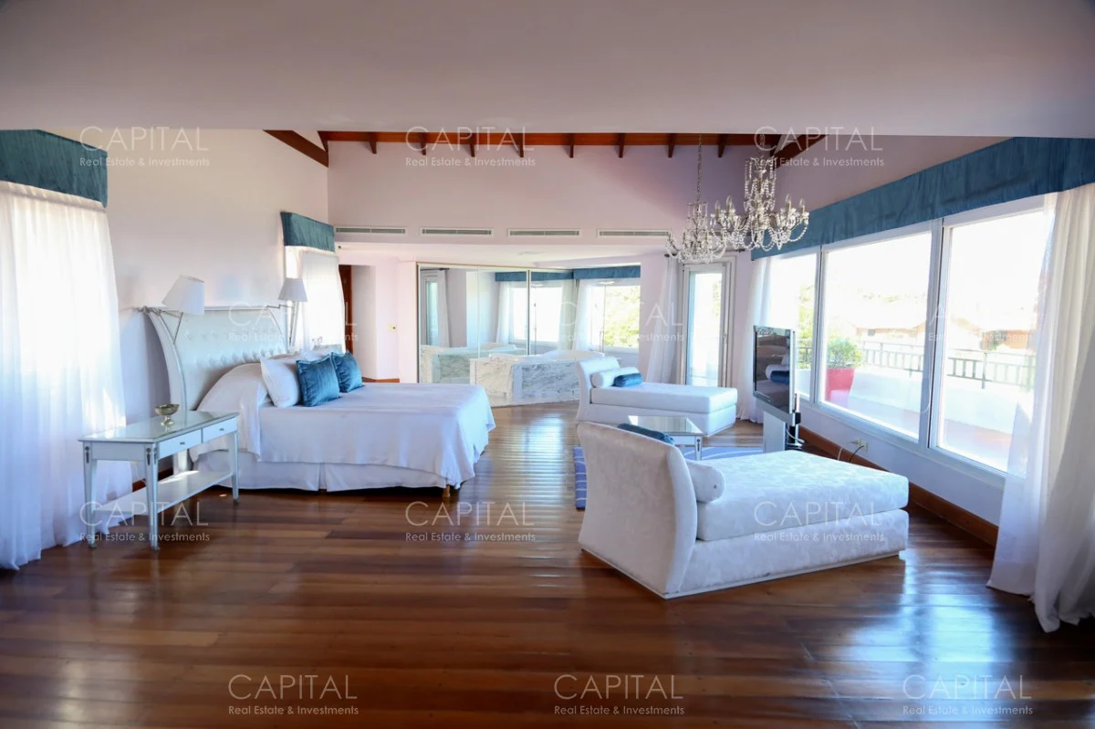 Segundo piso Maravillosa master suite de grandes dimensiones con terraza al frente y vista deslumbrante a la playa mansa e isla de gorriti. Jacuzzy con hidro masaje en la habitación. Vestidor y dos baños completos con ducha y mármol. Terraza contra frente y terraza lateral.