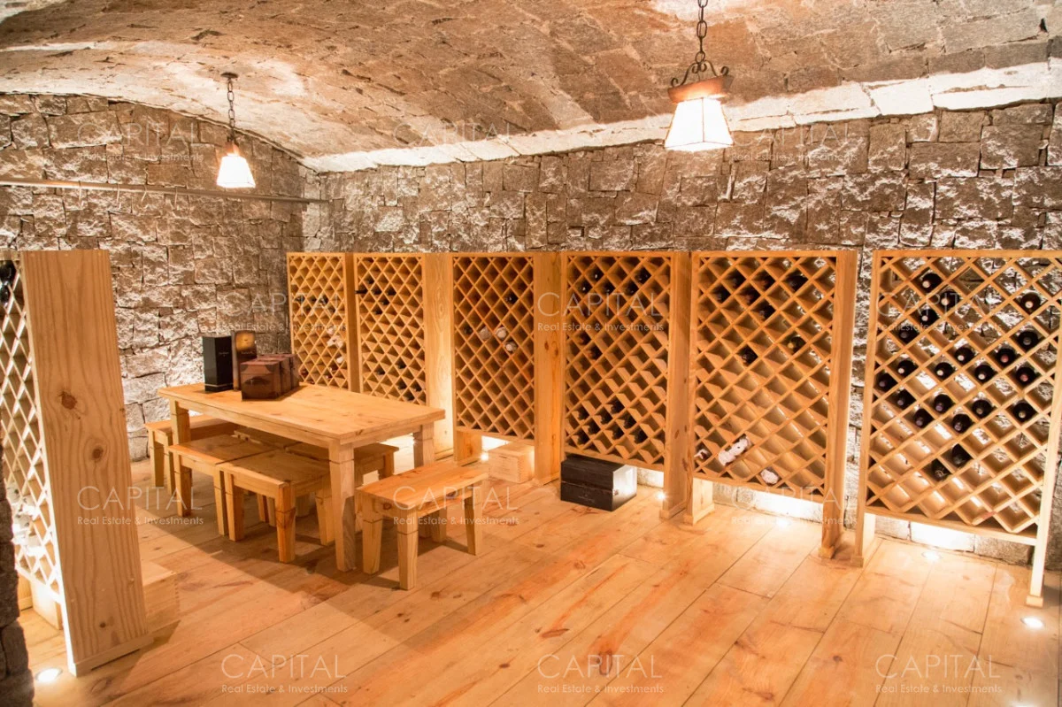 Magnífica Cava para vinos con gran capacidad forrada en piedras con espacio para mesas.