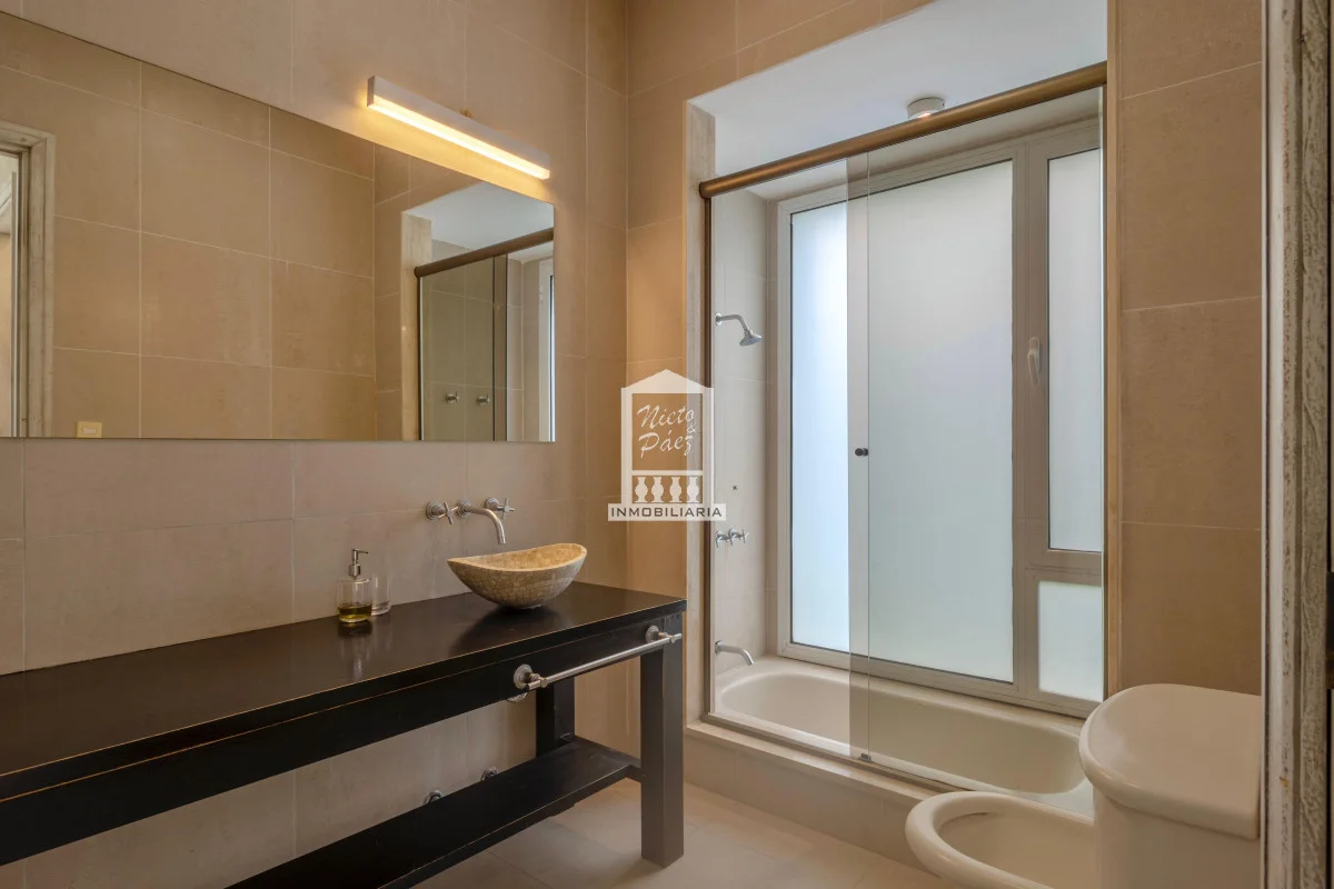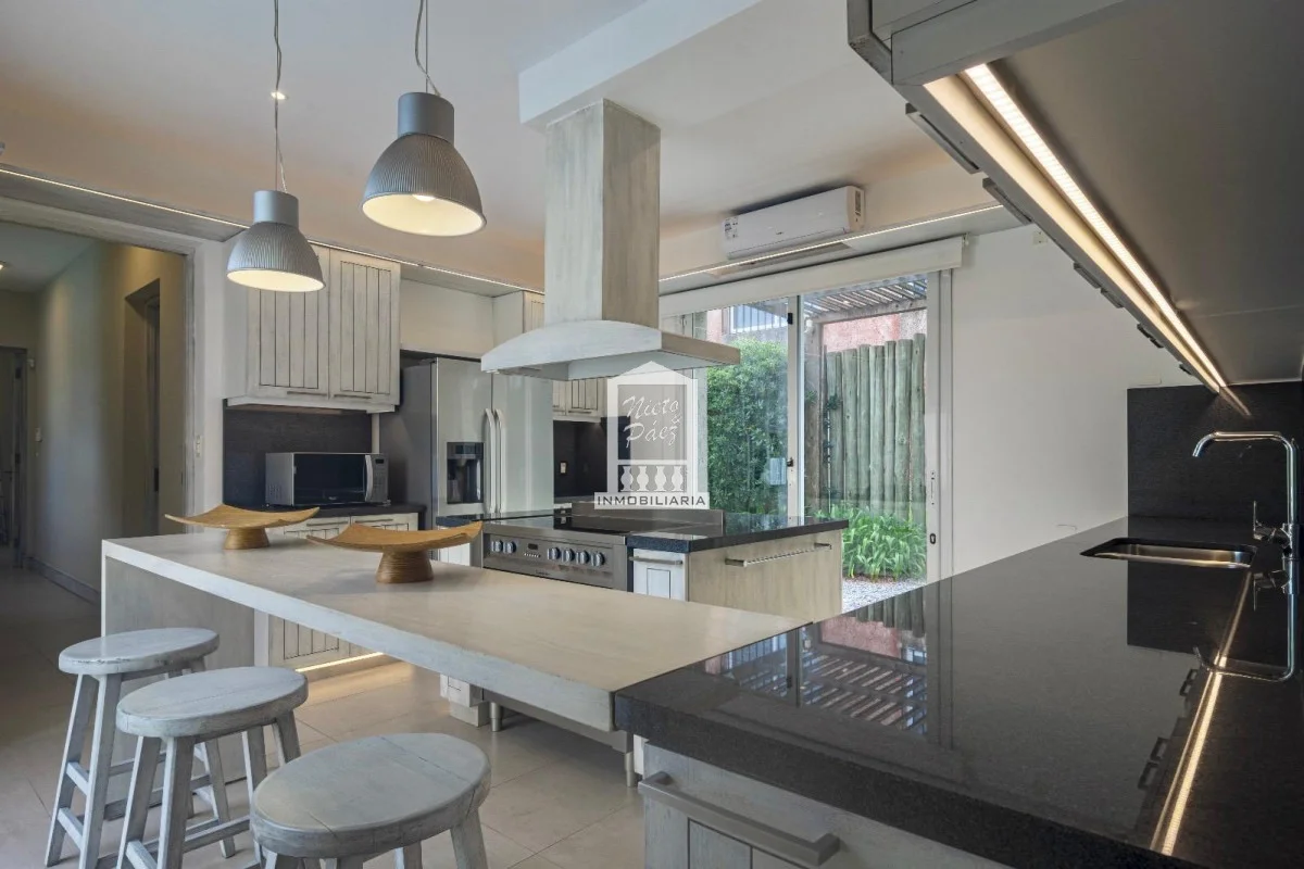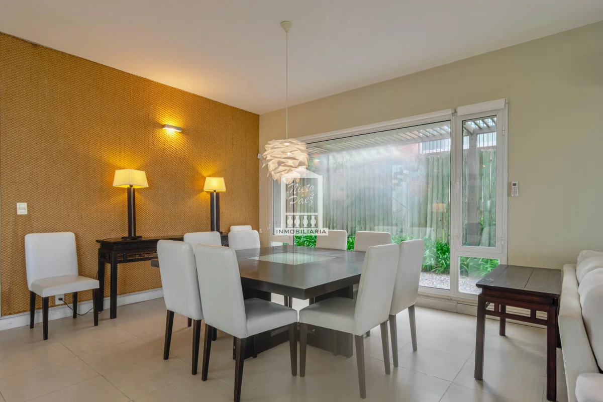 En planta baja se desarrolla un amplio estar, seguido de un living-comedor equipado con smart TV, toilette, cocina con excelente equipamiento y muy funcional. 2 dormitorios en suite con vestidor, dormitorio de huésped en suite, dependencia de servicio con baño y lavadero con lavarropas y secarropas.
