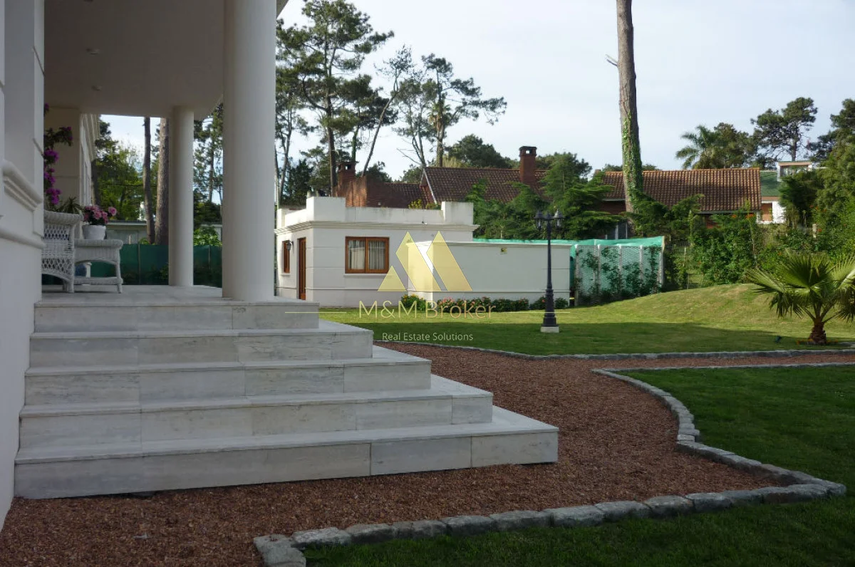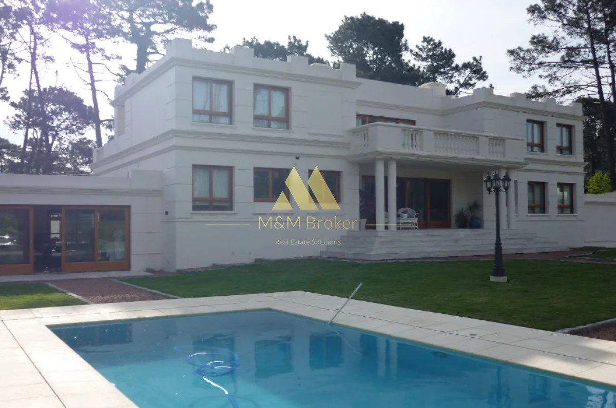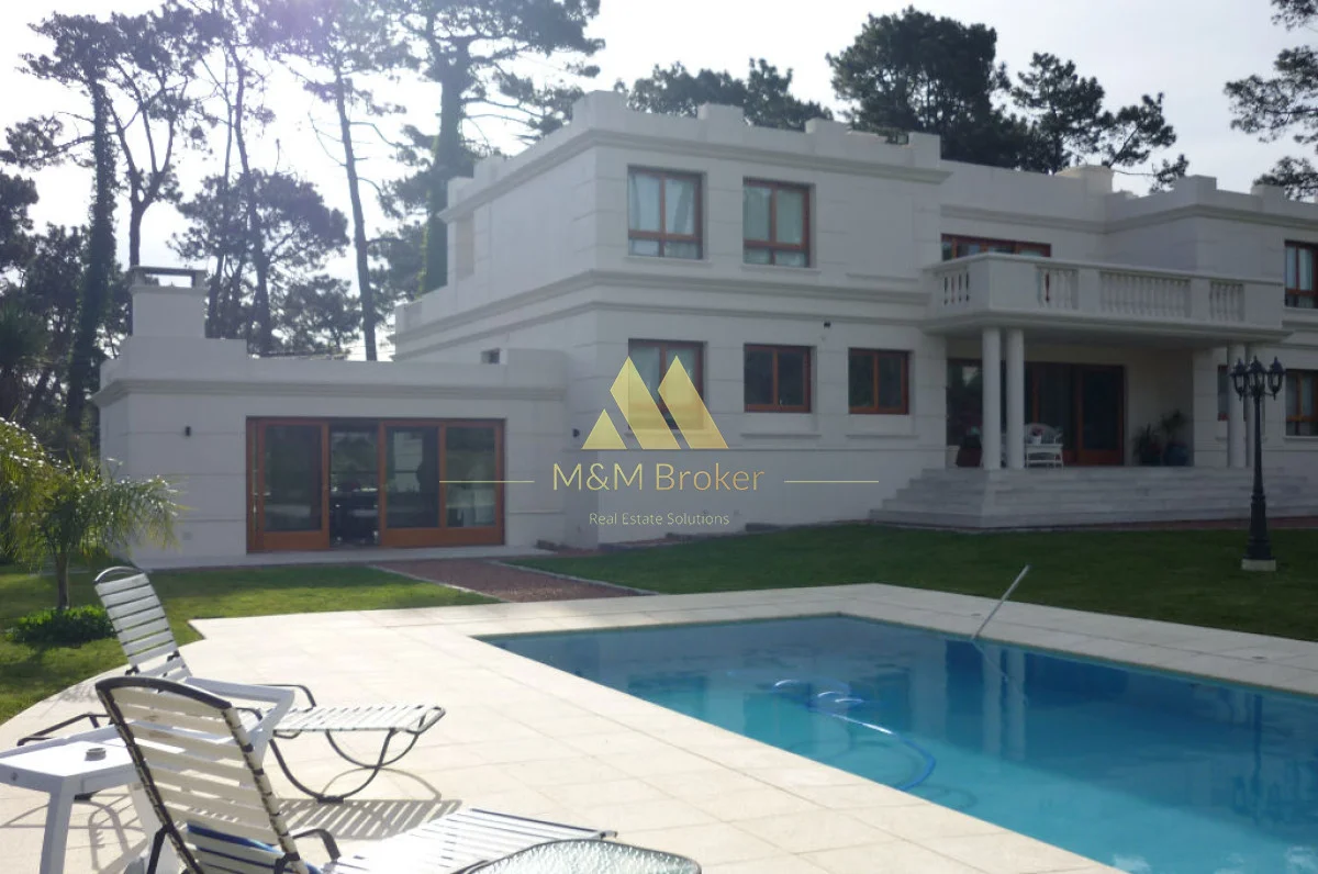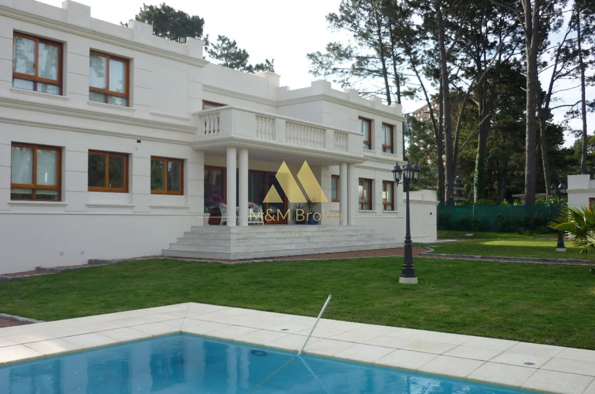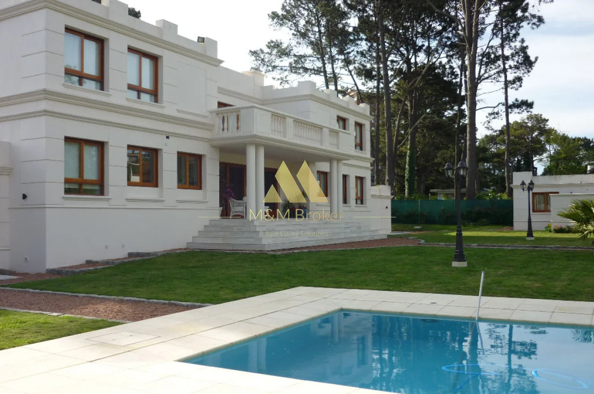 A pocas cuadras del mar, importante casa de estilo, 5 suites, gran recepcion, 2 livings, comedor, cocina, amplia barbacoa con cava, piscina climatizada, sauna, doble garage, casa de caseros y lavadero.