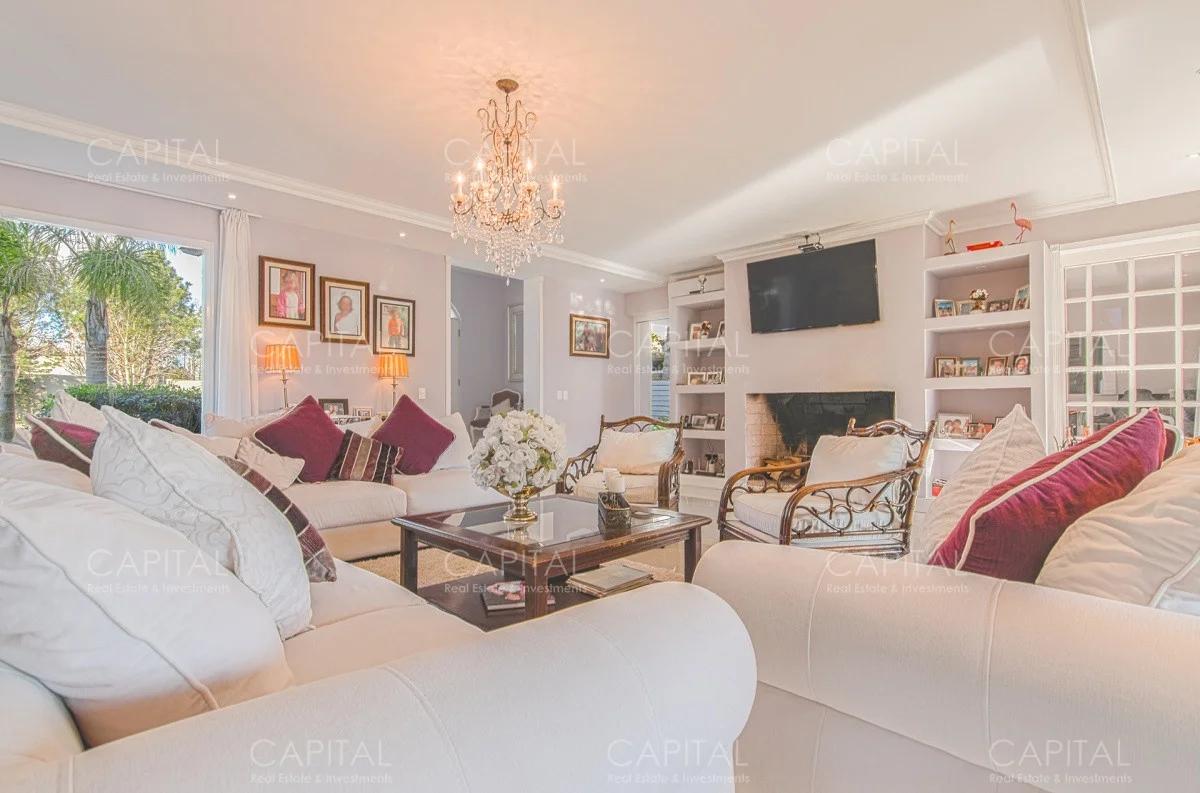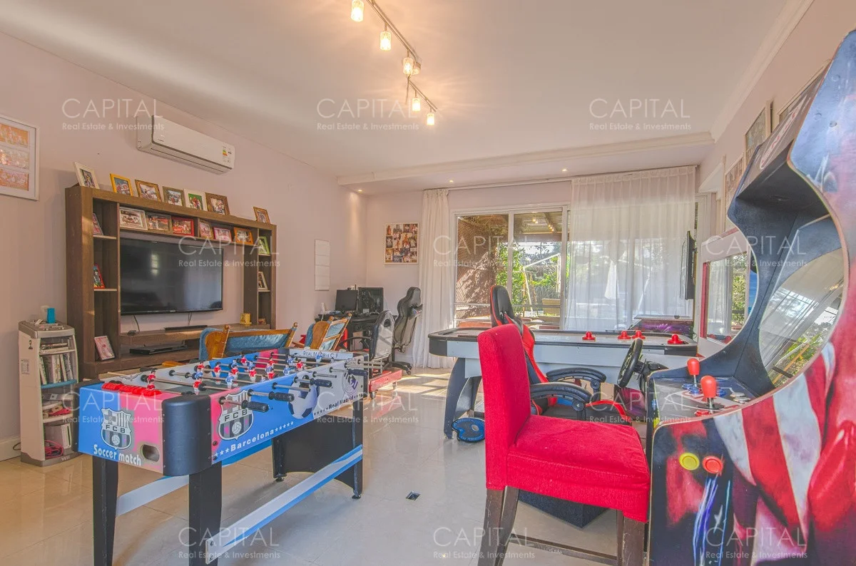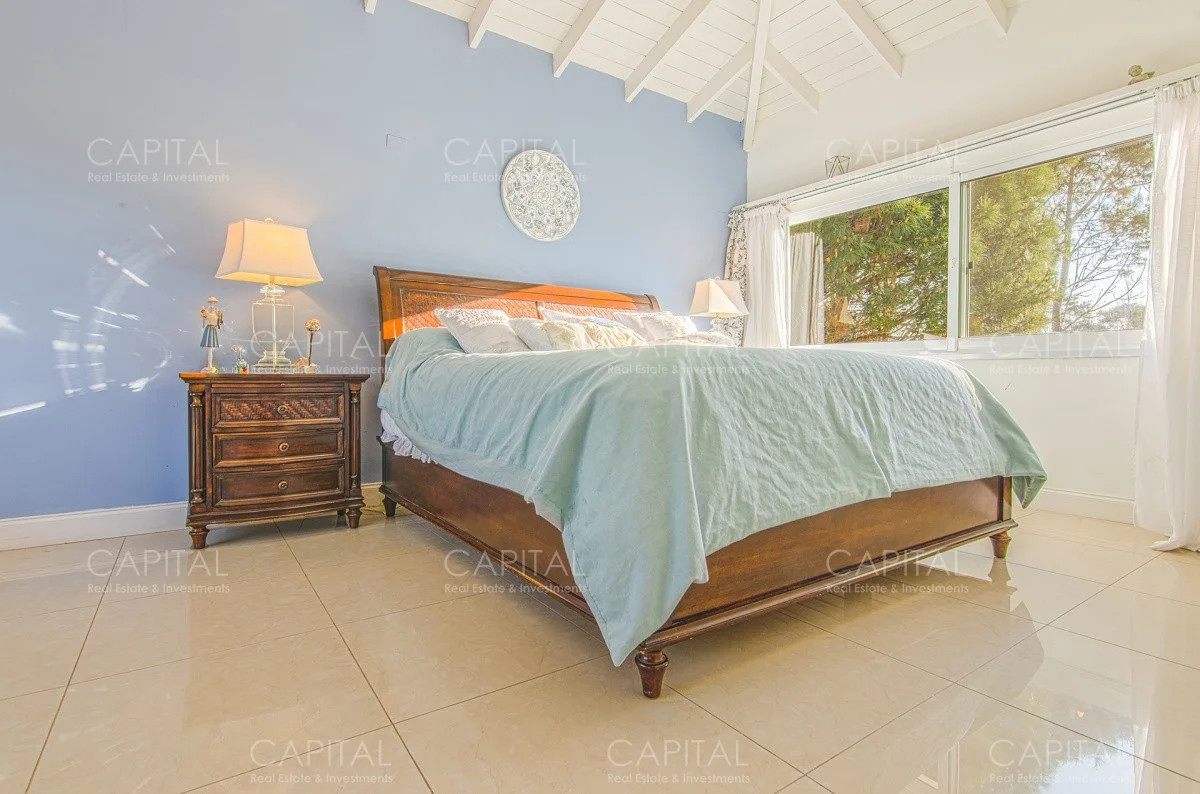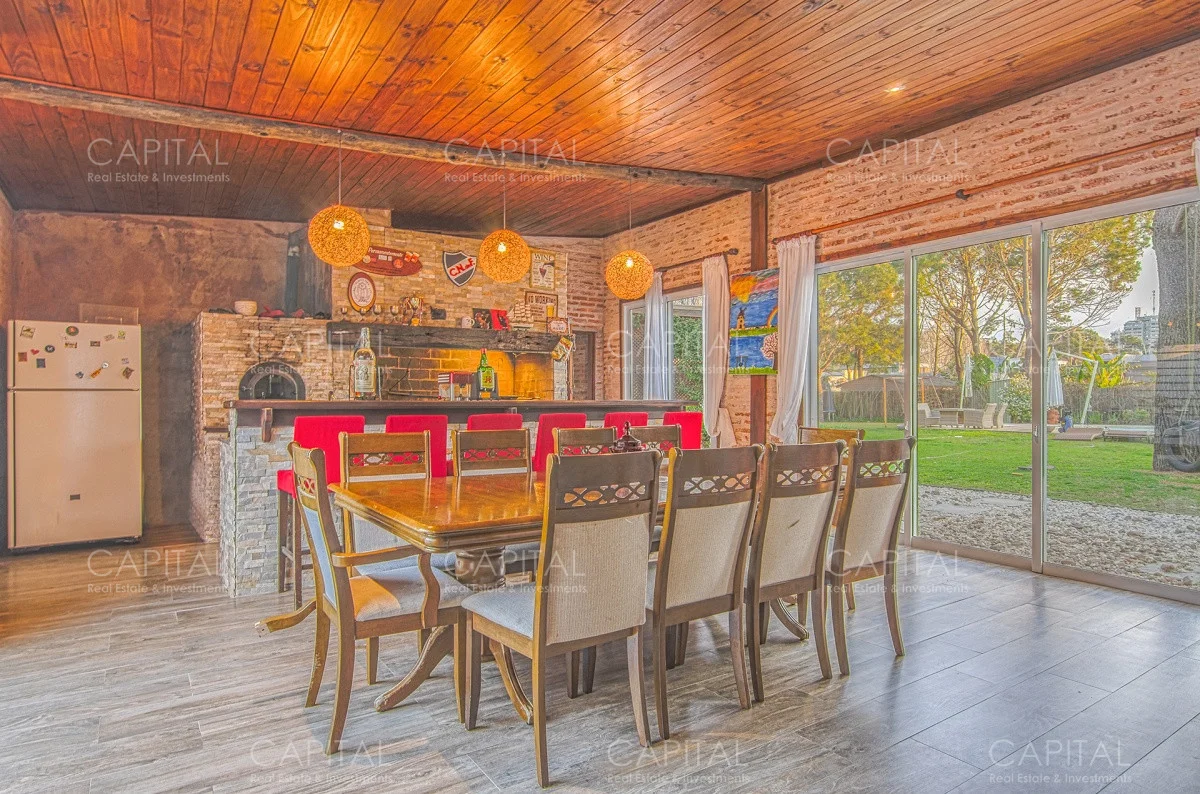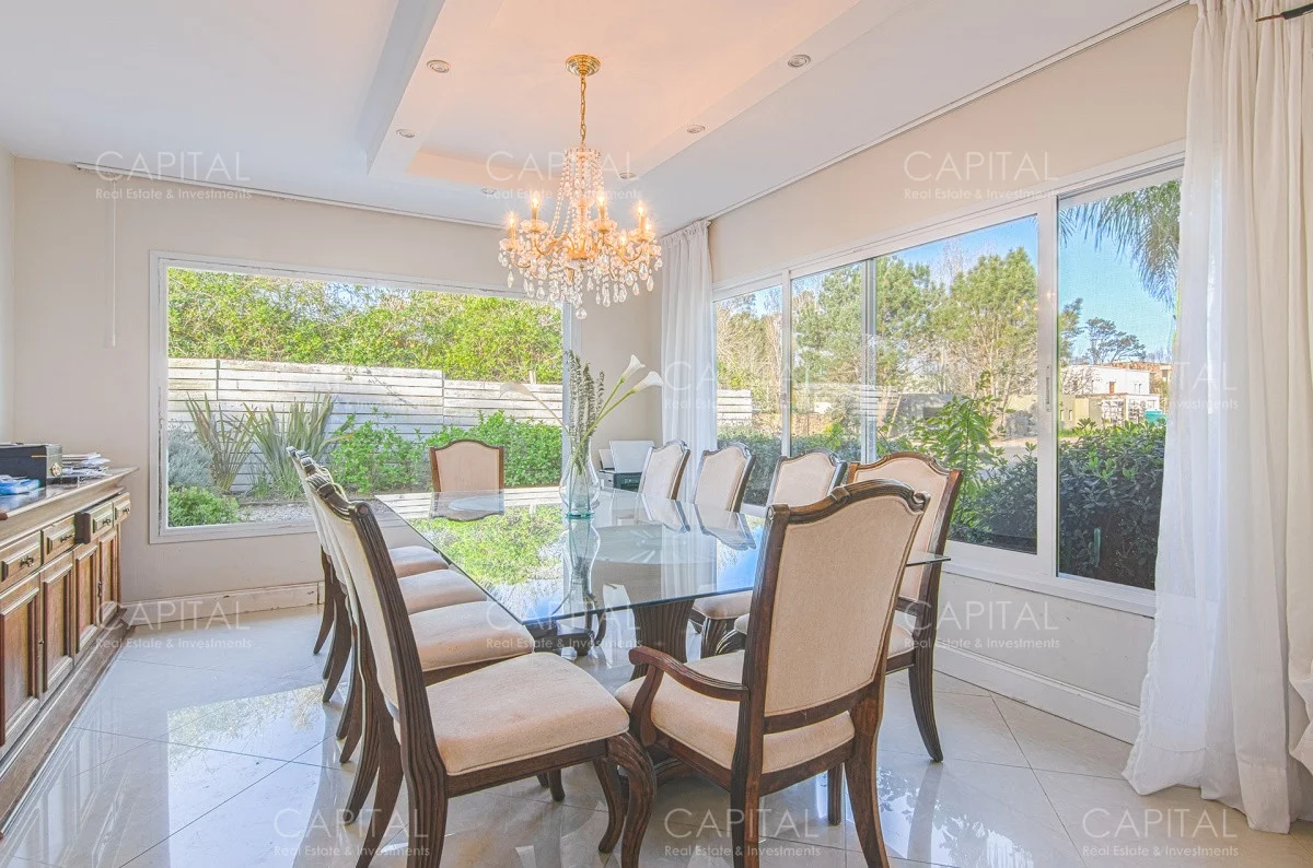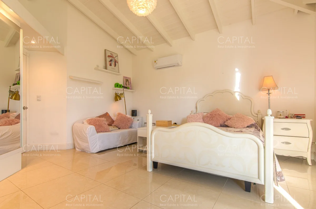 Casa en Venta en Barrio Privado de Punta del Este Tiene 5 dormitorios, 4 de ellos en suite con vestidores todos, 5 baños, 3 de ellos con bañeras y ducha Living de 80 m más sala de juegos separado, comedor separado, Cocina amplia Parrillero de 100 m Pérgola de70 m Piscina de 11x4.5 Lavadero Todas las habitaciones con aire Estufa a leña en el living Televisión en todos los ambientes Cuenta con 5 Dormitorios 5 Baños 5 Suites Cocina : Amplia, Living Comedor Terreno : 1491 m2 Edificado : 500 m2 Consulte con nuestros asesores. Referencia Interna : Tera-31695