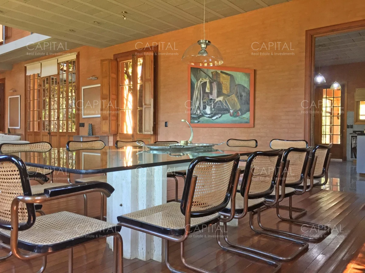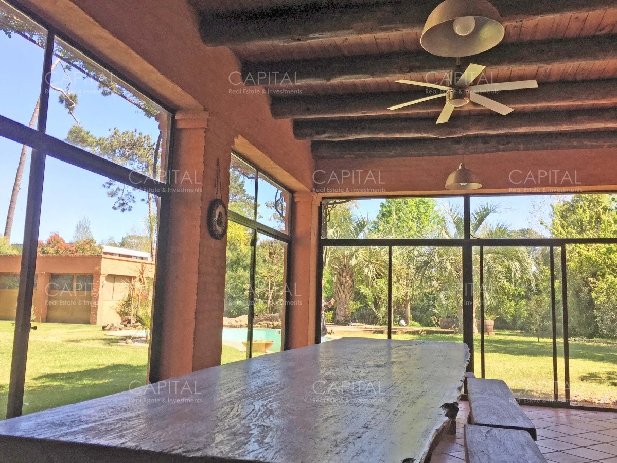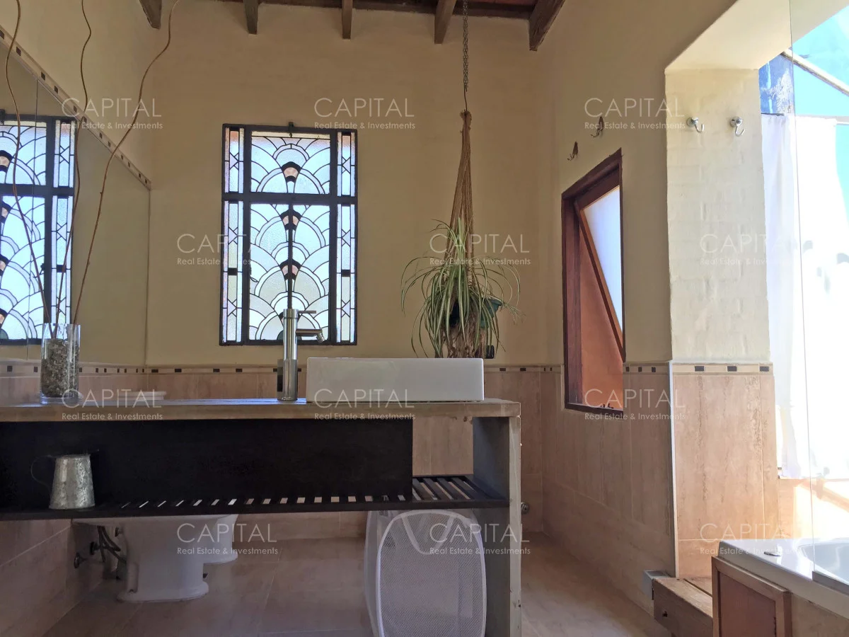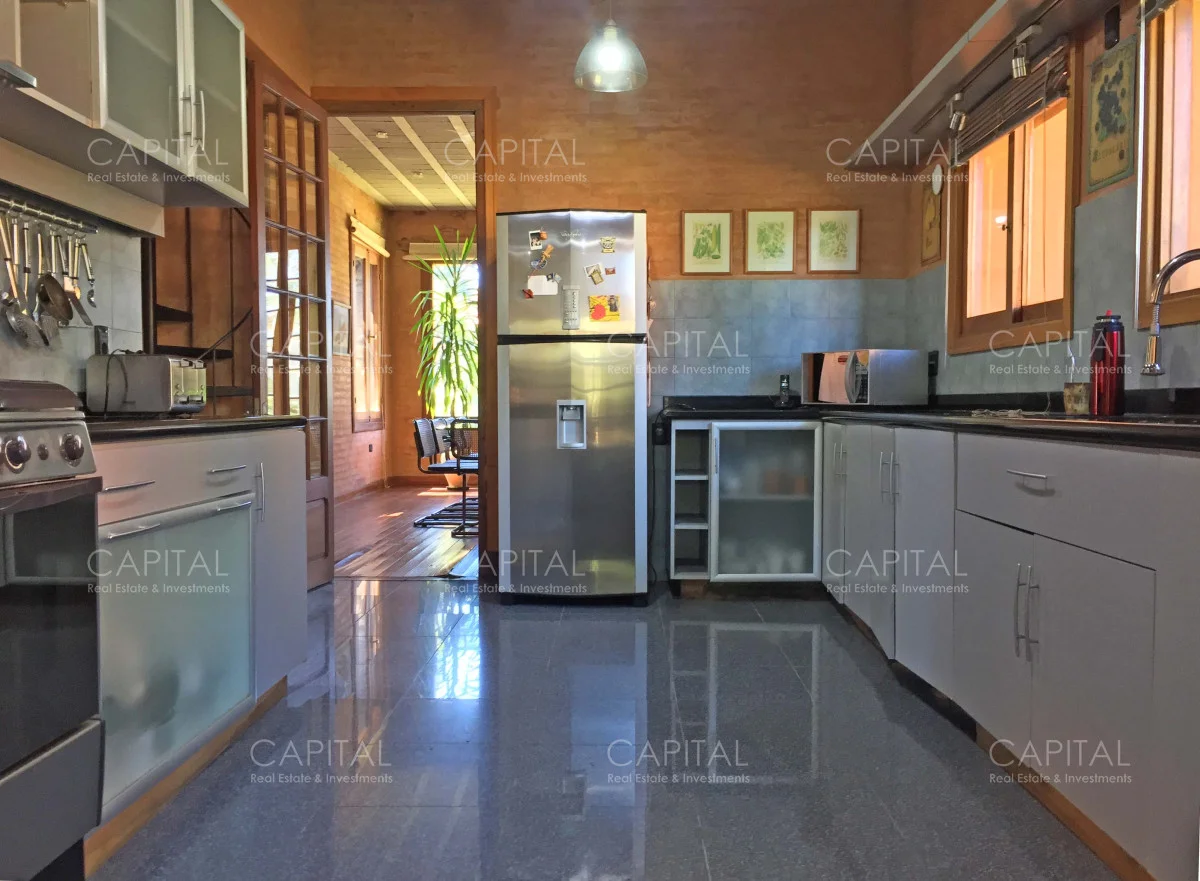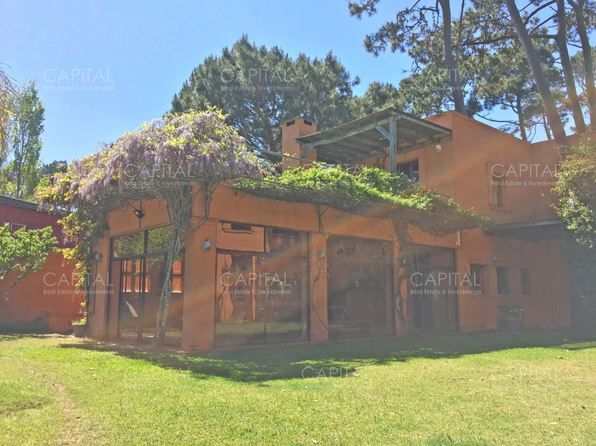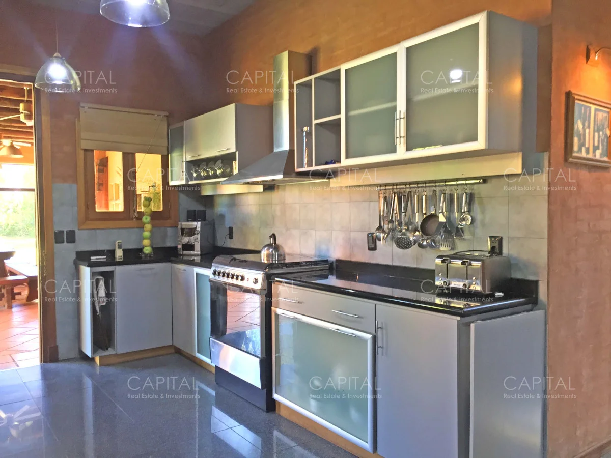 El jardín tiene pileta y casa de caseros completamente independiente, con dormitorio, baño y kitchenette.