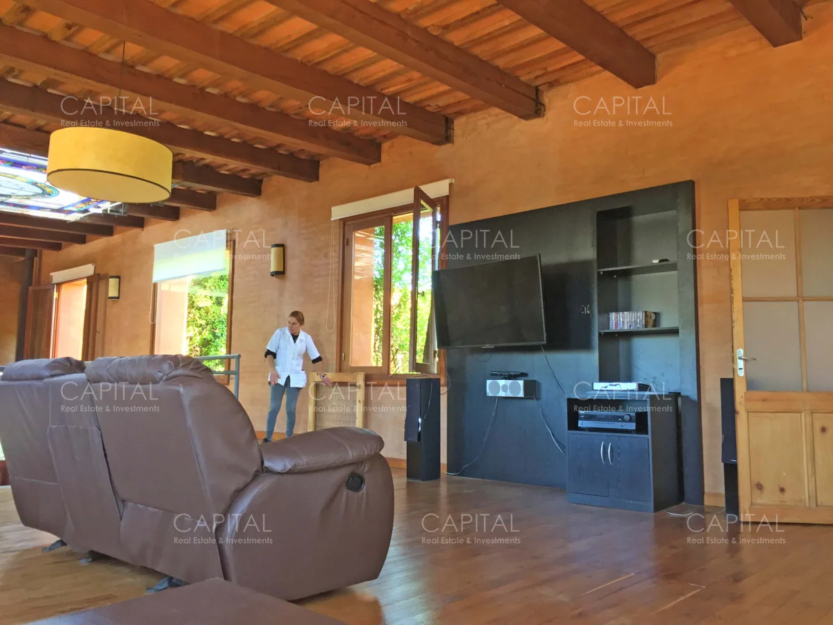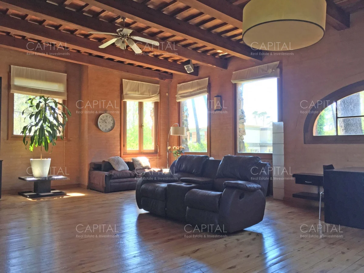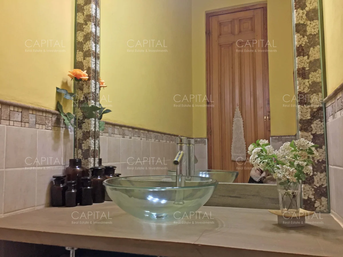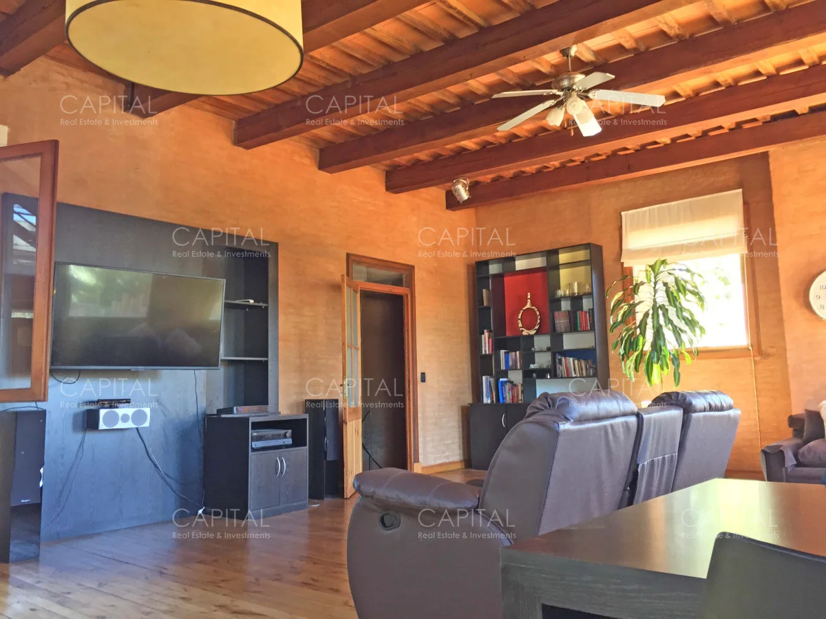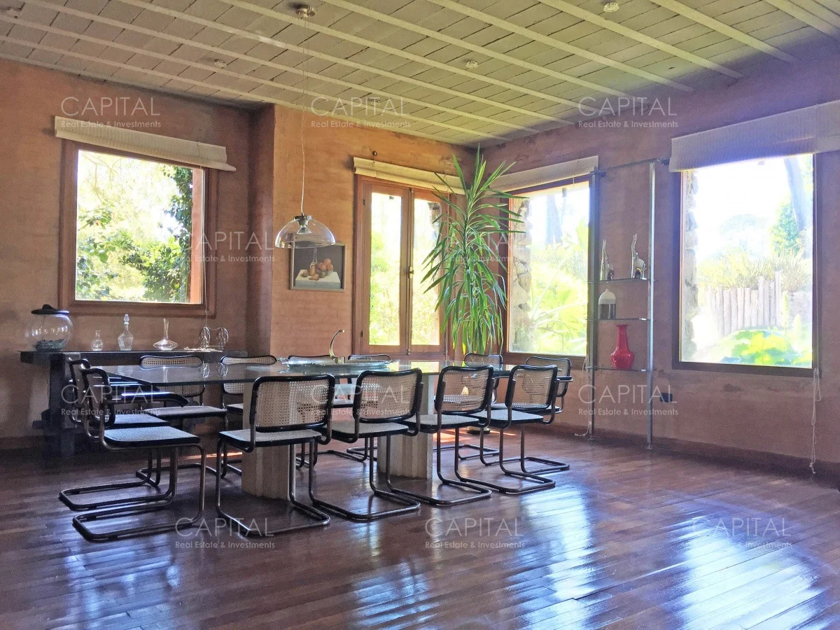 El jardín tiene pileta y casa de caseros completamente independiente, con dormitorio, baño y kitchenette.