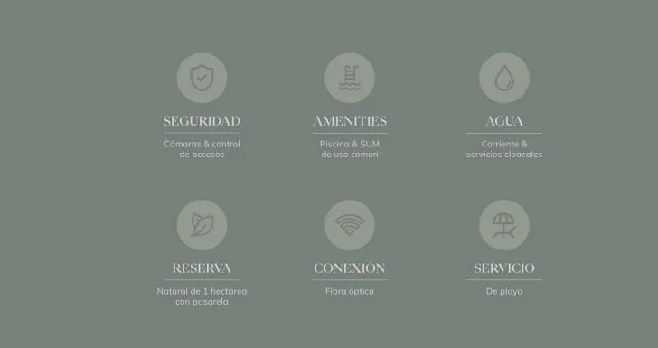 Servicios y comodidades: seguridad 24 hs, piscina, SUM, agua corriente, saneamiento, fibra óptica y exclusivo servicio de playa.