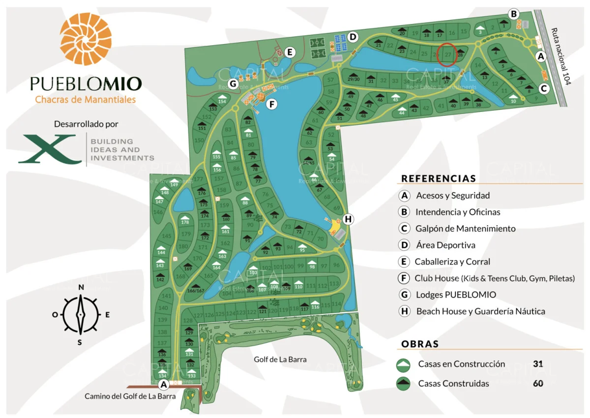 Barrio privado, exclusivo por ubicación y seguridad. Vistas panorámicas a los lagos y sierras. A 5 km de Manantiales. Sobre una superficie total de 159 hectáreas, PUEBLO MIO Chacras de Manantiales ofrece 180 lotes de 4000 m2 cada uno, con ochenta y seis hectáreas de espacios comunes que tienen como principal atractivo treinta hectáreas repartidas en nueve lagunas que atraviesan el centro del emprendimiento. PUEBLO MIO ofrece un estilo de vida diferente, con lo mejor de los dos mundos: vivir en una exclusiva comunidad con todos los servicios, dentro de un marco de grandes espacios naturales y con la mejor oferta de playas y vida social de Punta del Este