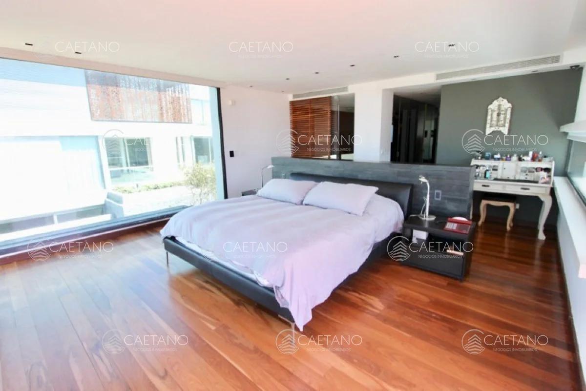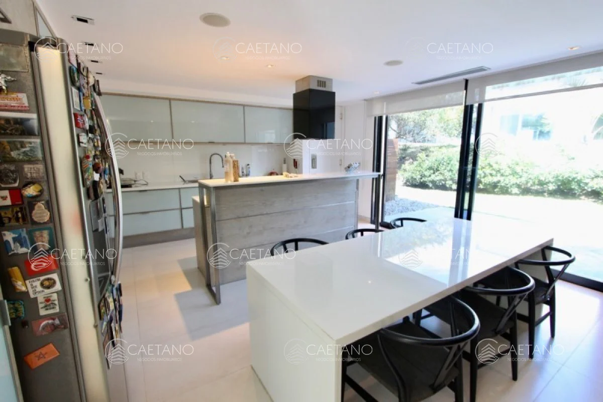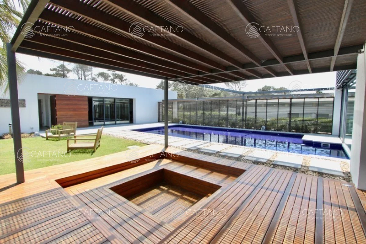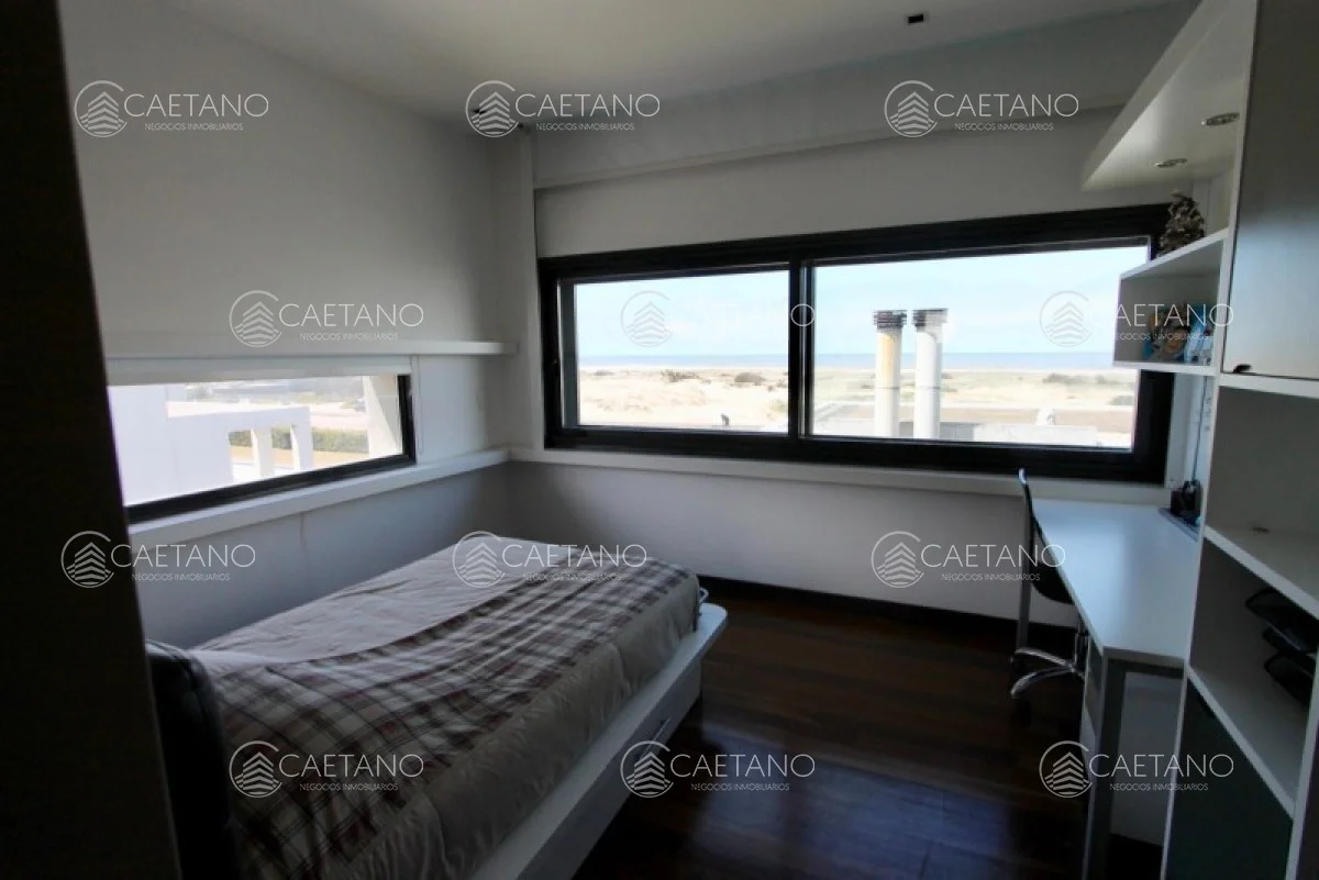 Ubicada en primera línea al mar en Laguna Blanca. Diseño moderno con terreno muy bien aprovechado, vistas abiertas a la playa y seguridad. Cuenta con amplio living comedor con chimenea, toilette y cocina con comedor diario. Suite principal con terraza, vestidor y jacuzzi, y 2 suites más playroom. Subsuelo con cava de vinos, dormitorio con baño y proyector para cine. Barbacoa cerrada con parrillero y pileta climatizada. Salida al jardín con chill out y pileta exterior. Área de servicio con lavadero, dependencia de servicio con cucheta, baño completo y garaje para 2 autos. Jardín que rodea toda la casa. Sistema de domótica integrada, alarma y cámaras.