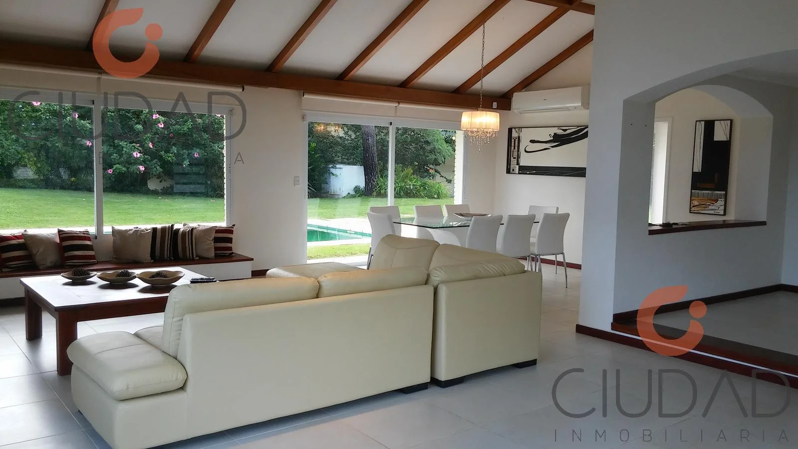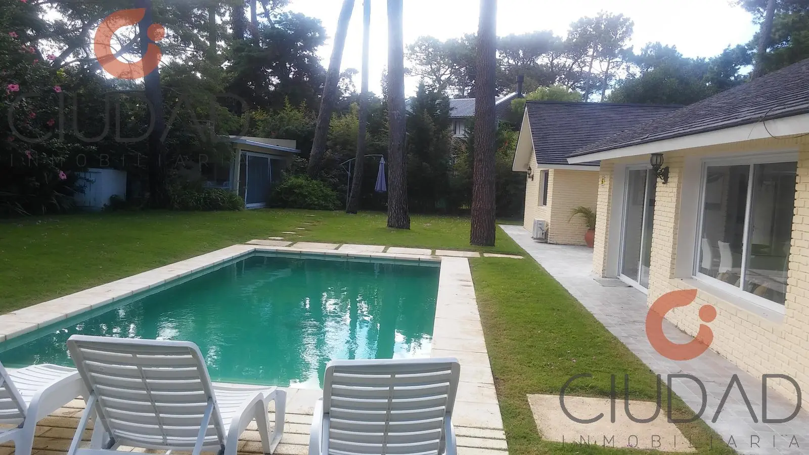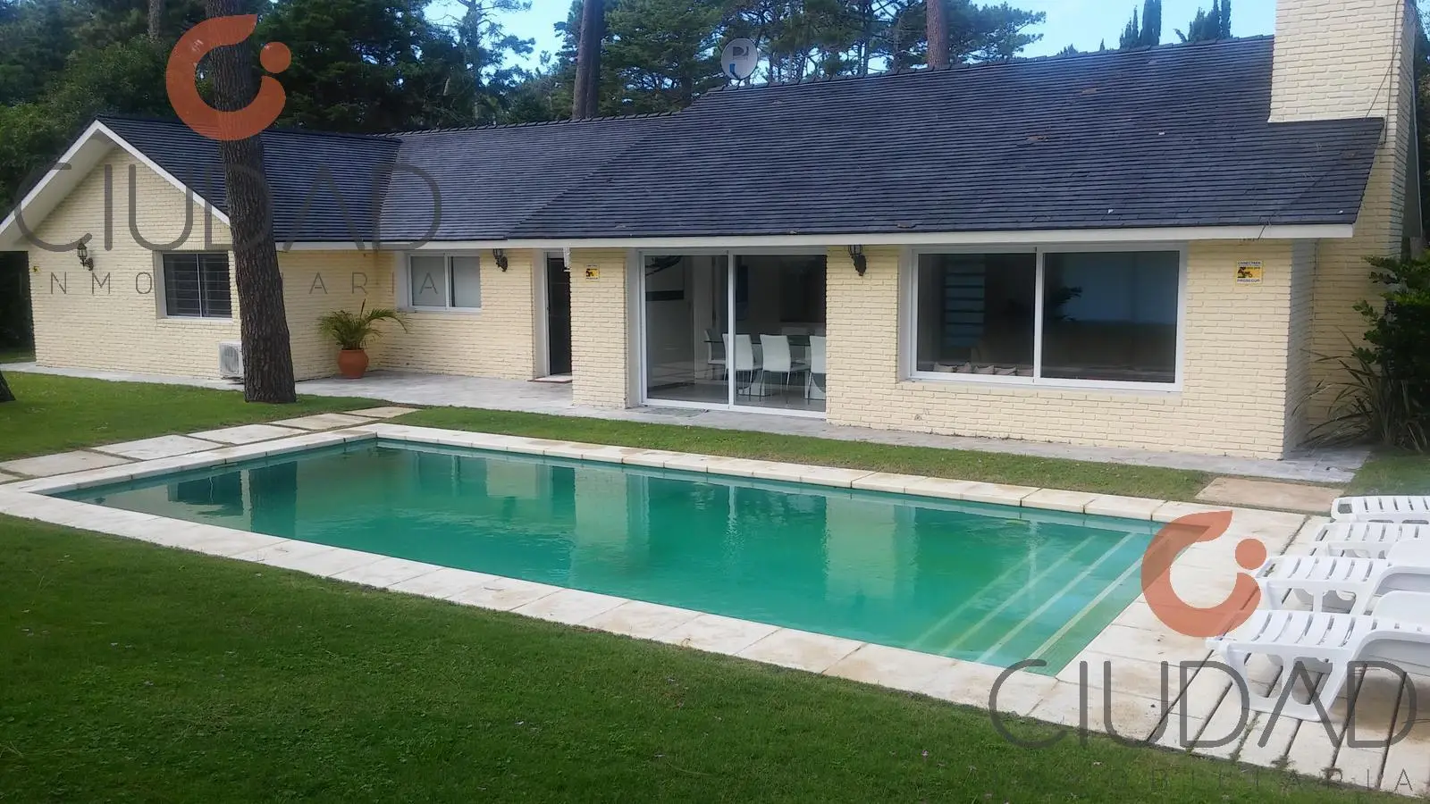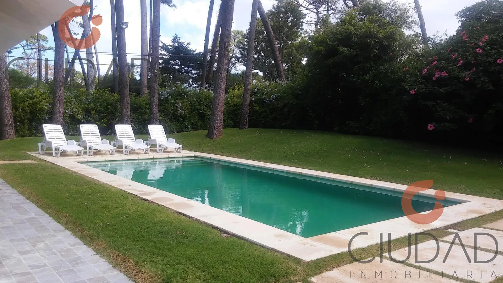 Elegante y luminosa casa amueblada en Playa Mansa, con piscina climatizada, rodeada de verde.