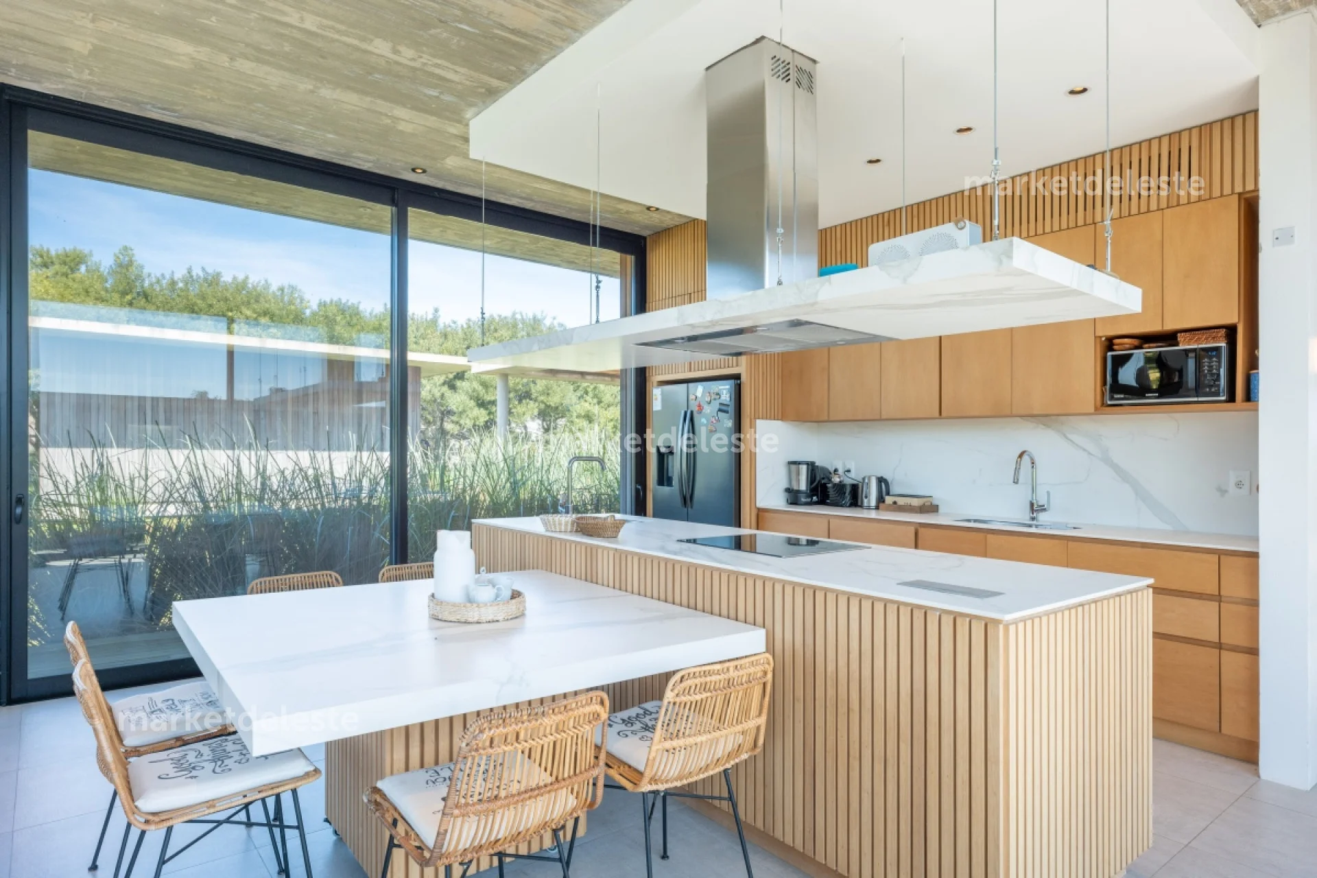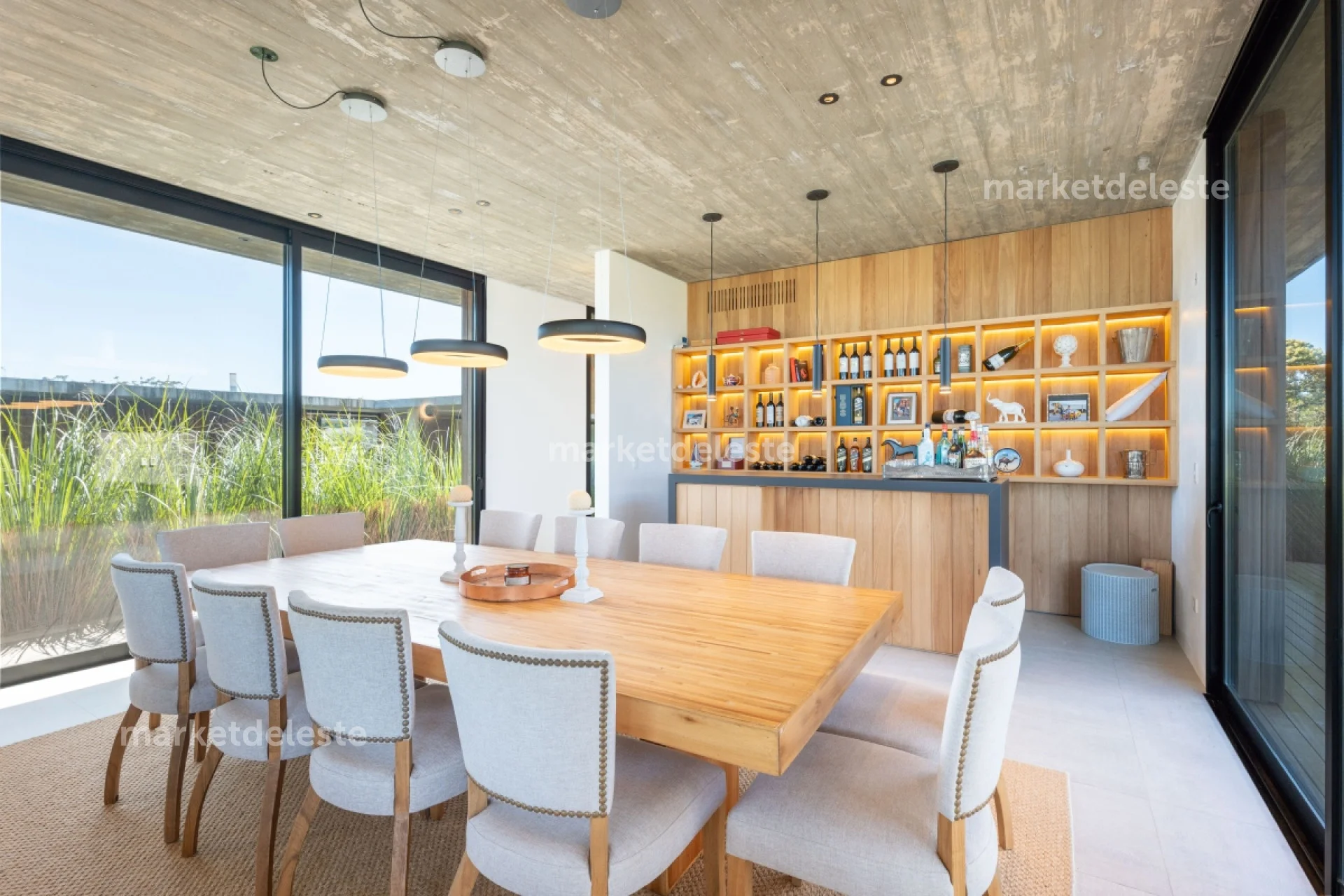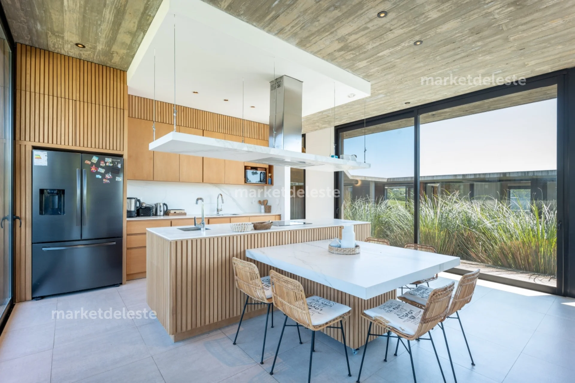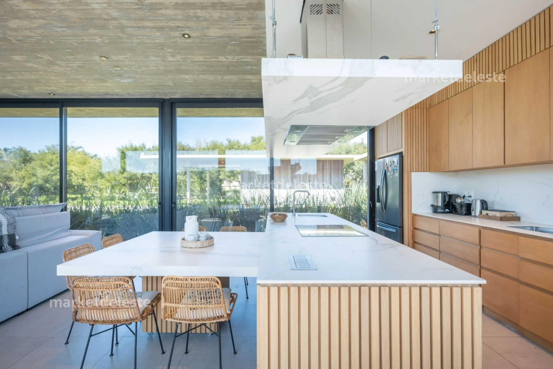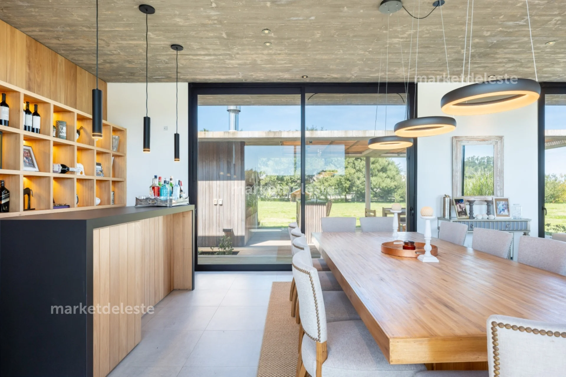 Imagínese preparando una cena gourmet en la grandiosa y luminosa cocina con comedor diario y sala de estar con electrodomésticos de última generación y acabados de alta calidad. El espacio abierto fluye sin esfuerzo hacia un amplio living comedor con estufa a leña y barra para recibir amigos, desde este espacio espectaculares vistas a la piscina y jardin.