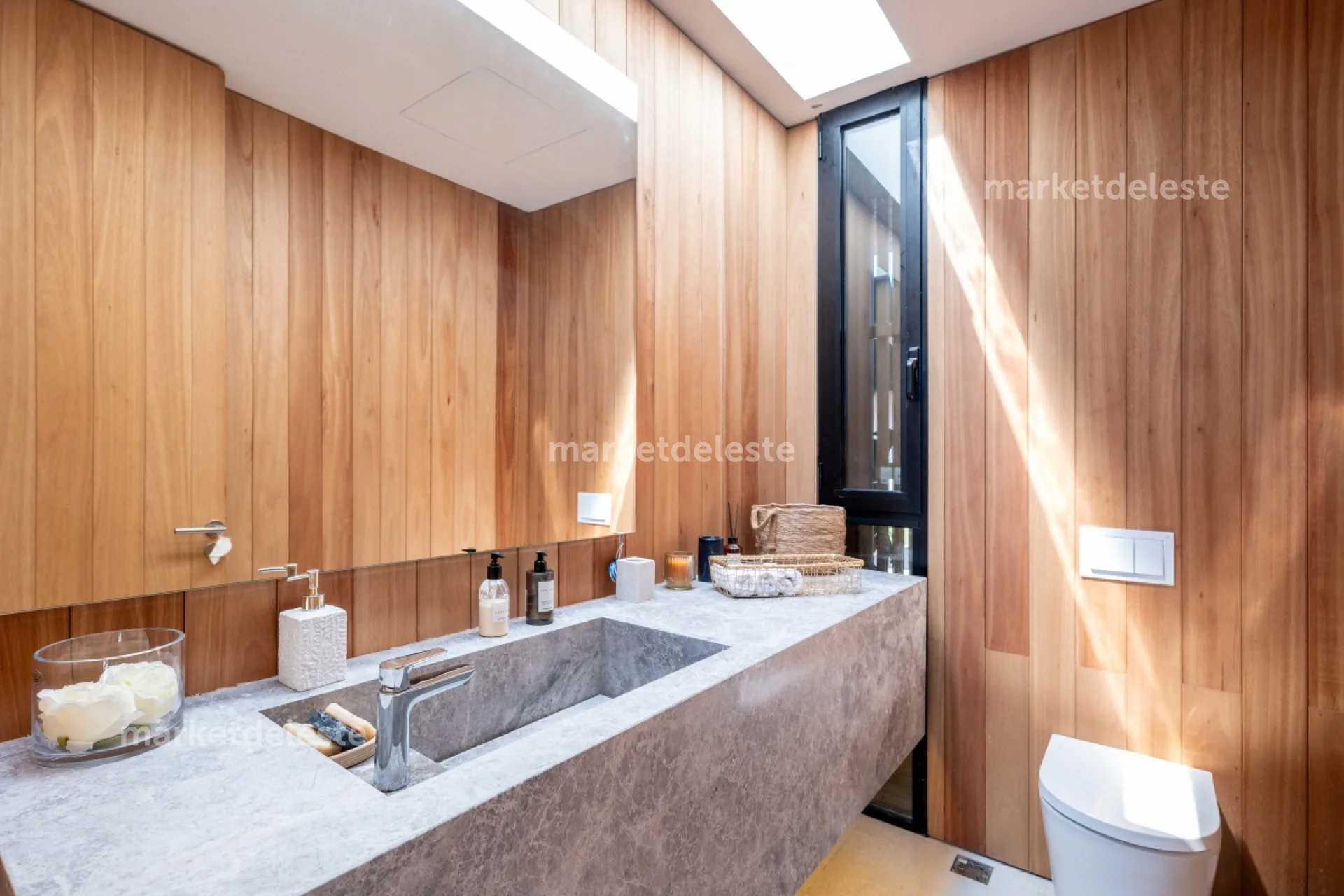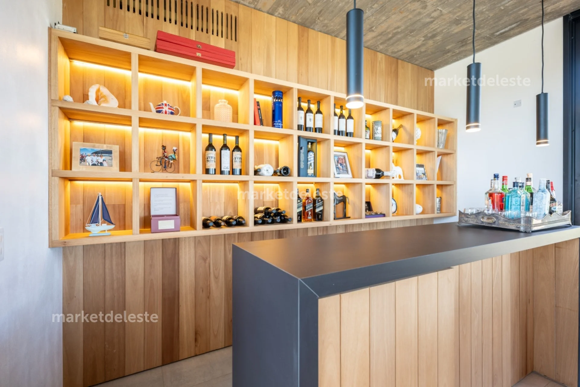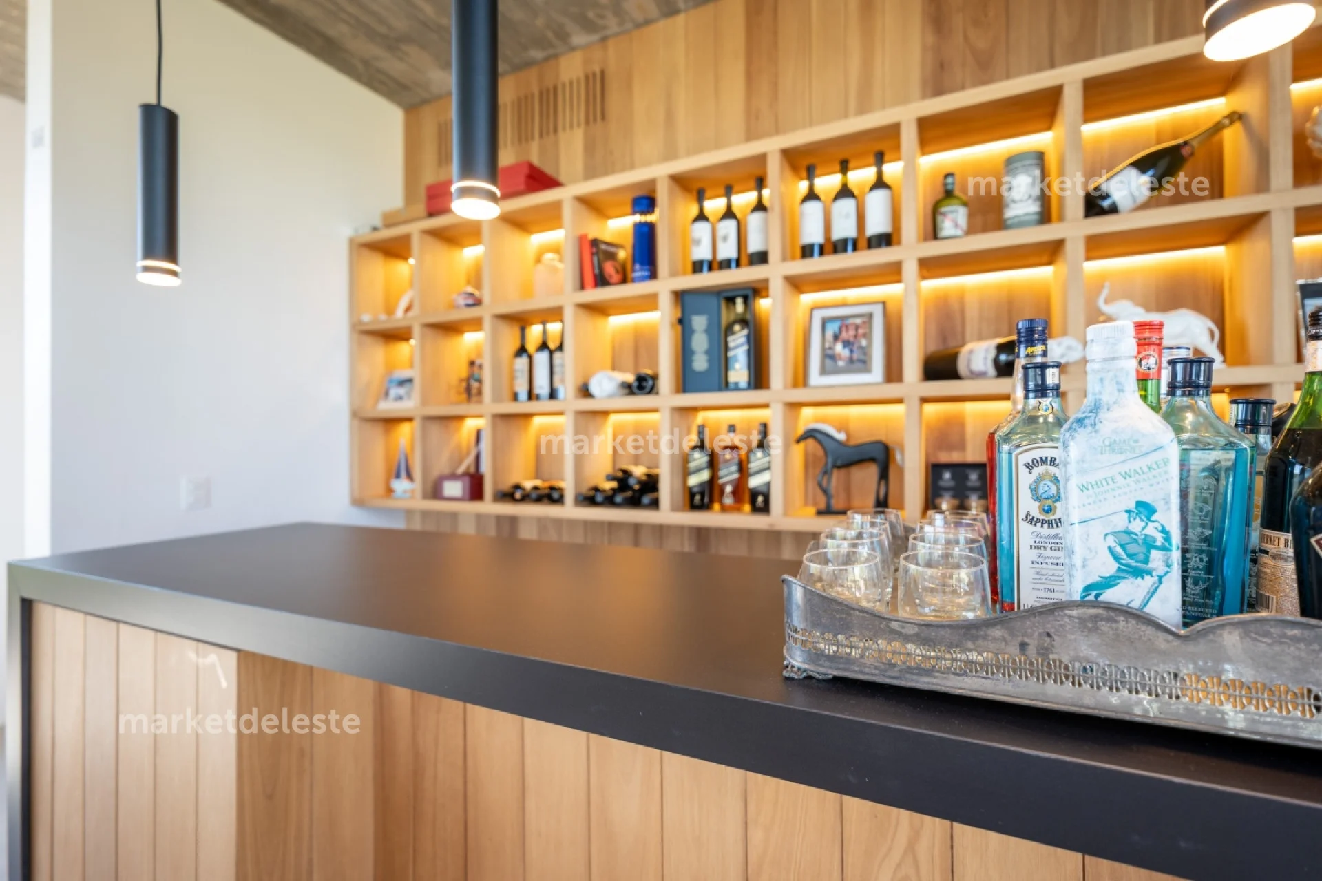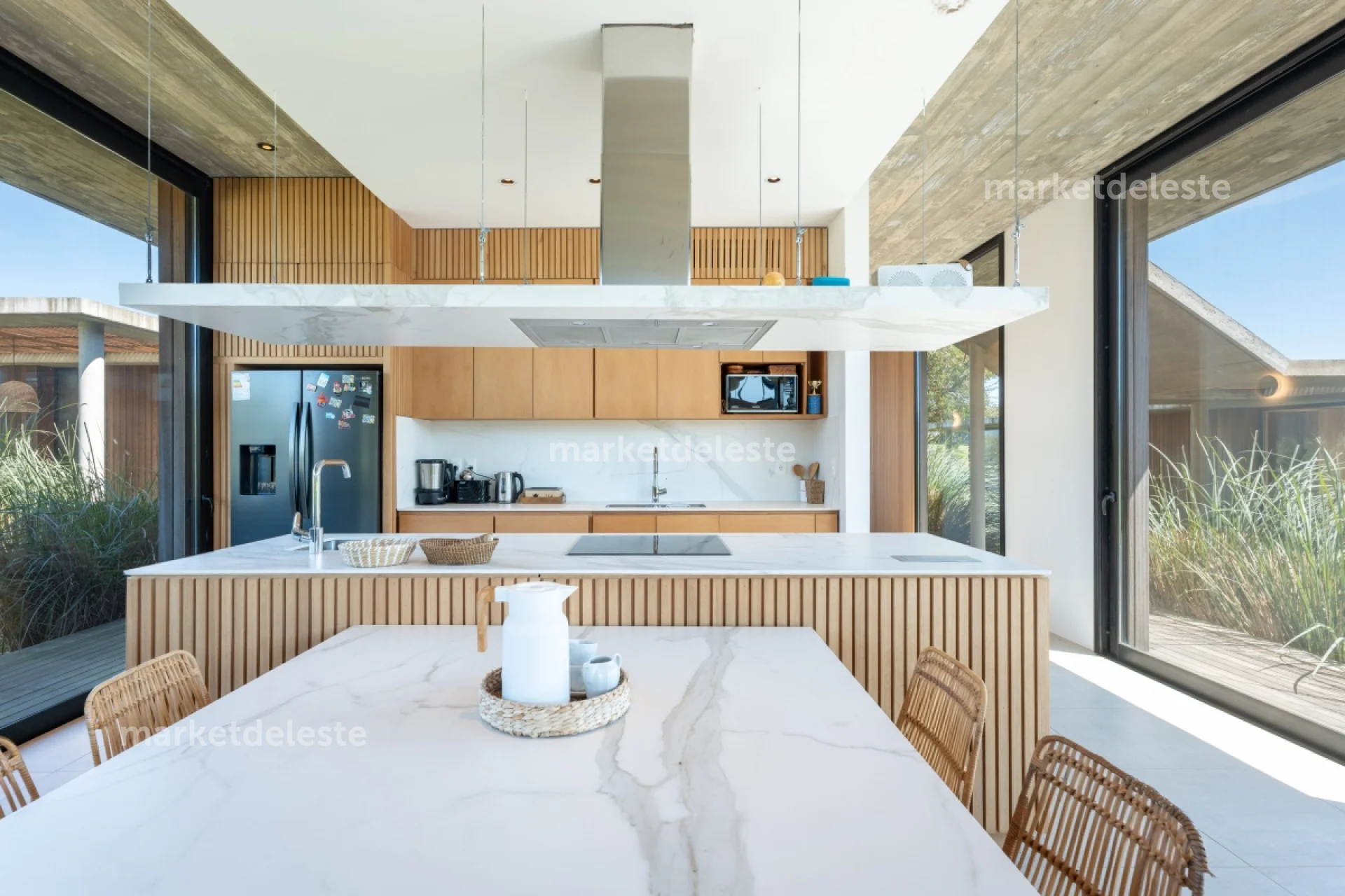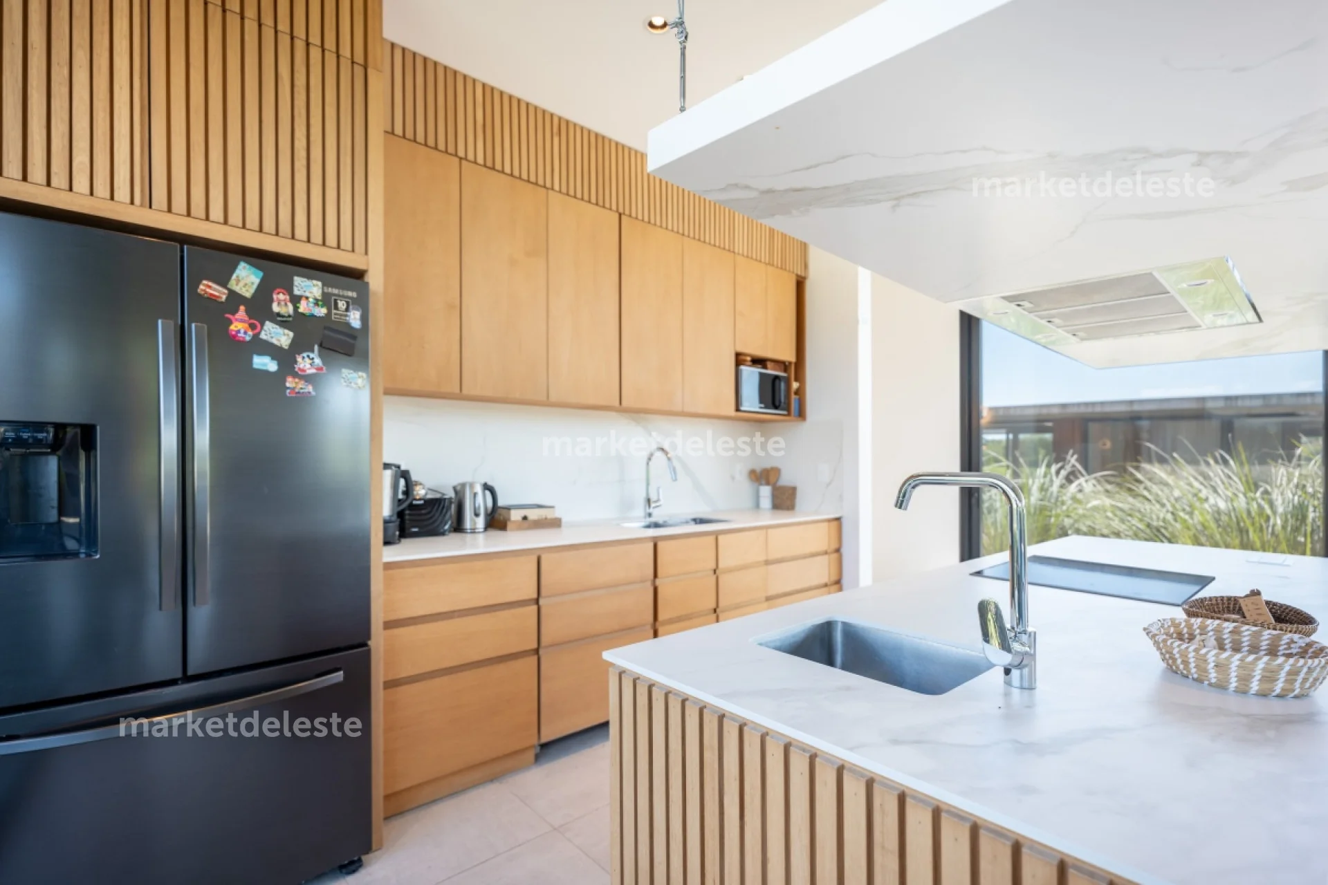 Imagínese preparando una cena gourmet en la grandiosa y luminosa cocina con comedor diario y sala de estar con electrodomésticos de última generación y acabados de alta calidad. El espacio abierto fluye sin esfuerzo hacia un amplio living comedor con estufa a leña y barra para recibir amigos, desde este espacio espectaculares vistas a la piscina y jardin.