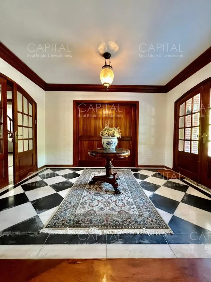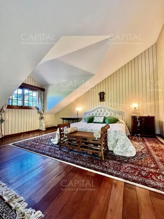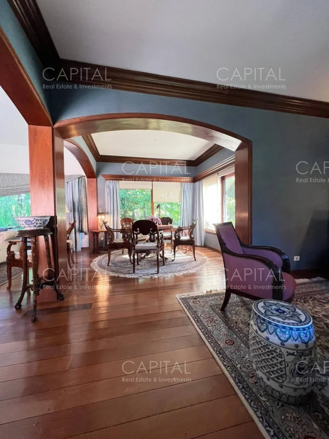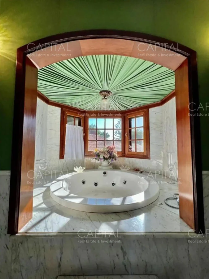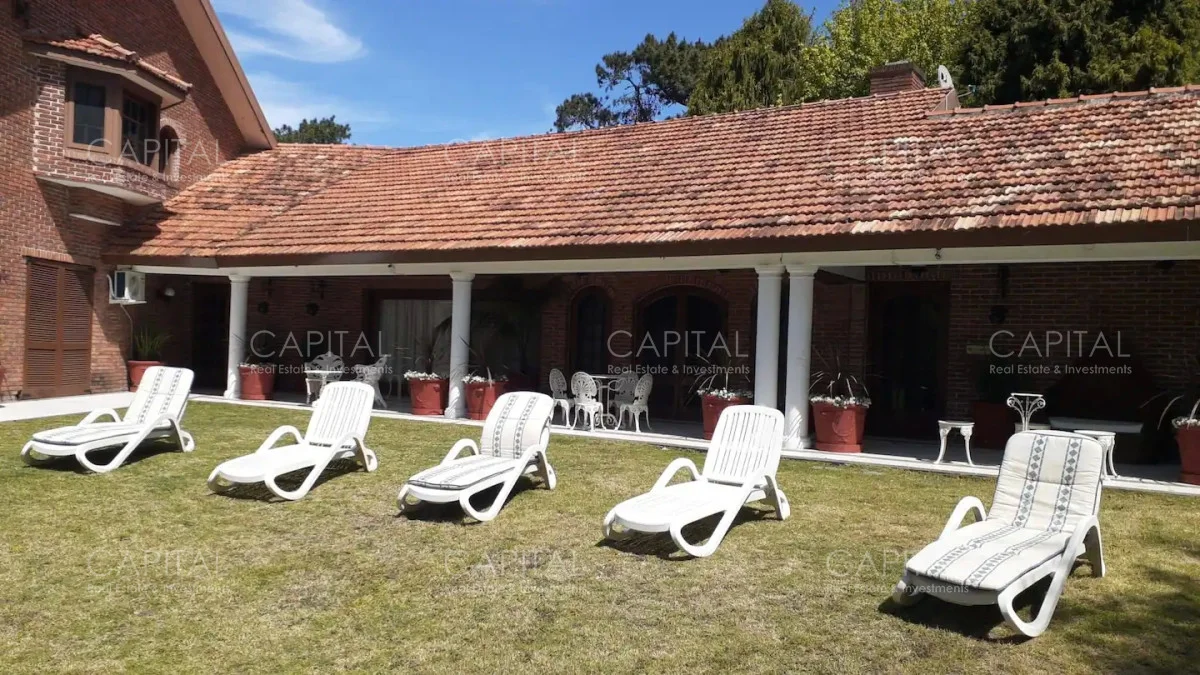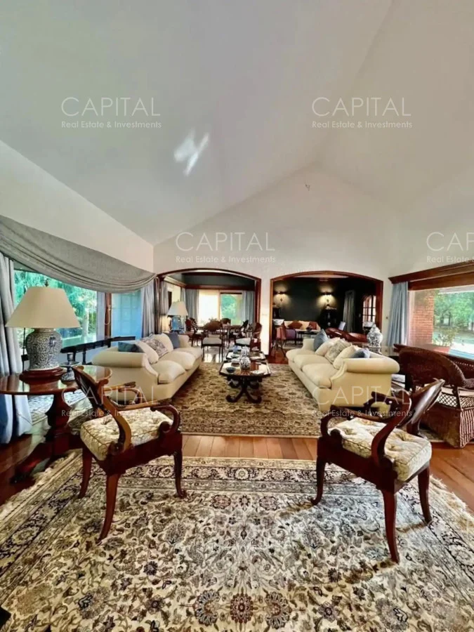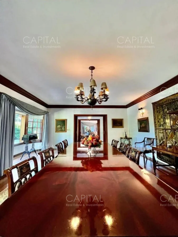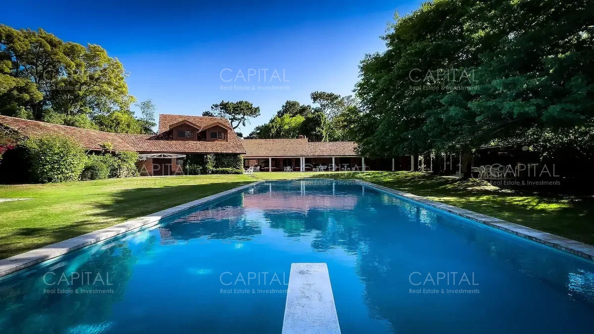 La casa cuenta con un recibidor, amplio living con techos altos, distintos estar para poder disfrutar de la vista al jardín, amplio comedor, salón de eventos, doce dormitorios en suite, toilet, dependencia de servicio, parrillero, amplio jardín trasero rodeado de verde añadiendo privacidad a la propiedad, piscina olímpica con sombrillones y camastros.