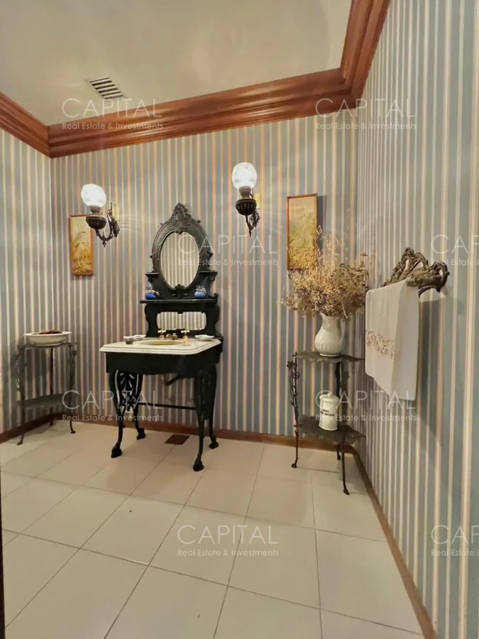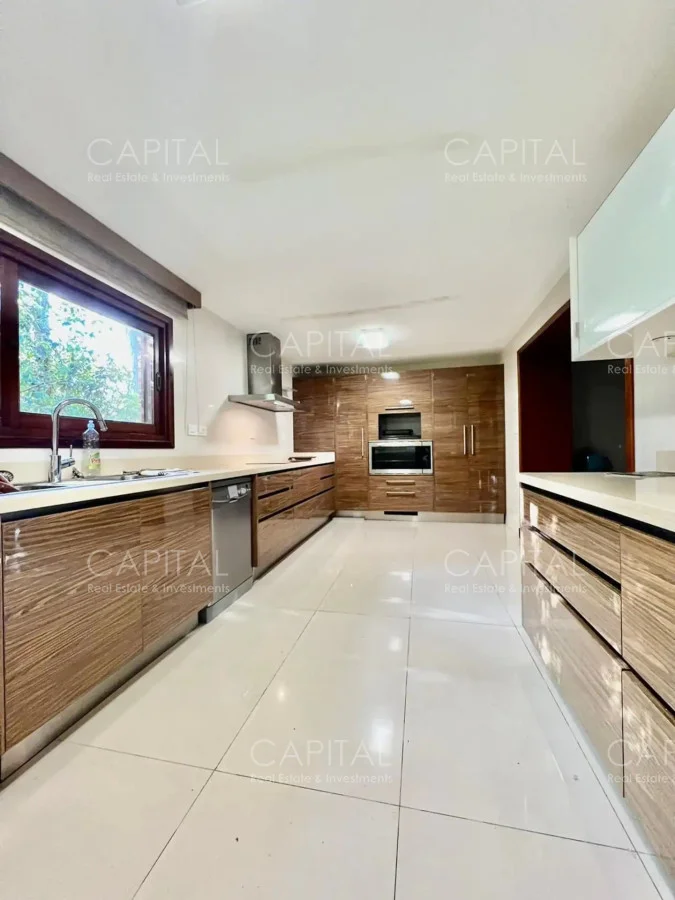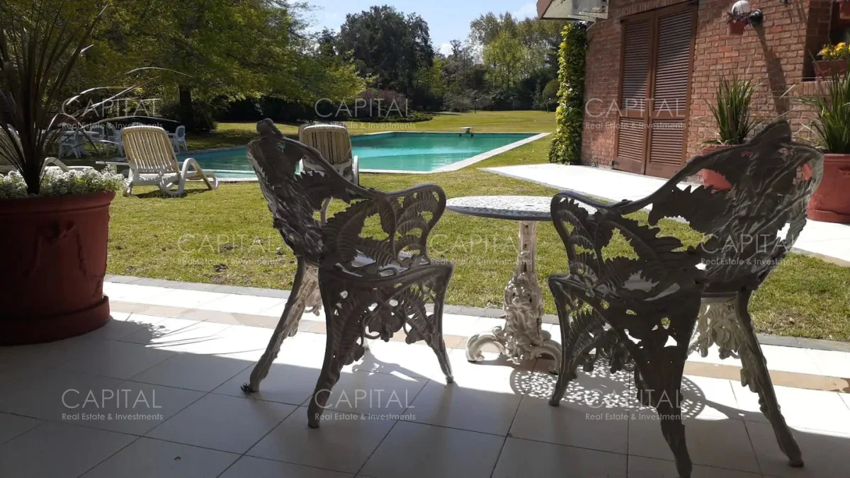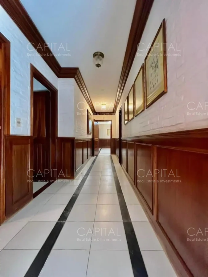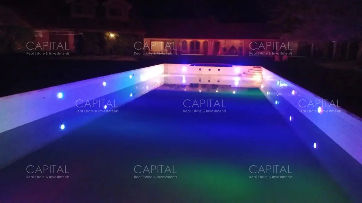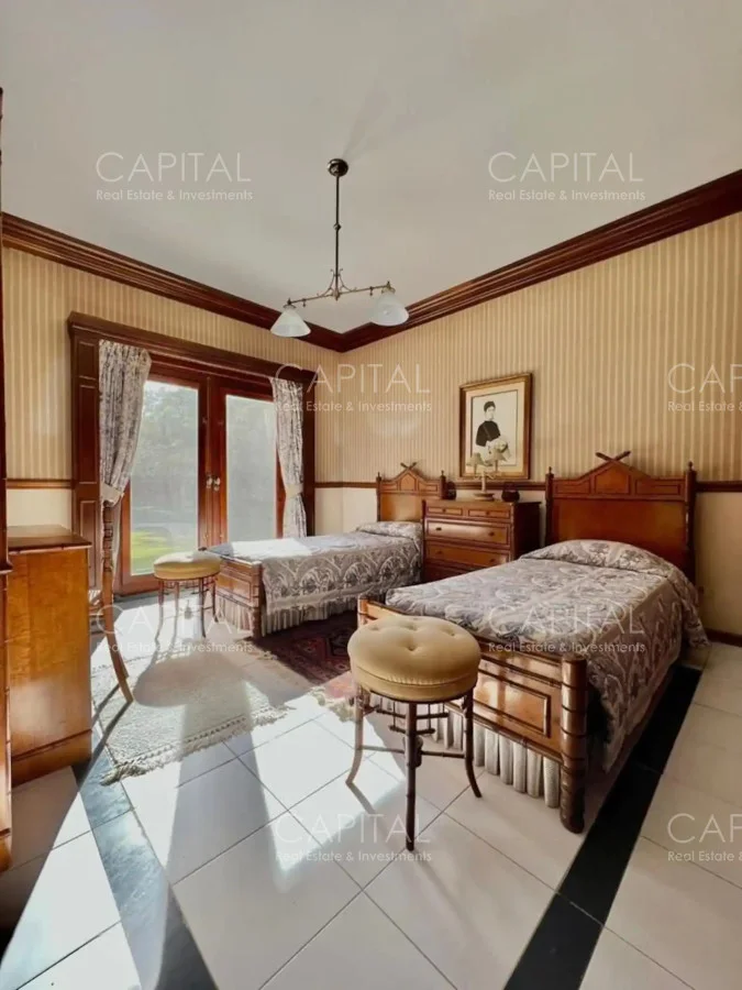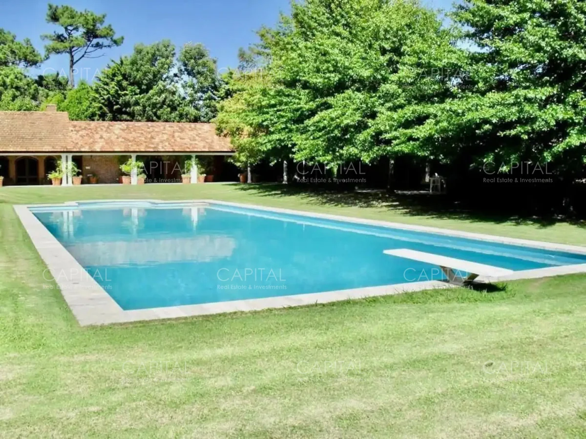 La casa cuenta con un recibidor, amplio living con techos altos, distintos estar para poder disfrutar de la vista al jardín, amplio comedor, salón de eventos, doce dormitorios en suite, toilet, dependencia de servicio, parrillero, amplio jardín trasero rodeado de verde añadiendo privacidad a la propiedad, piscina olímpica con sombrillones y camastros.