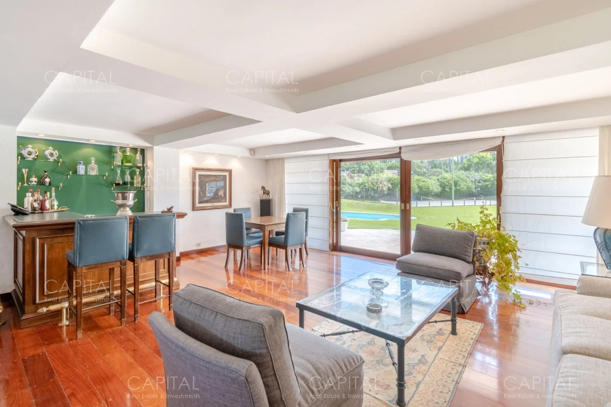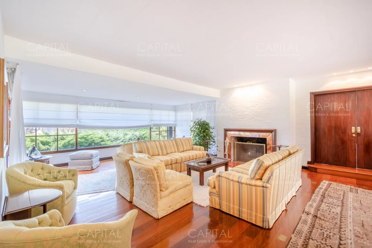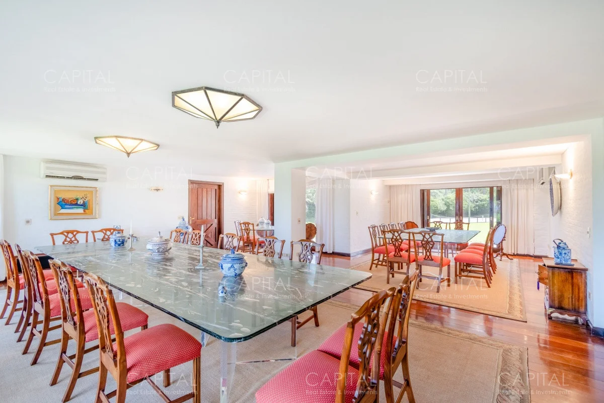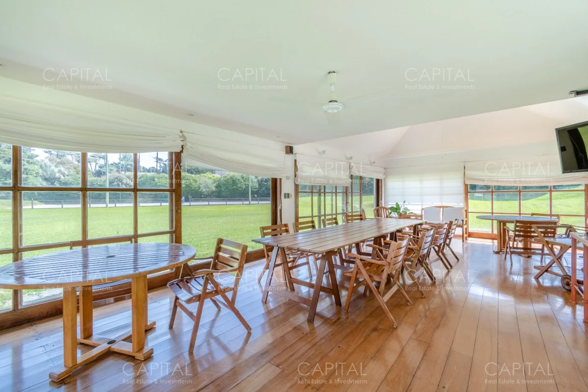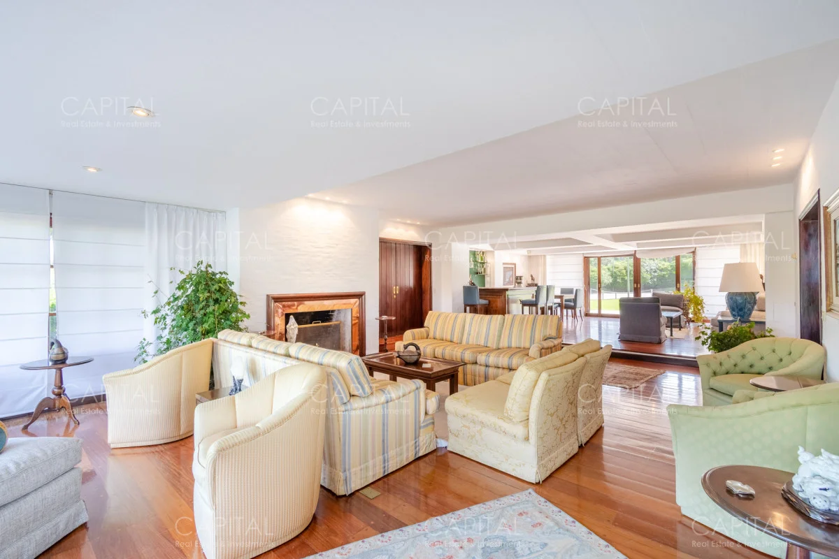 En la primer planta se encuentra el living y salas de estar con estufas a leña, sala de tv, comedor principal y comedor diario, una amplia cocina con desayunador y salida al gran jardín.