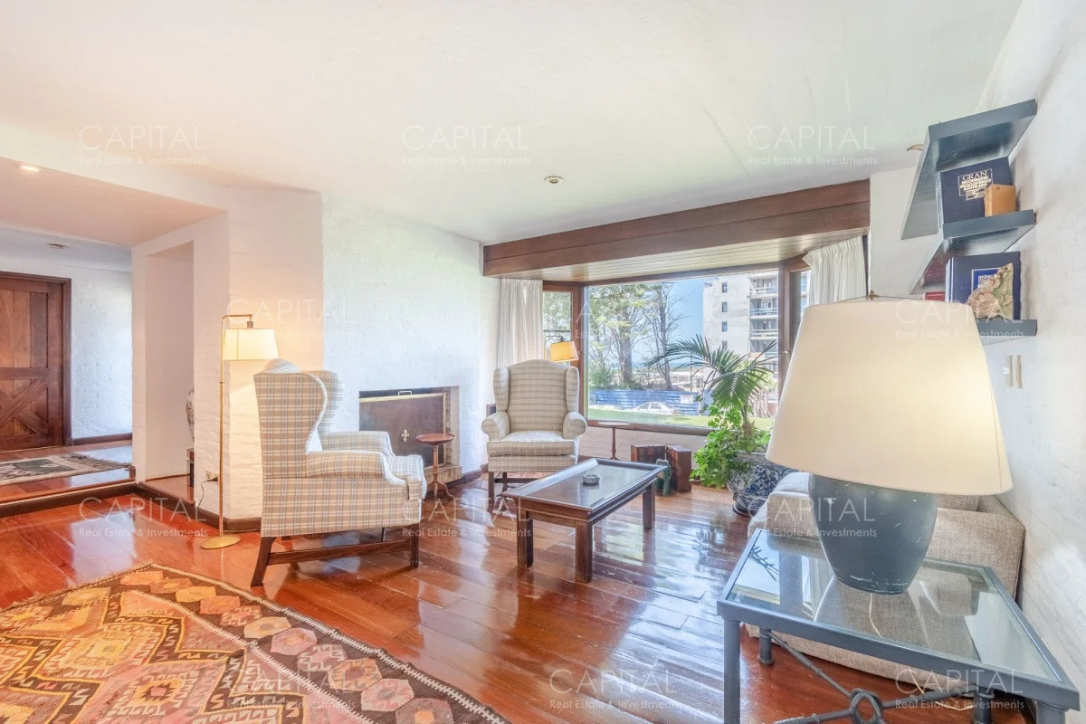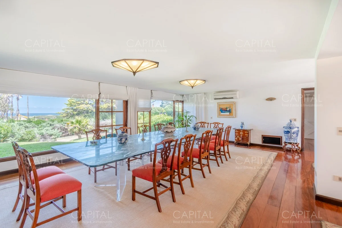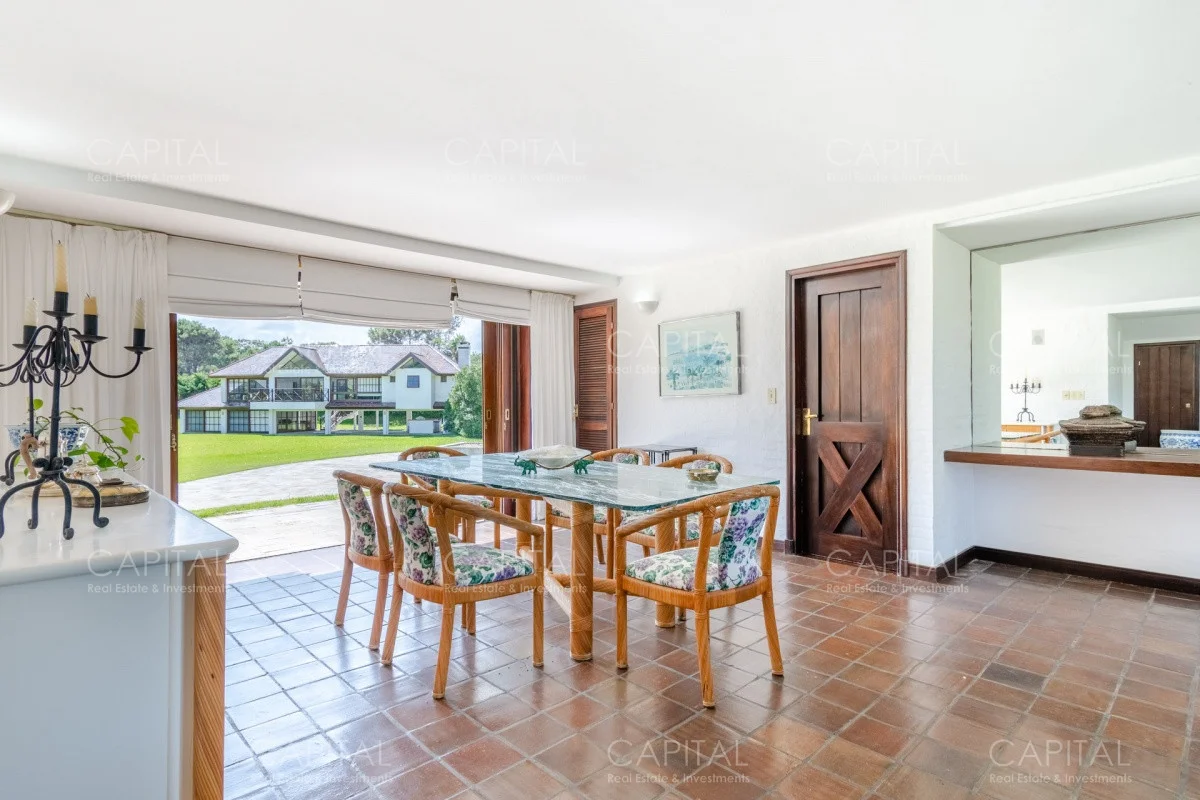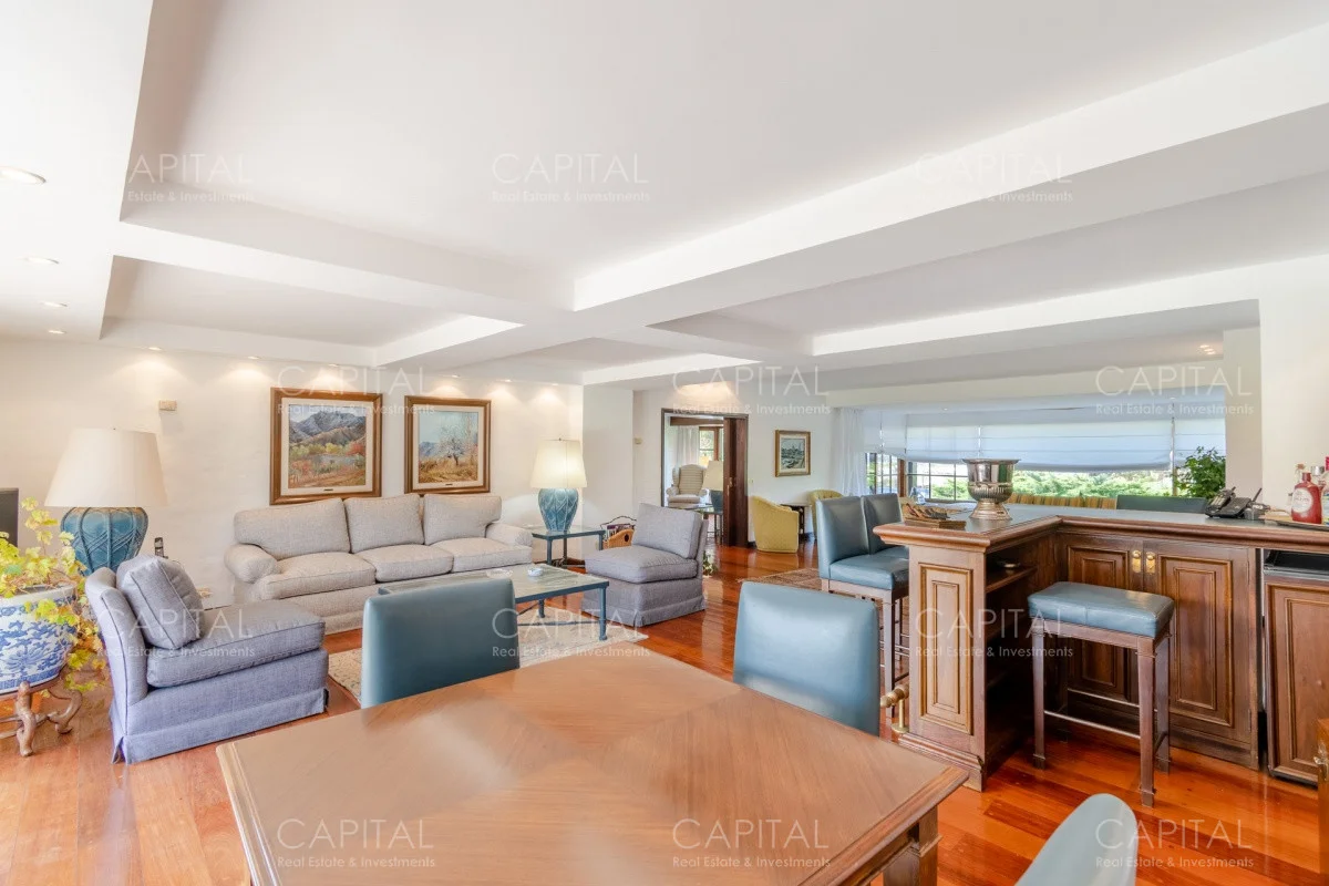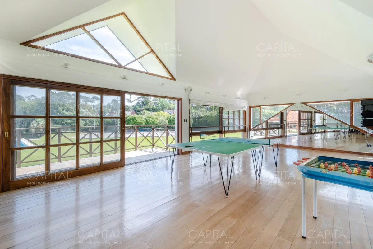 En la primer planta se encuentra el living y salas de estar con estufas a leña, sala de tv, comedor principal y comedor diario, una amplia cocina con desayunador y salida al gran jardín.