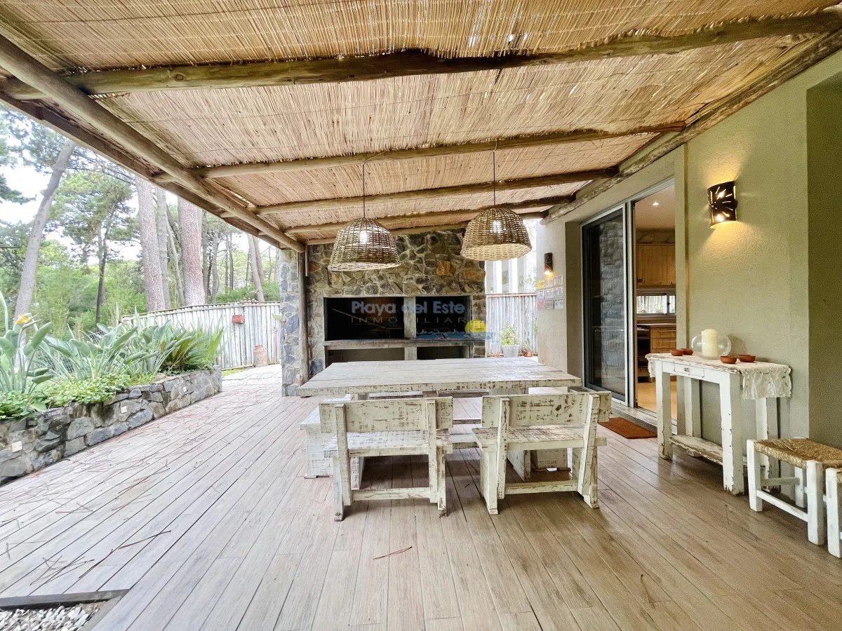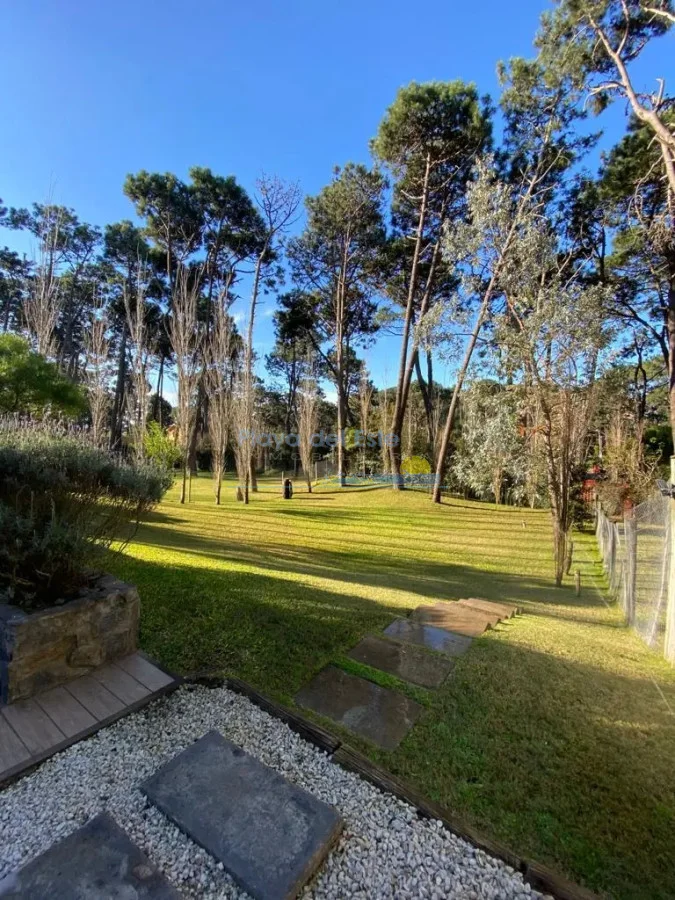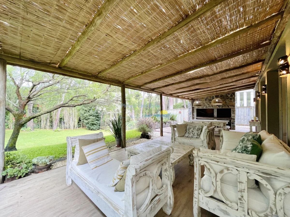 En un lote de 1.056 m2 y desarrollada en 280 m2 distribuidos en dos plantas, esta espléndida propiedad cuenta con un espacioso living comedor con hogar a leña, ventanales de piso a techo que permiten disfrutar el jardín desde el interior de la casa. Parque que rodea toda la casa, ofreciendo una vista despejada y verde desde cualquier rincón. Aquí se ubica el parrillero techado con living exterior y excepcional vista arbolada.