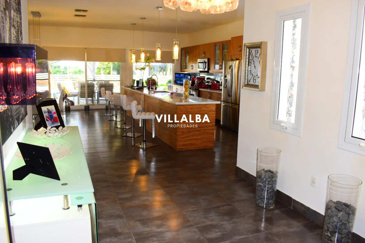 Cuenta con 3 dormitorios en suite con vestidores, total de baños 5, dependencia de servicio, lavadero, garaje para 2 autos, cocheras abiertas para 4 autos, totalmente cercado con portones automatizados, cancha de básquet y futbol, play room, parrillero, piscina climatizada.
