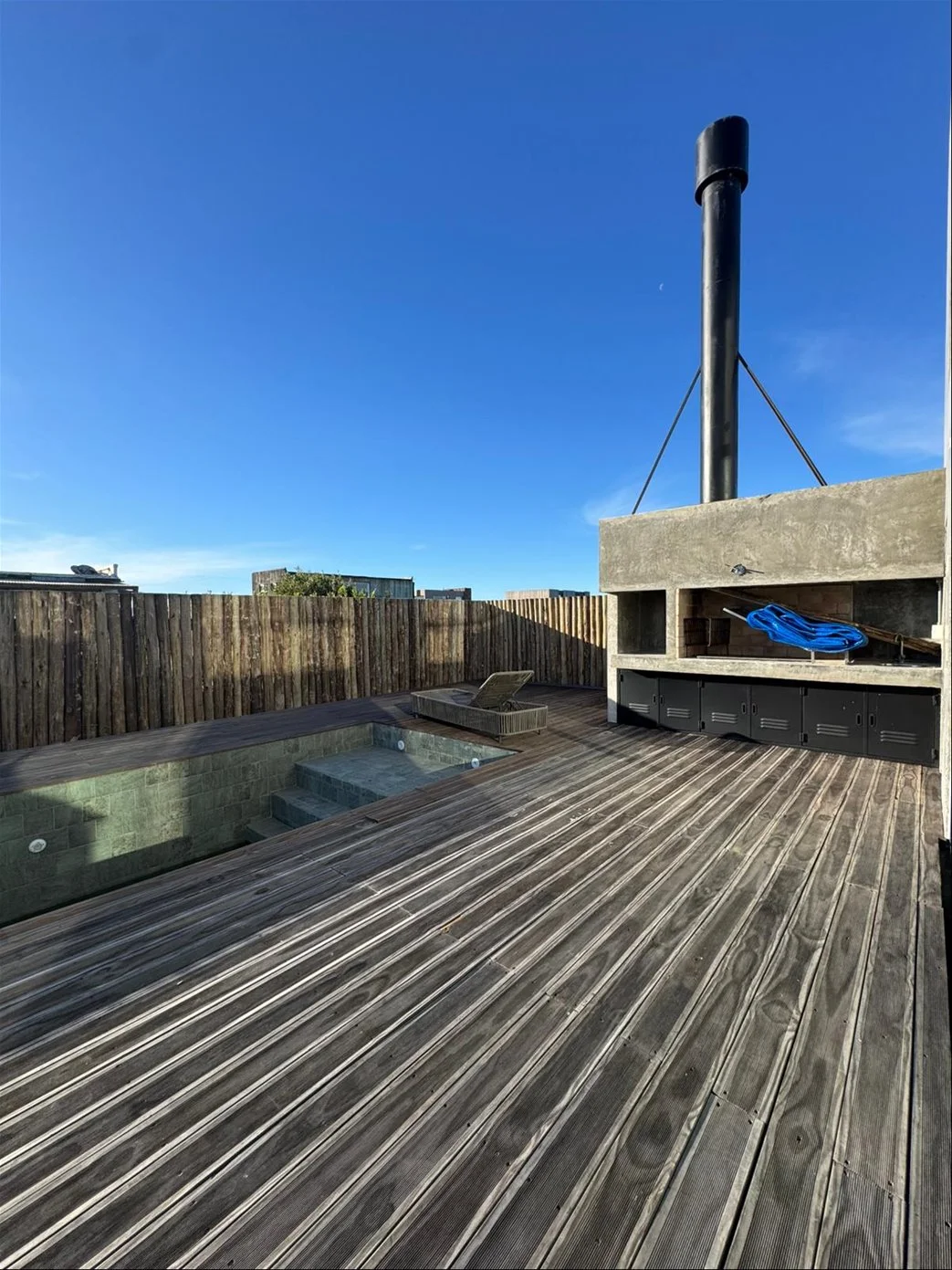 En el exterior ofrece piscina privada, barbacoa con parrillero, terrazas cubiertas y descubiertas con deck, patio verde y garaje para 2 autos.