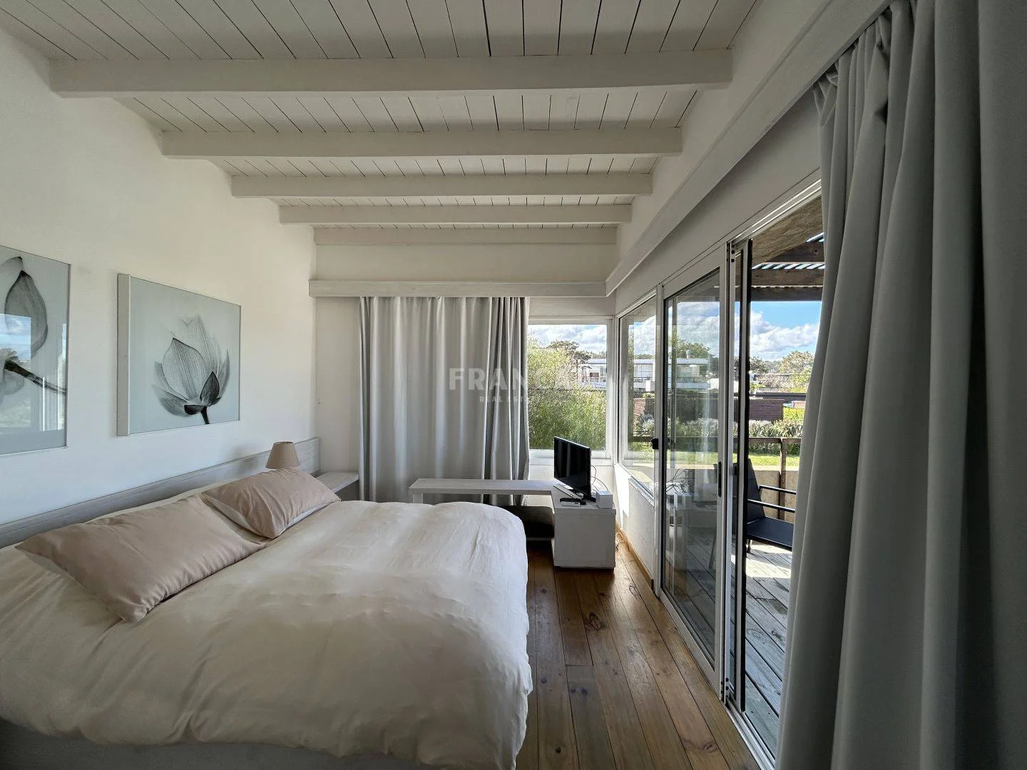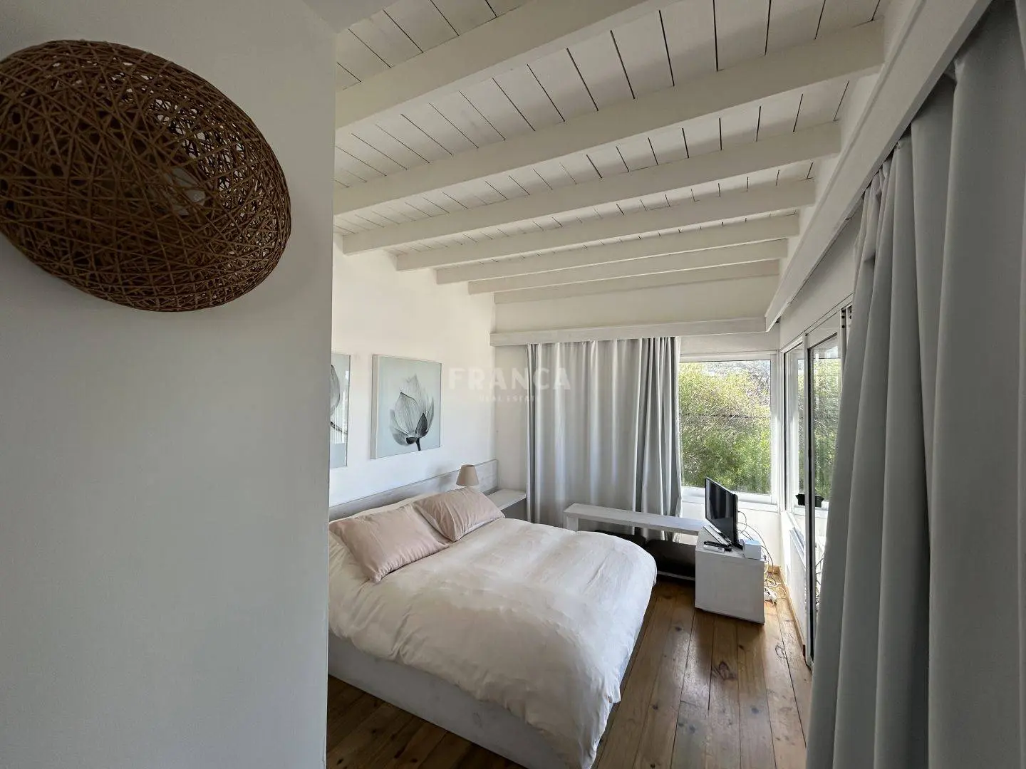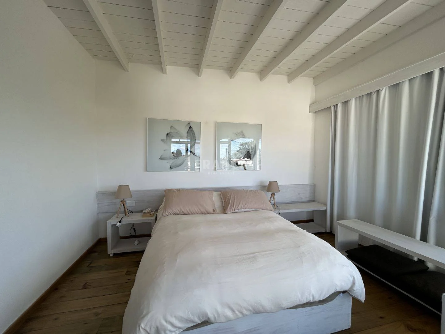 En la planta alta, la suite principal incluye un vestidor, terraza privada y una vista parcial al mar, brindando un ambiente íntimo y relajante.