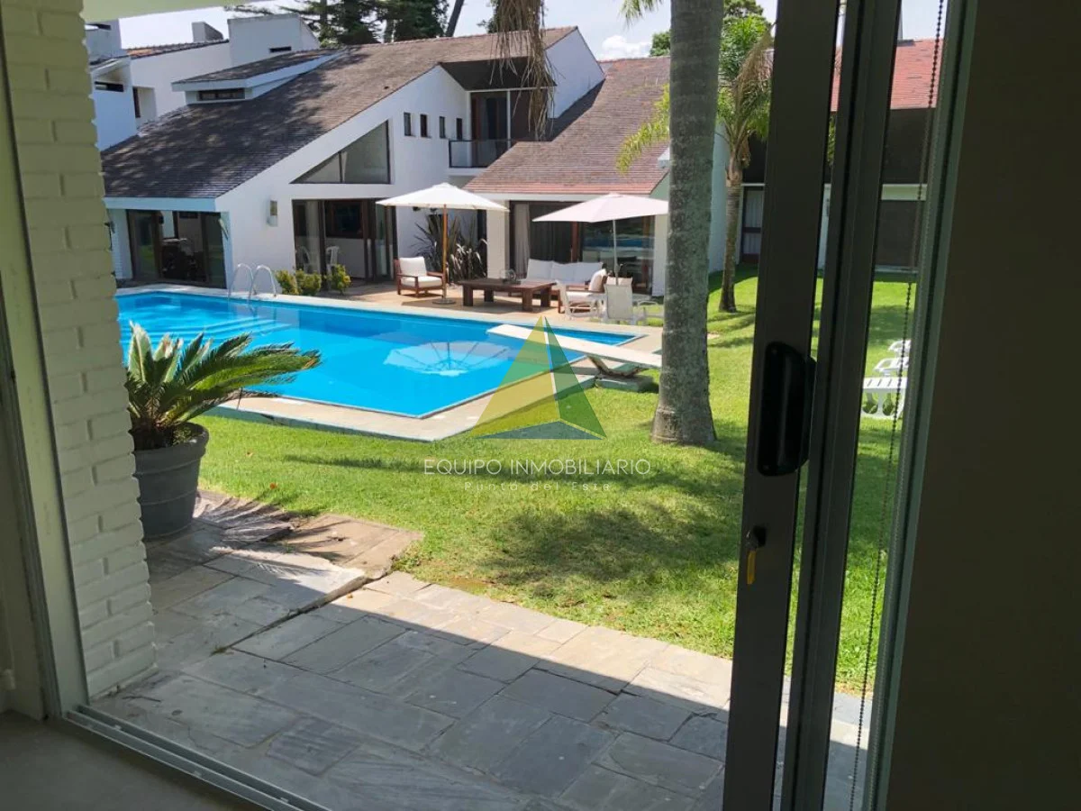 La casa cuenta con 5 dormitorios, 2 de ellos en suites, dependencia para servicio, 6 baños, cocina, living, comedor, barbacoa integrada, piscina grande con trampolín y un espectacular jardín. Además tiene casa de huéspedes con 2 dormitorios y 3 baños.