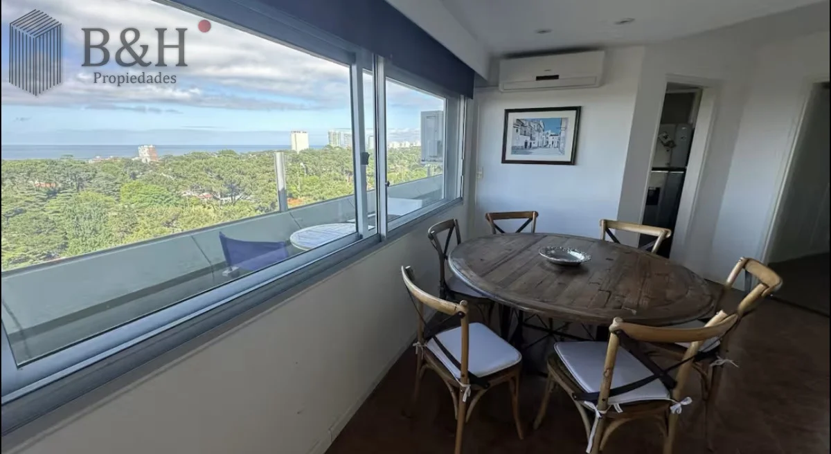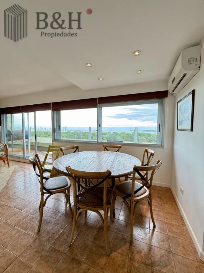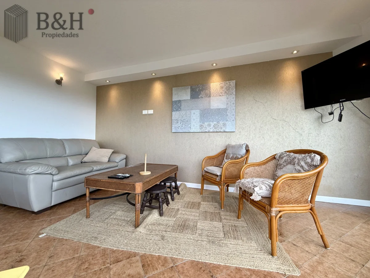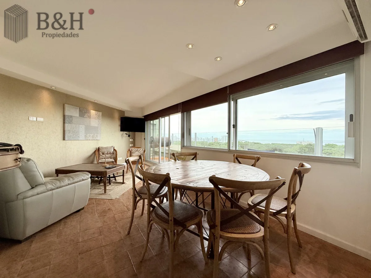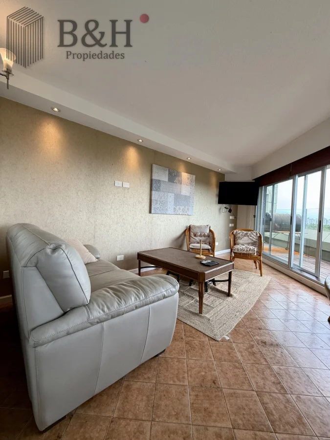 Amplio living-comedor con salida al balcón perimetral, cocina independiente y parrillero medio tanque con vista al mar.