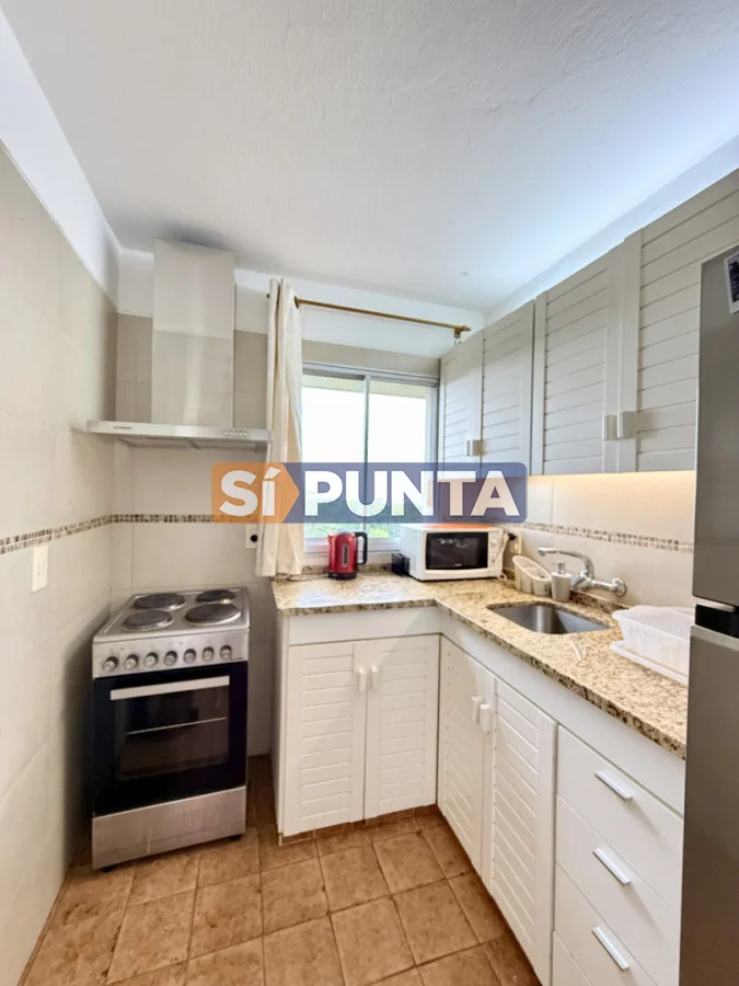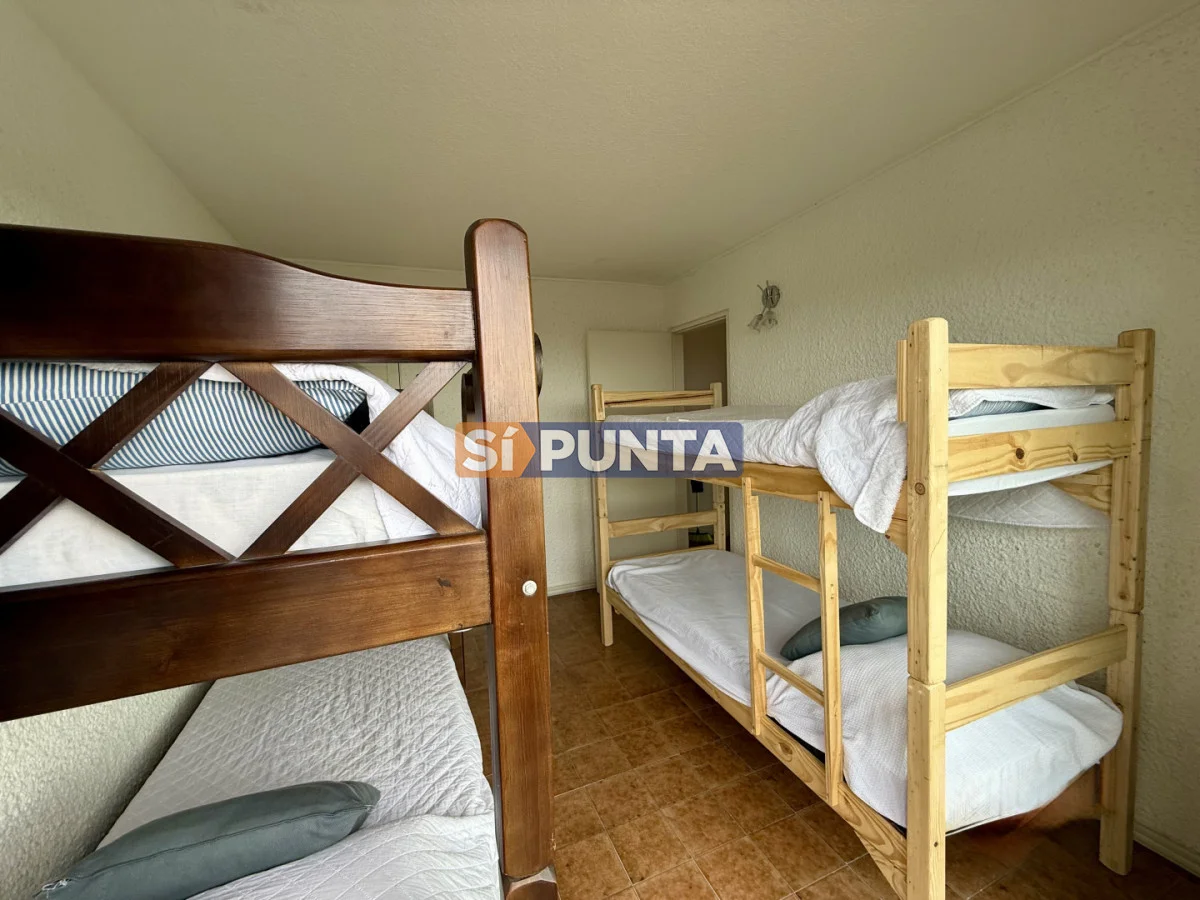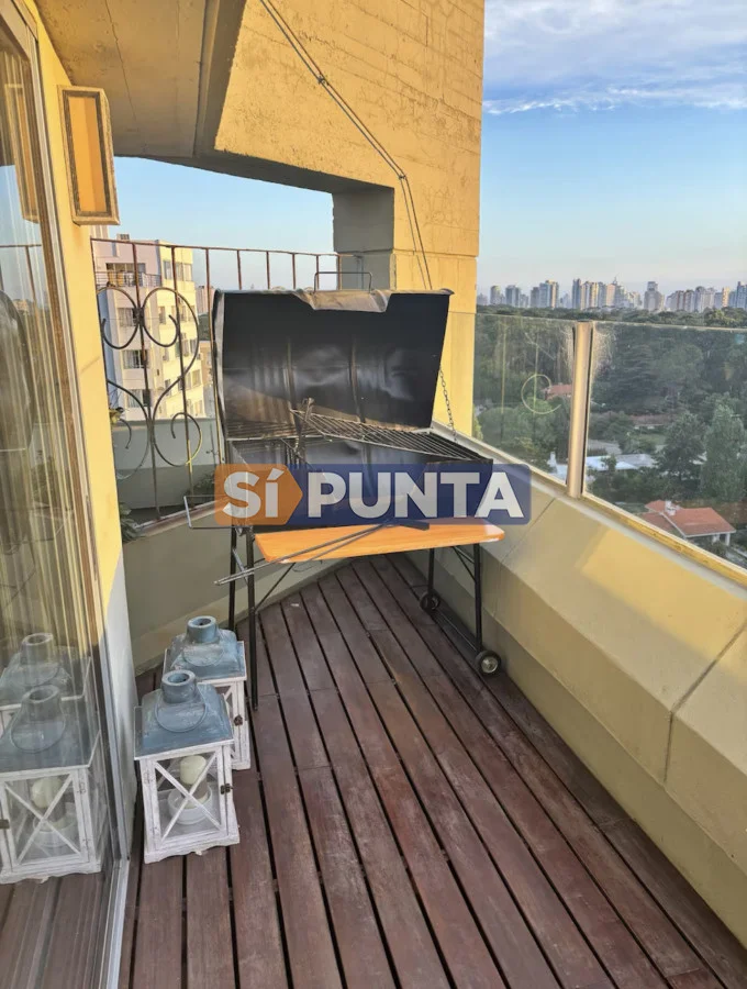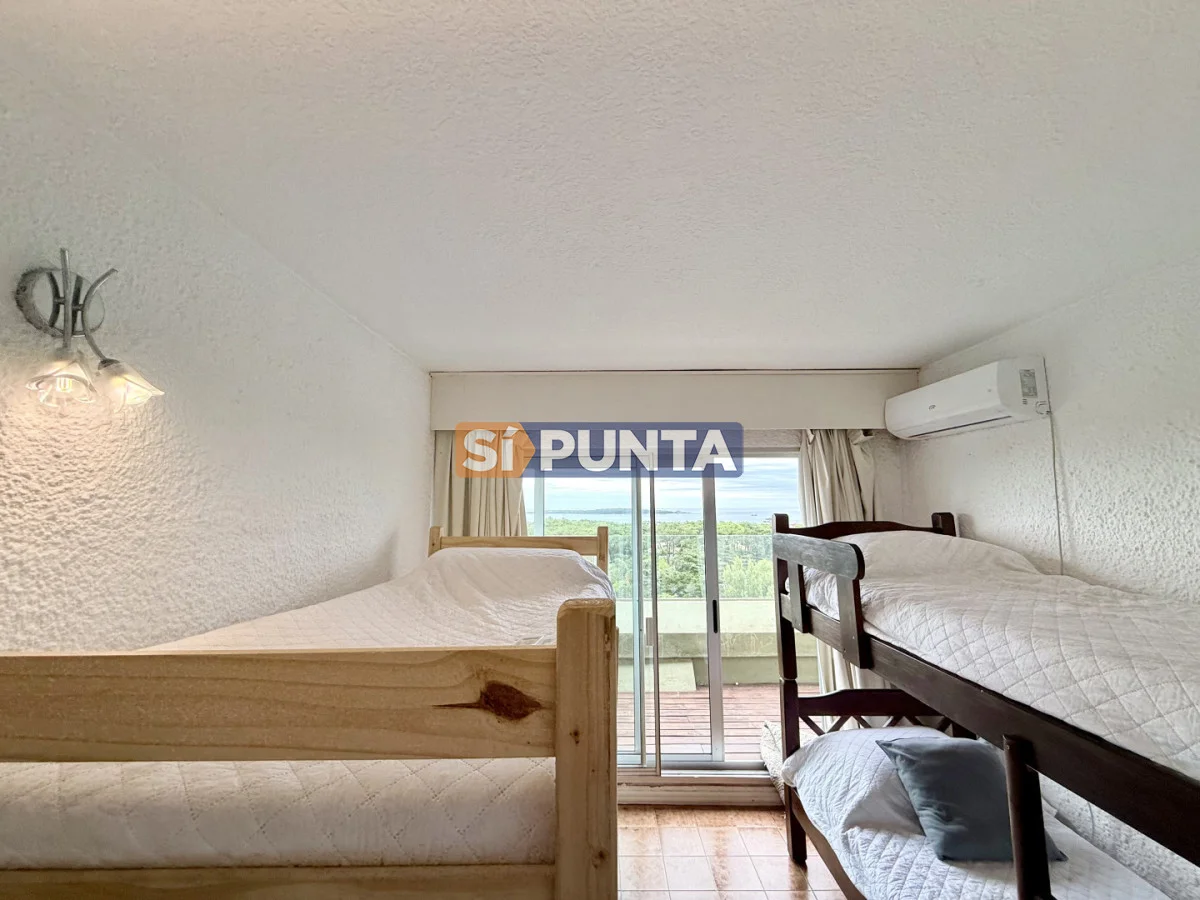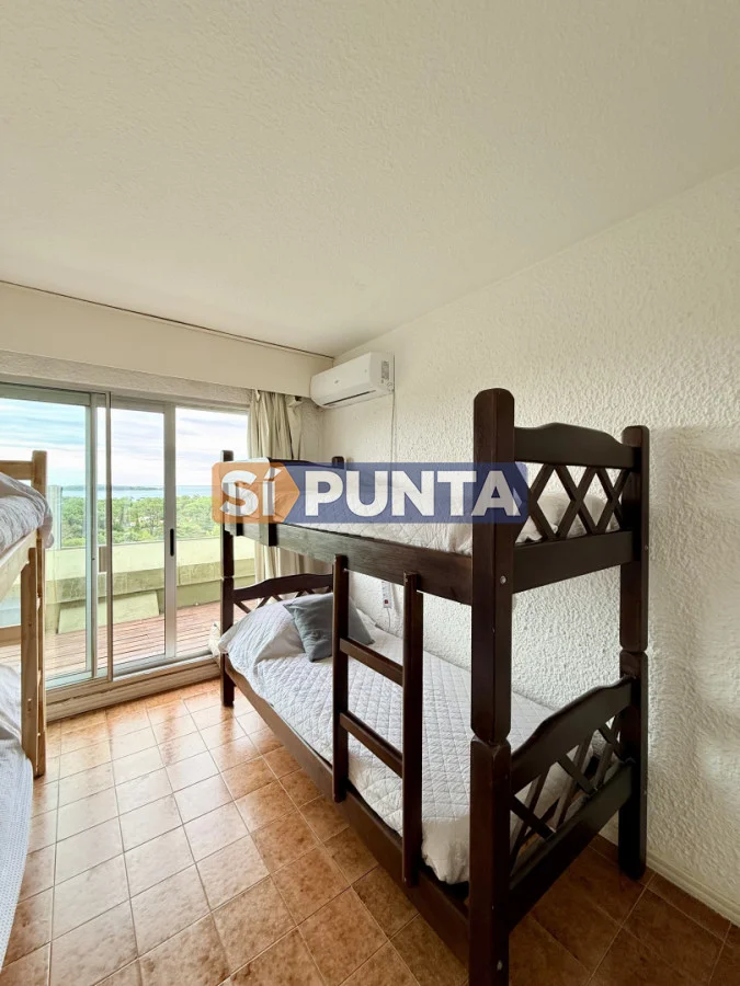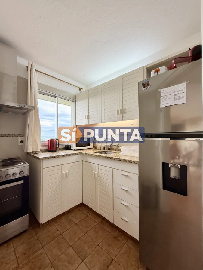 Amplio living-comedor con salida al balcón perimetral, cocina independiente y parrillero medio tanque con vista al mar.