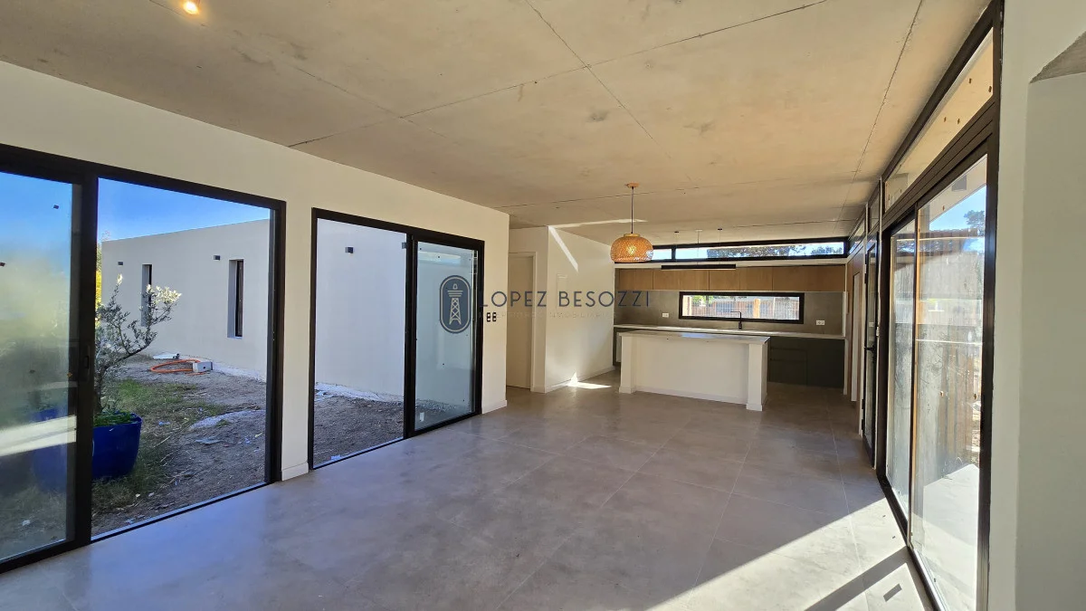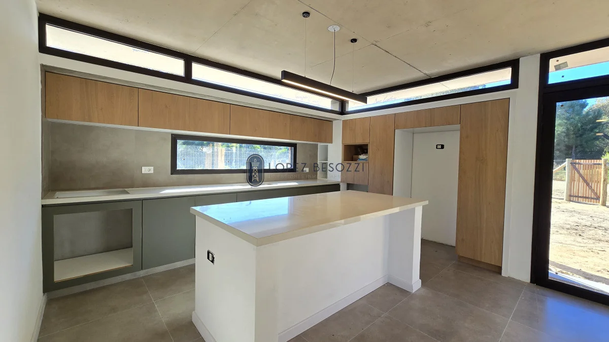 La casa estará distribuida en un solo nivel contando con amplio living-comedor con estufa a leña de alto rendimiento en el cual los ventanales amplios destacan y permiten excelente circulación de aire y luz natural; cocina integrada de buenas dimensiones con muebles empotrados a mediad; mesadas de cuarzo e isla (se entrega con Anafe; Horno y Campana).