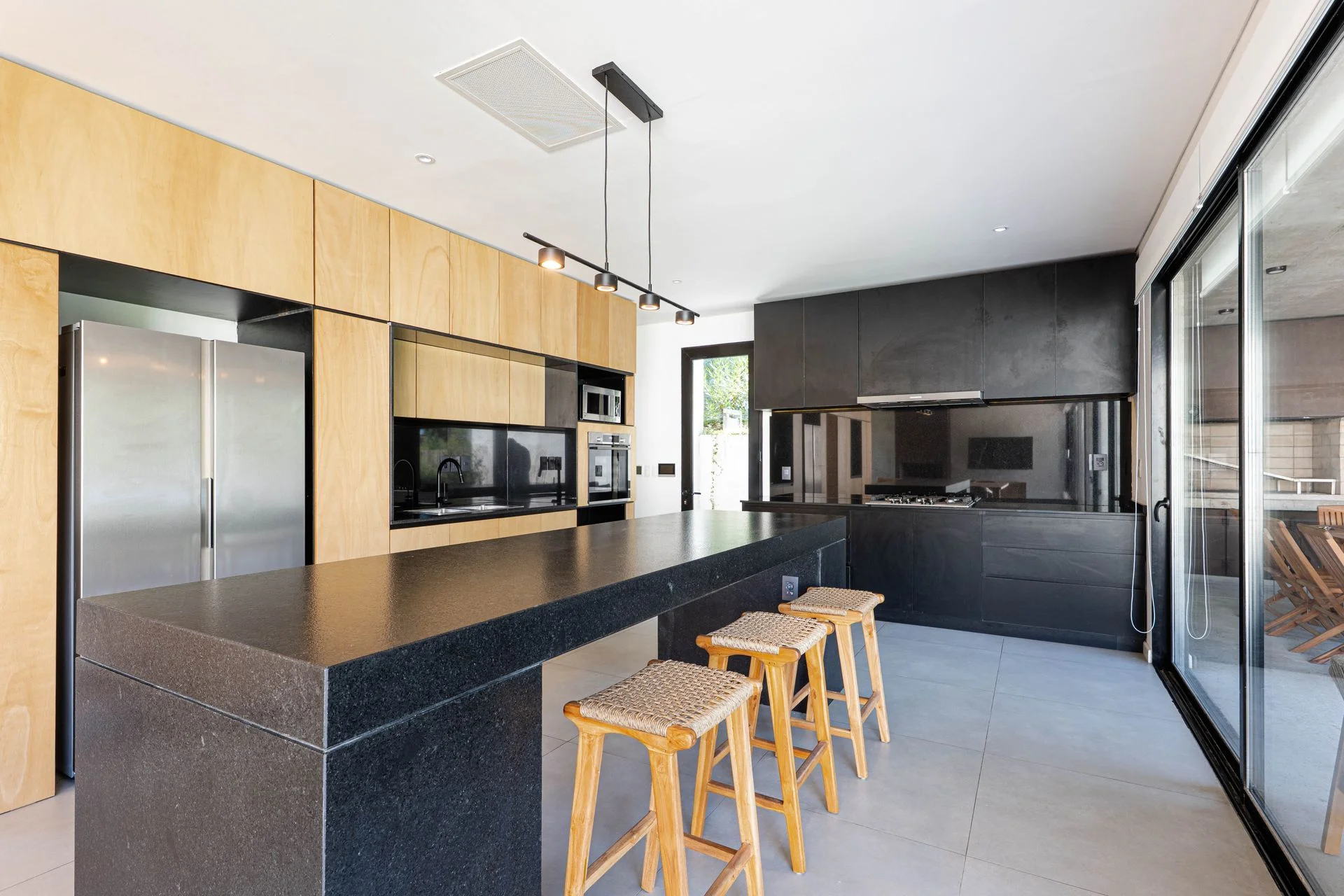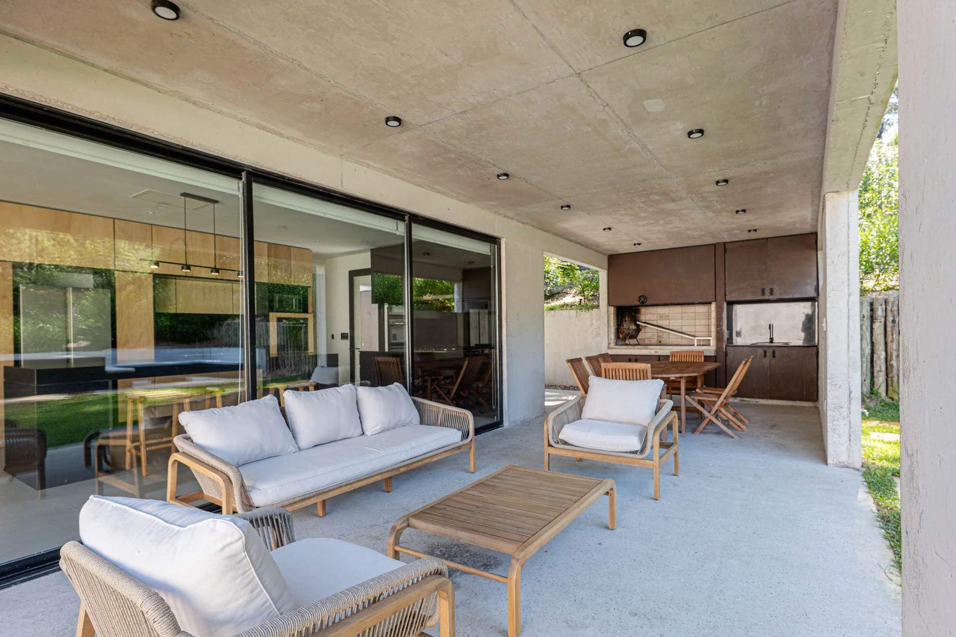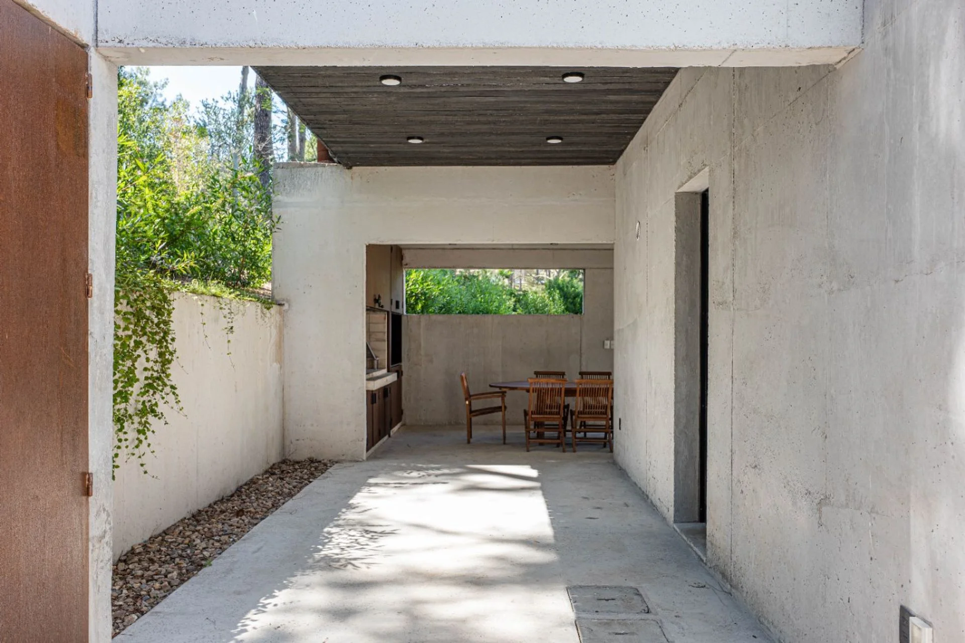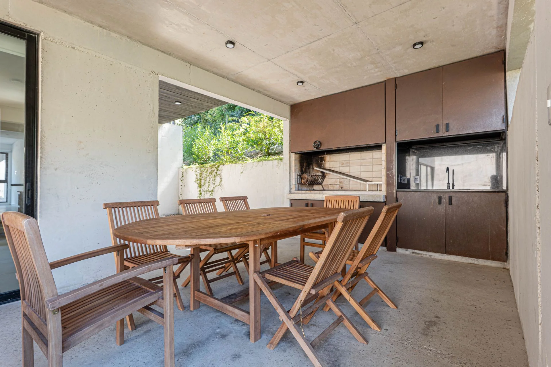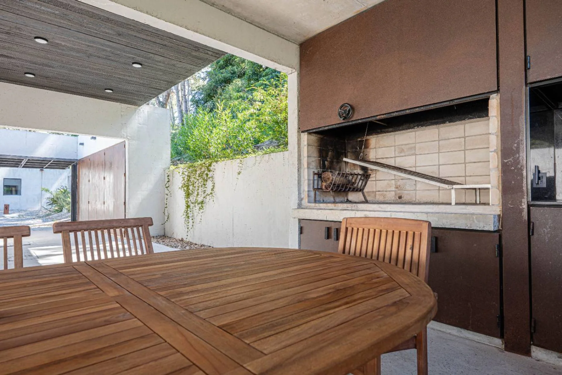 En el área de afuera encontramos el parrillero techado, un mueble con espacio de guardado y la cochera.