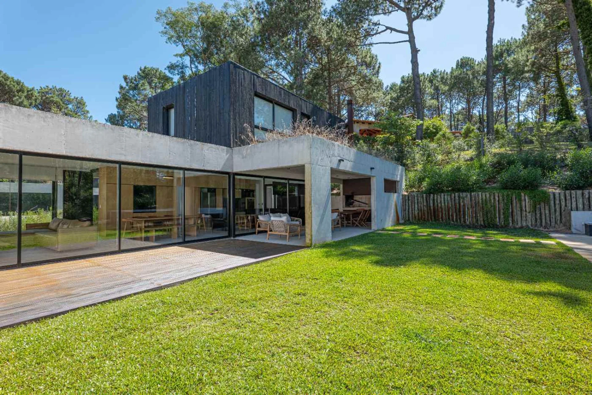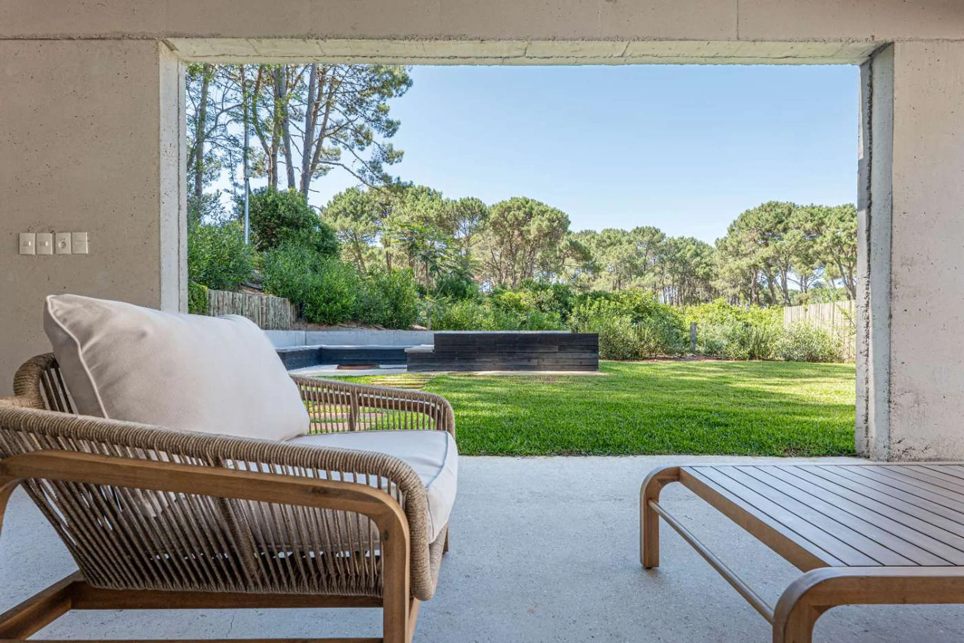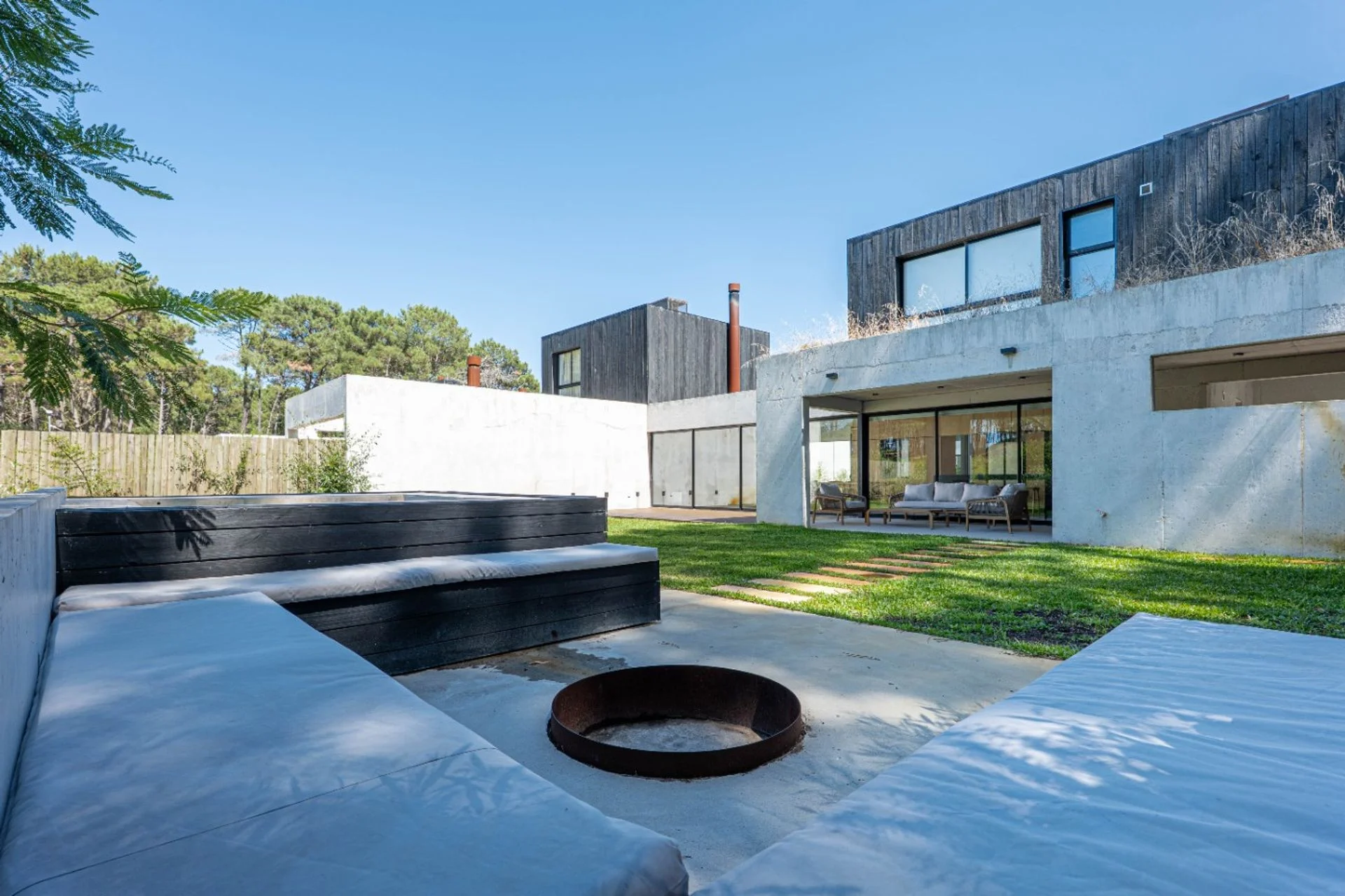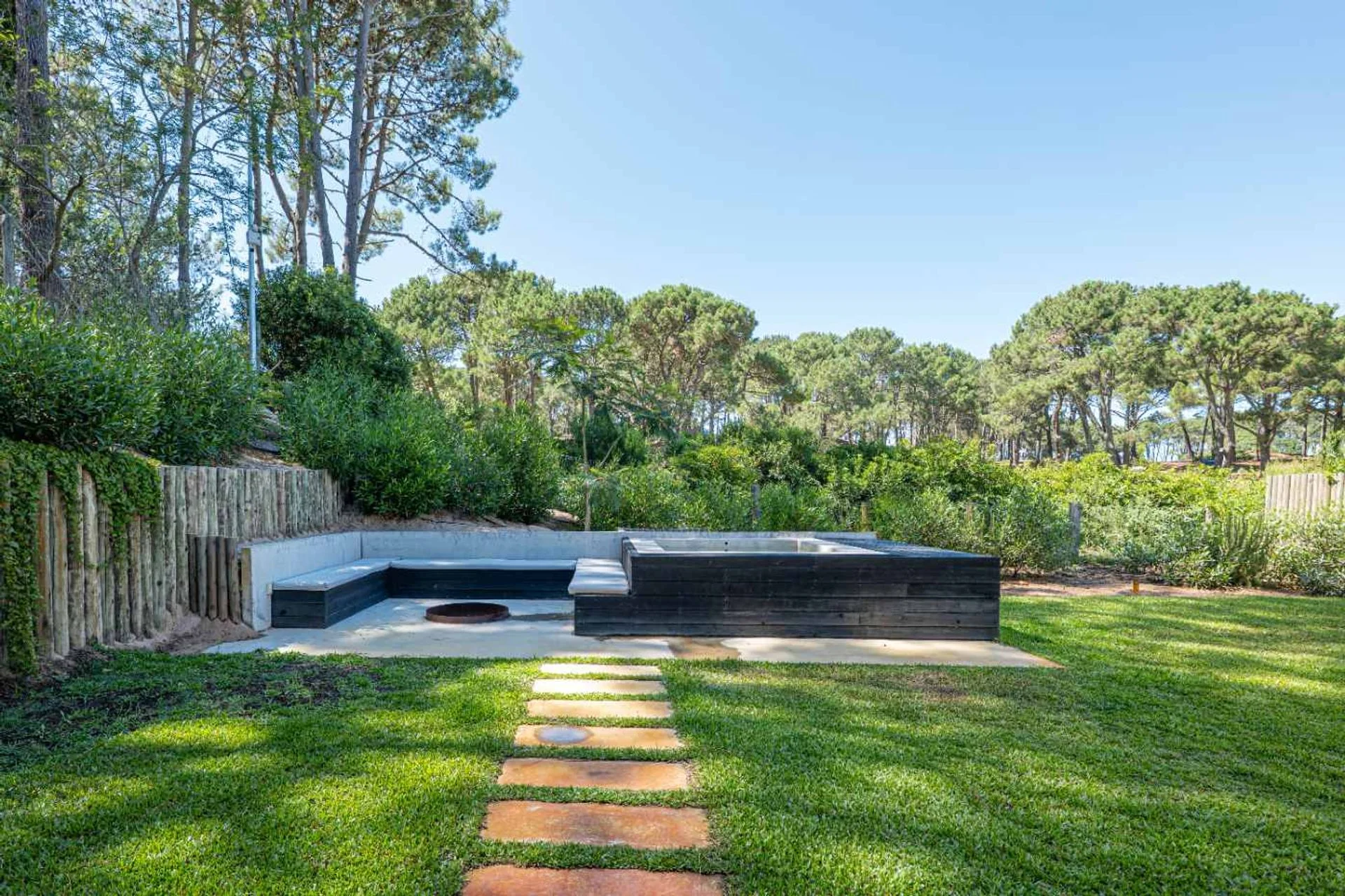En el espacio de verde vamos a ver un fogón con sus asientos y un Jacuzzi para disfrutar de todo el entorno de verde que brinda el complejo.