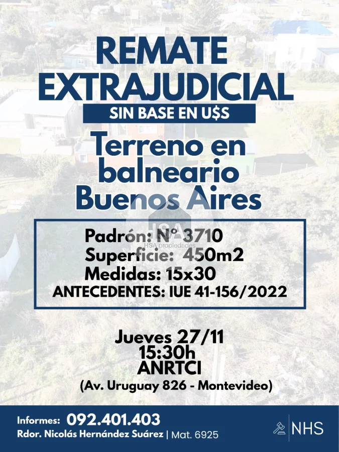 REMATE POR LIQUIDACIÓN CONCURSAL SIN BASE, EN U$S JUEVES 27 DE NOVIEMBRE 15.30 HS EN ANRTCI (AV. URUGUAY 826- MONTEVIDEO) TERRENO UBICADO EN BALNEARIO BUENOS AIRES, DEPARTAMENTO DE MALDONADO. UBICACIÓN: CALLE LOS ESTRIBOS (CALE 25) Y RUTA 10 SUPERFICIE: 450 M2 MEDIDAS: 15M X 30M ZONA DE ALTÍSIMO CRECIMIENTO, EXCELENTE OPORTUINDAD DE INVERSIÓN, CON GRAN POTENCIAL, SE ENCUENTRA PRÓXIMO A NUEVO DESARROLLO INMOBILIARO \"EL NIDO”. EXCELENTE UBICACIÓN, A METROS DE LA COSTA. SE ENCUENTRA A 18 KM DE PUNTA DEL ESTE Y A 16 KM DE JOSÉ IGNACIO. COM. E IMP 3,66% | SEÑA 30% Referencia Interna : Tera-629