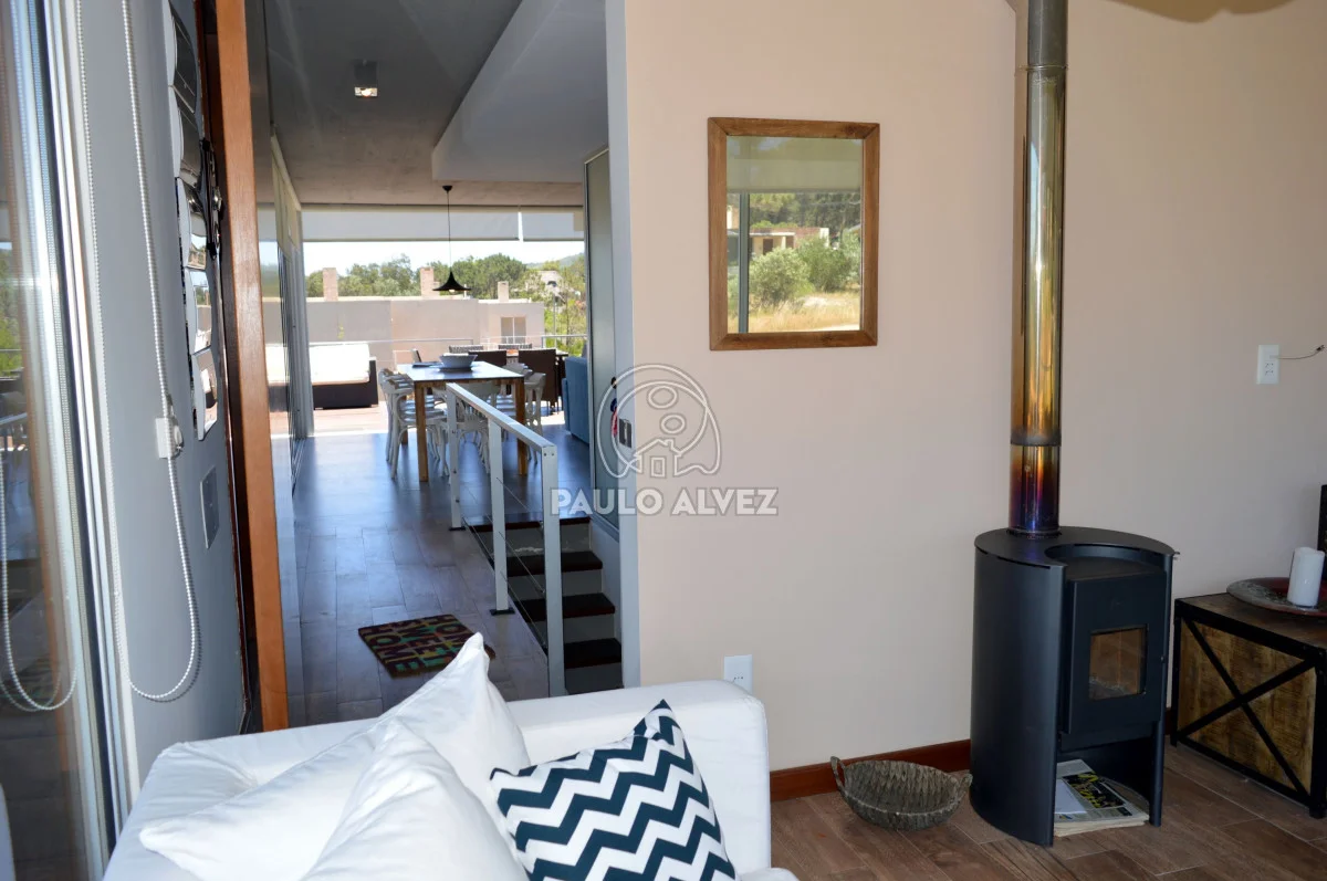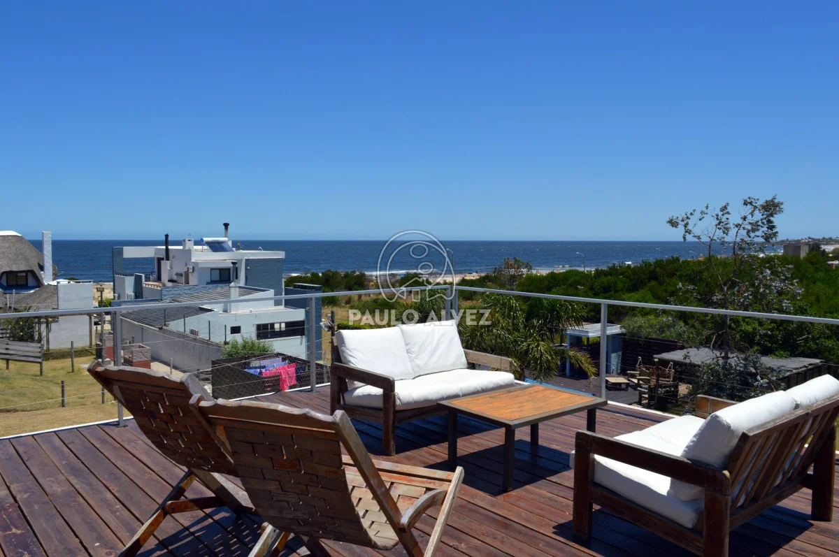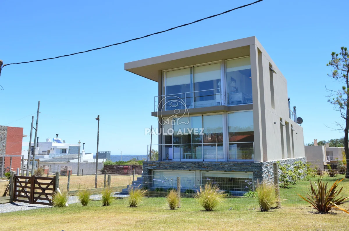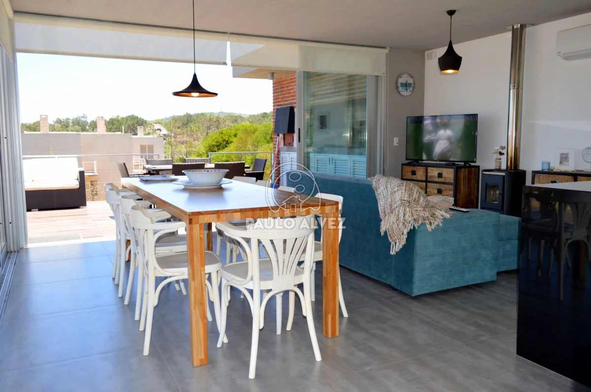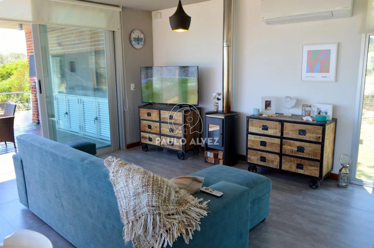Propiedad de buen calibre desarrollada en 3 plantas, con excelente gusto por el diseño y rodeada por un entorno tranquilo y natural. Acceso principal a planta intermedia, living comedor con estufa a leña de alto rendimiento, tv led con DirecTv, y acceso a terraza integrada mediante puertas ventanas. Esta última, amplia con parrillero y horno a leña, amueblada para disfrutar del aire libre. Cocina funcional con desayunador con equipamiento total. Pasillo a baño social y segundo living con estufa a leña, acceso a balcón delantero y vista al mar; el mismo conecta ambas alas de la propiedad. Escalera a planta alta, escritorio y dormitorio principal en suite (baño completo con bañera) con vestidor y hermosa vista al mar. Pasillo con acceso a terraza superior, ideal para disfrutar de vista panorámica a la costa y cerros.El subsuelo comprende dos dormitorios matrimoniales y baño completo. Amplio fondo y cocheras cubiertas con lavadero. Cerca perimetral, alarma y aire acondicionado en todos los ambientes. Por más información contáctenos.