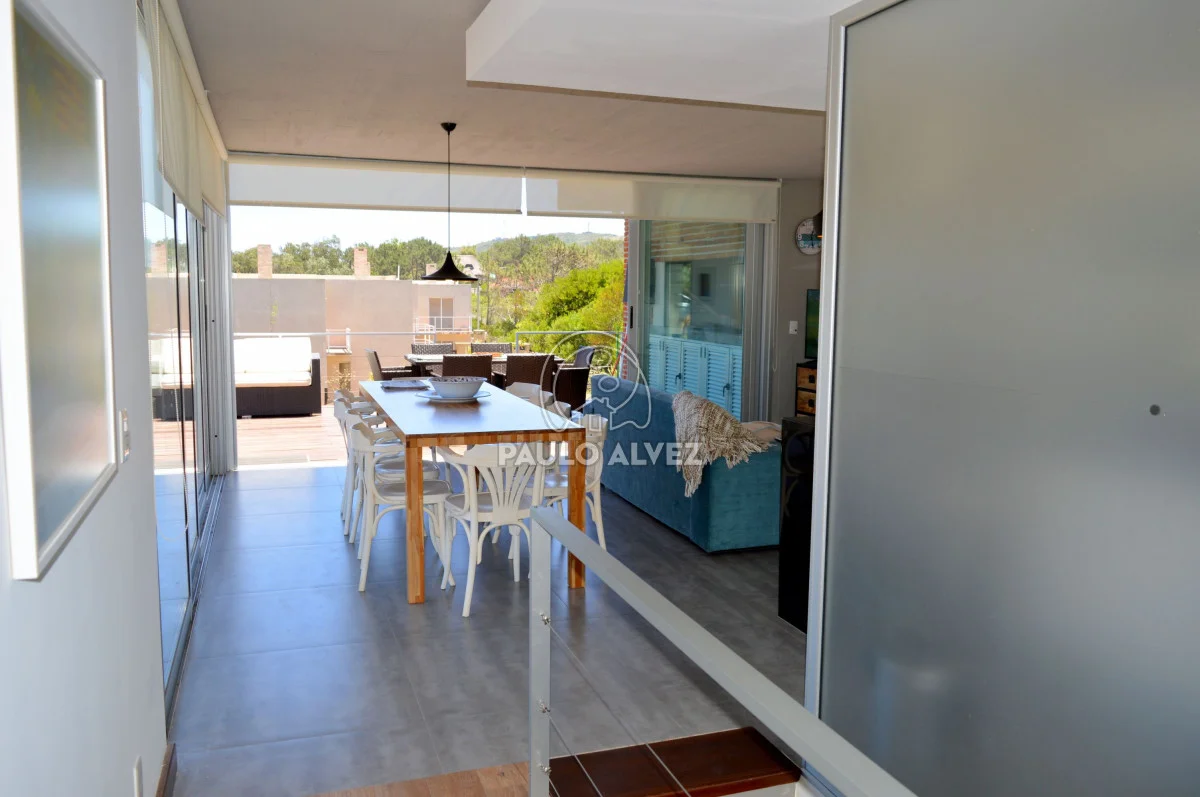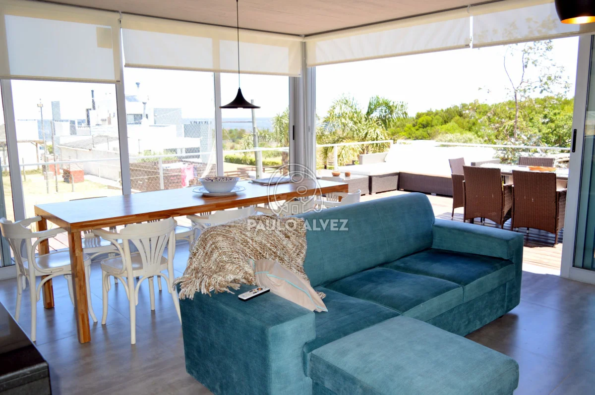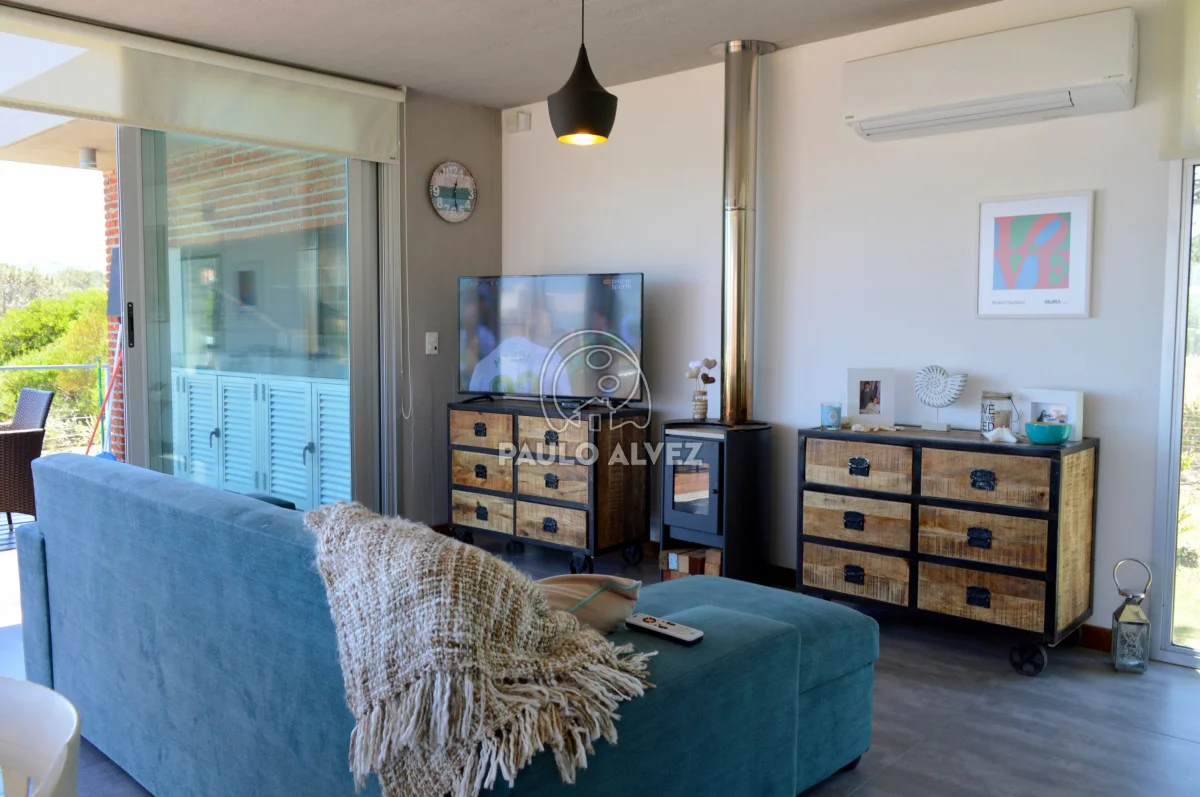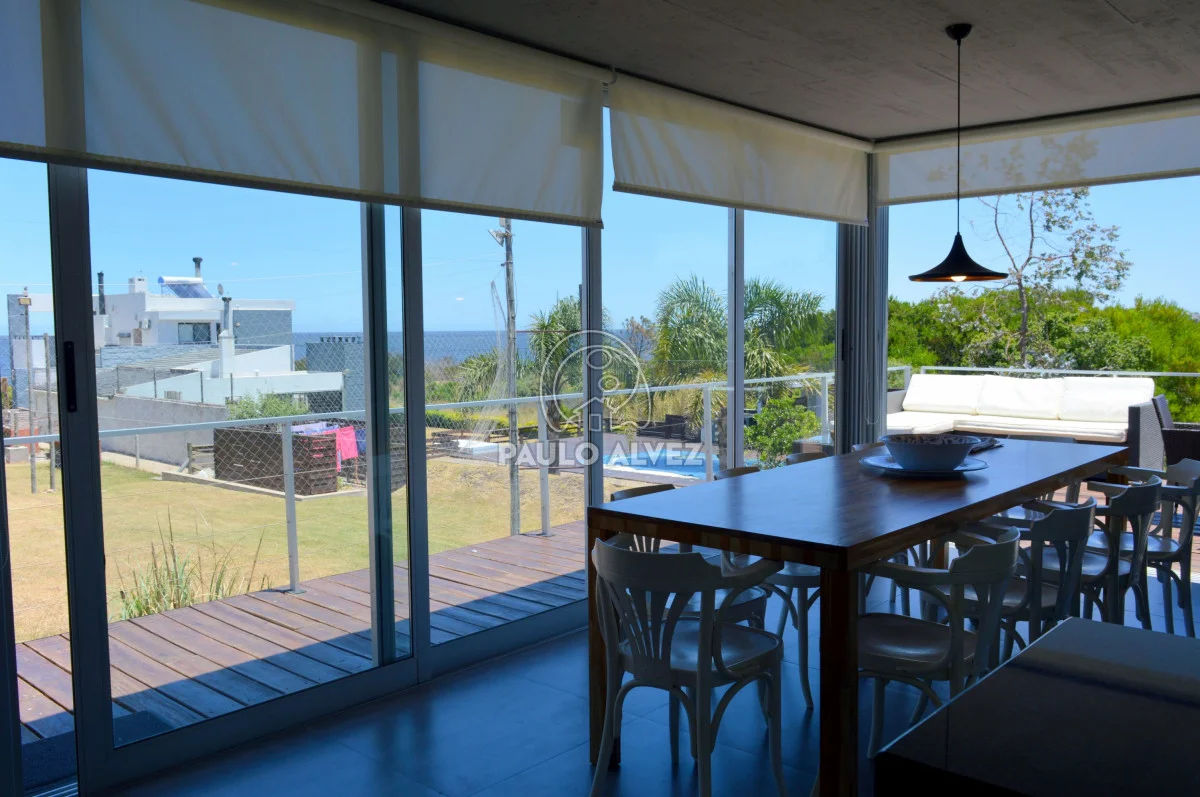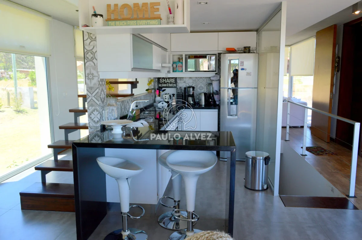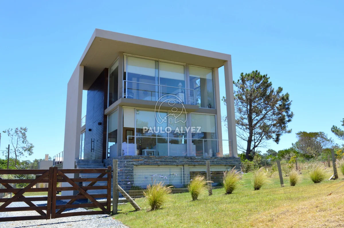 Propiedad de buen calibre desarrollada en 3 plantas, con excelente gusto por el diseño y rodeada por un entorno tranquilo y natural. Acceso principal a planta intermedia, living comedor con estufa a leña de alto rendimiento, tv led con DirecTv, y acceso a terraza integrada mediante puertas ventanas. Esta última, amplia con parrillero y horno a leña, amueblada para disfrutar del aire libre. Cocina funcional con desayunador con equipamiento total. Pasillo a baño social y segundo living con estufa a leña, acceso a balcón delantero y vista al mar; el mismo conecta ambas alas de la propiedad. Escalera a planta alta, escritorio y dormitorio principal en suite (baño completo con bañera) con vestidor y hermosa vista al mar. Pasillo con acceso a terraza superior, ideal para disfrutar de vista panorámica a la costa y cerros.El subsuelo comprende dos dormitorios matrimoniales y baño completo. Amplio fondo y cocheras cubiertas con lavadero. Cerca perimetral, alarma y aire acondicionado en todos los ambientes. Por más información contáctenos.
