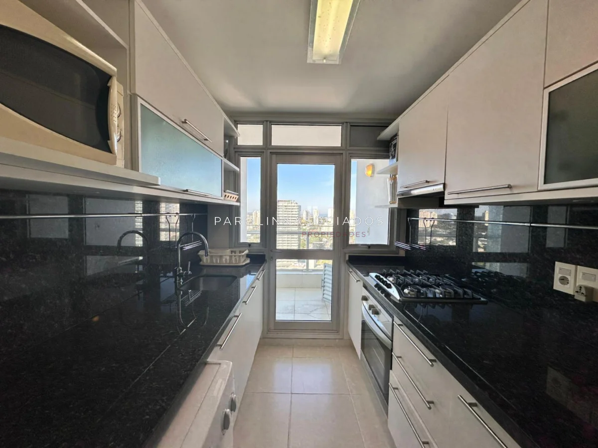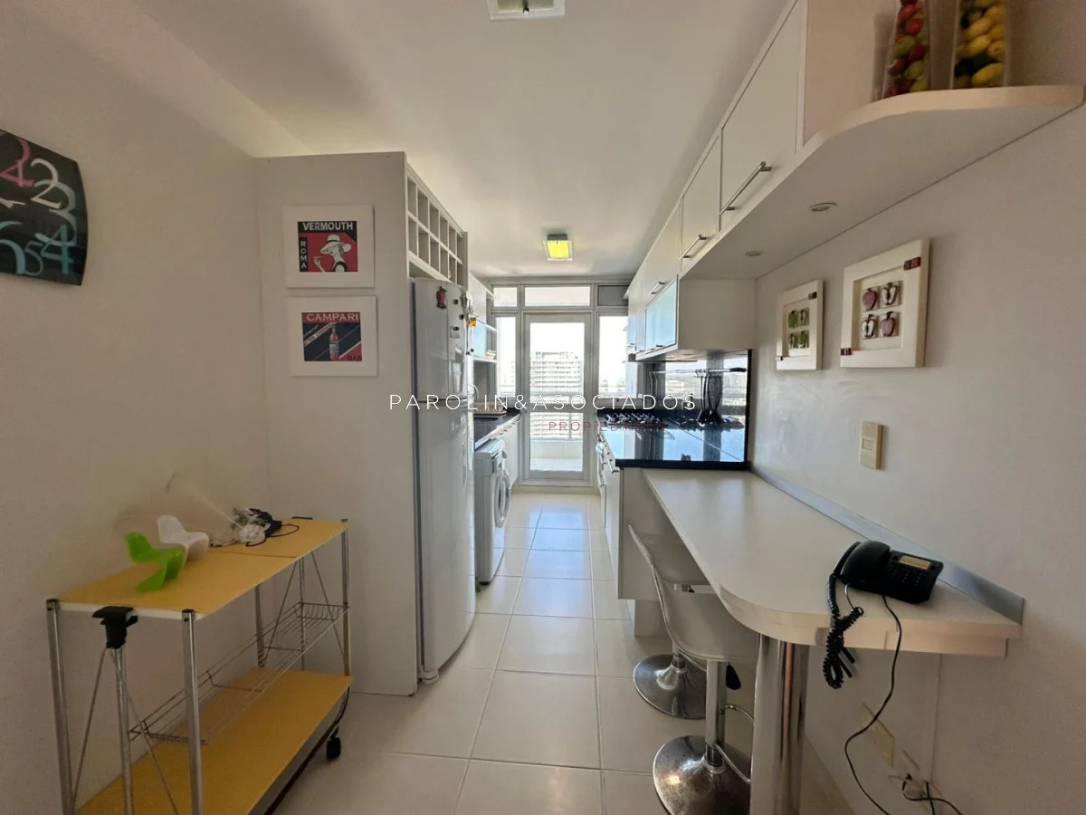 El apartamento dispone de equipamiento completo: microondas, lavarropas, heladera con freezer, horno, TV, aire acondicionado, caja fuerte, además de placares empotrados en dormitorios y cocina que aportan comodidad y orden. El baño principal cuenta con bañera, ideal para disfrutar de un momento de descanso.