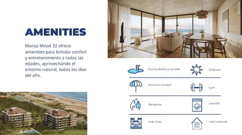 Vivir en Mansa Mood 32 no es solo habitar un espacio moderno y bien resuelto, sino también acceder a una experiencia de vida completa. El edificio ofrece amenities de primer nivel, como piscina interior climatizada y piscina exterior, gimnasio, barbacoas comunes, servicio de playa, kids club, laundry y estacionamiento. Todo esto, en un entorno tranquilo y con una ubicación privilegiada en primera línea, frente a una de las playas más emblemáticas de Punta del Este.