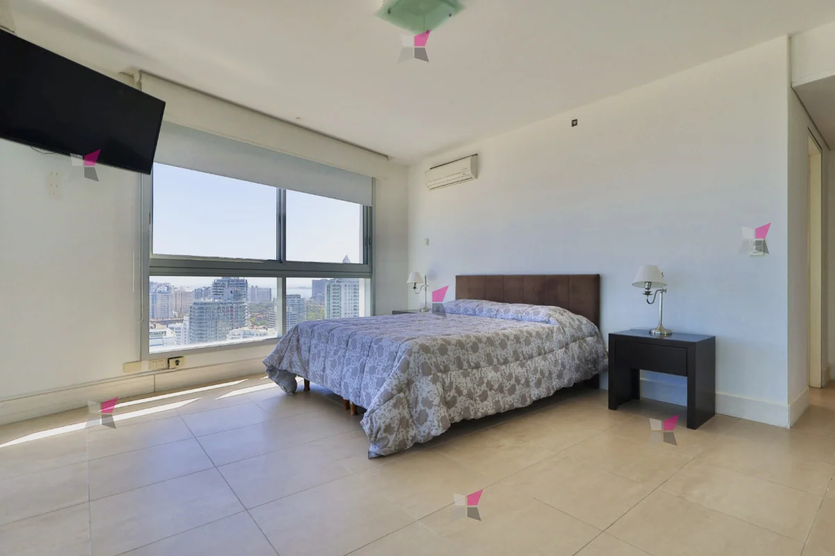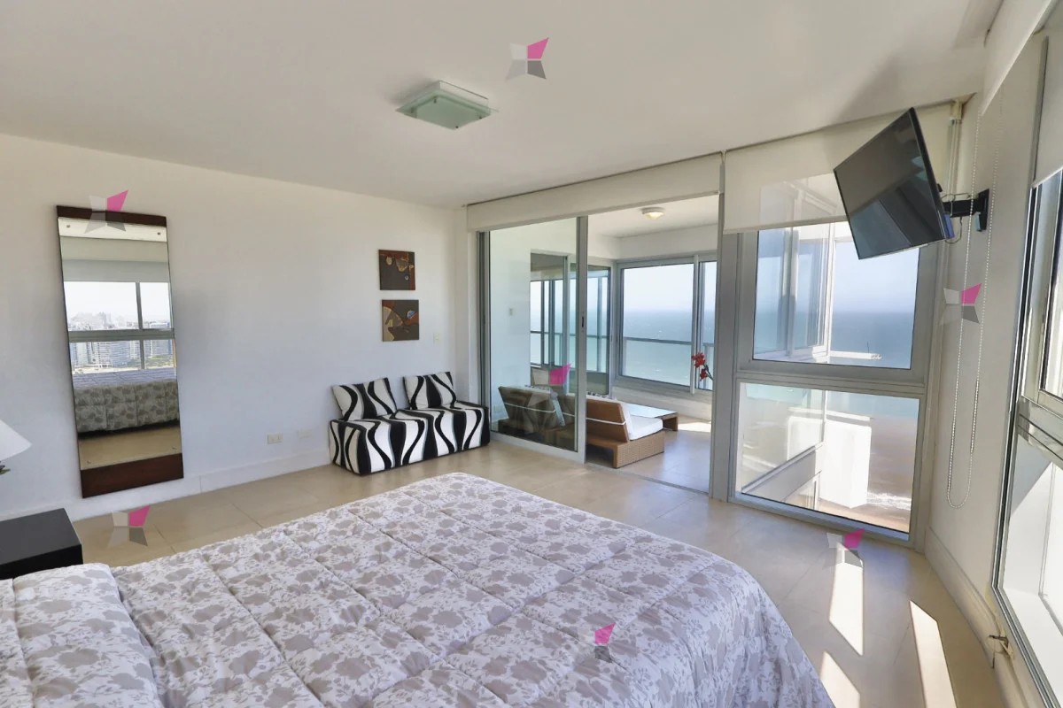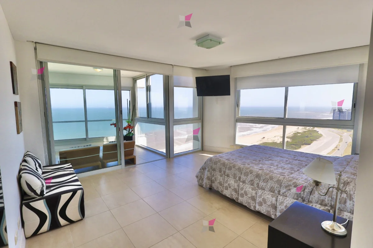 La distribución incluye toilette de recepción y tres dormitorios en suite, todos con vestidor. El dormitorio principal, además, cuenta con acceso a un balcón cerrado ideal para aprovechar durante todo el año. Todos los ambientes disfrutan de excelentes vistas tanto al mar como a la ciudad.