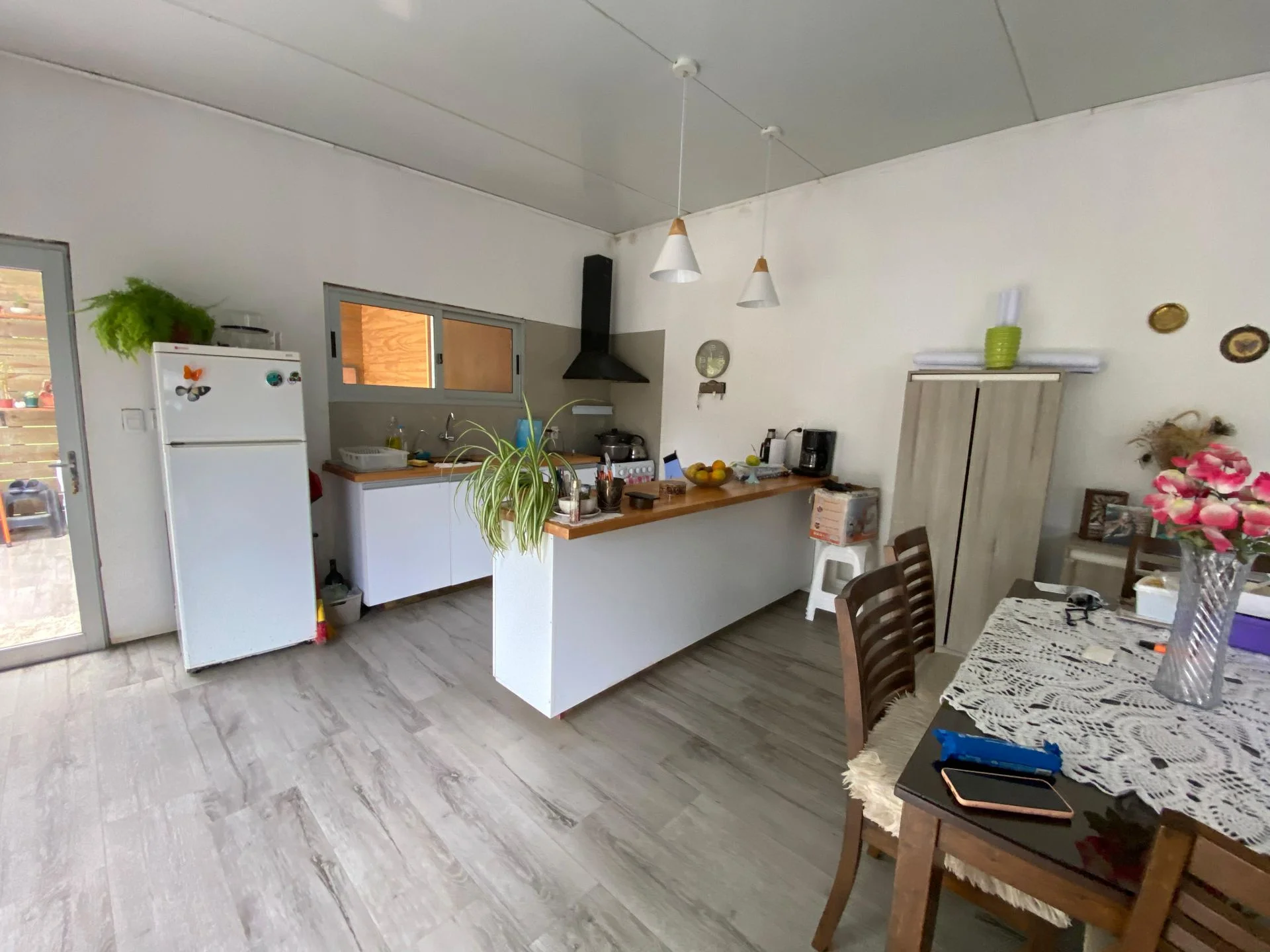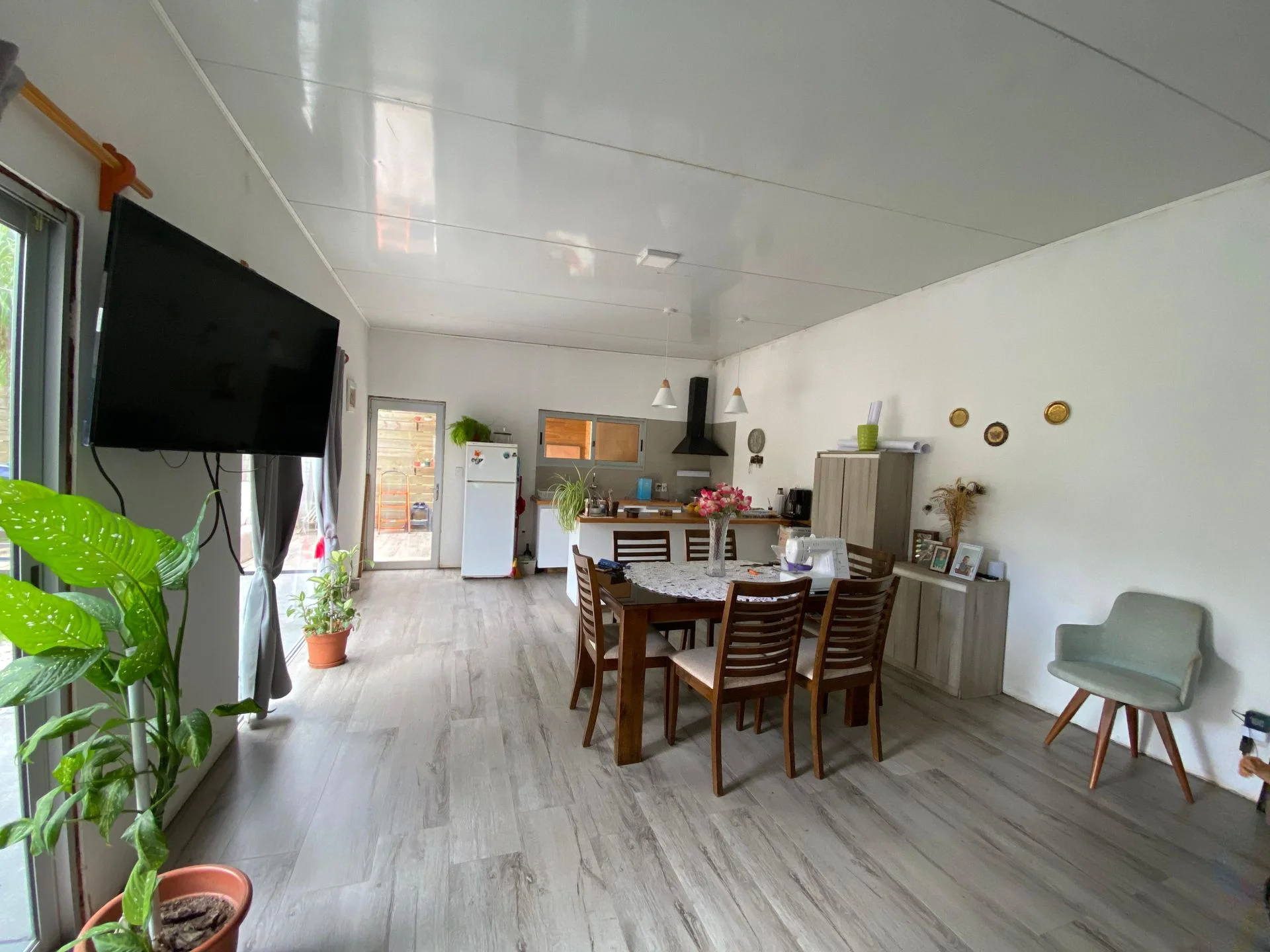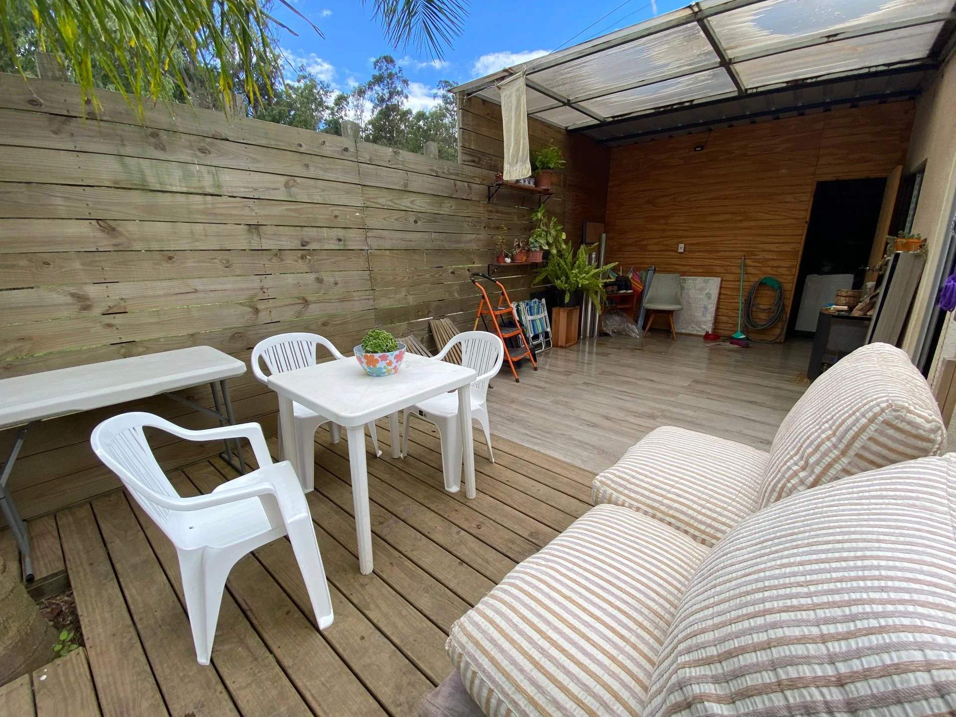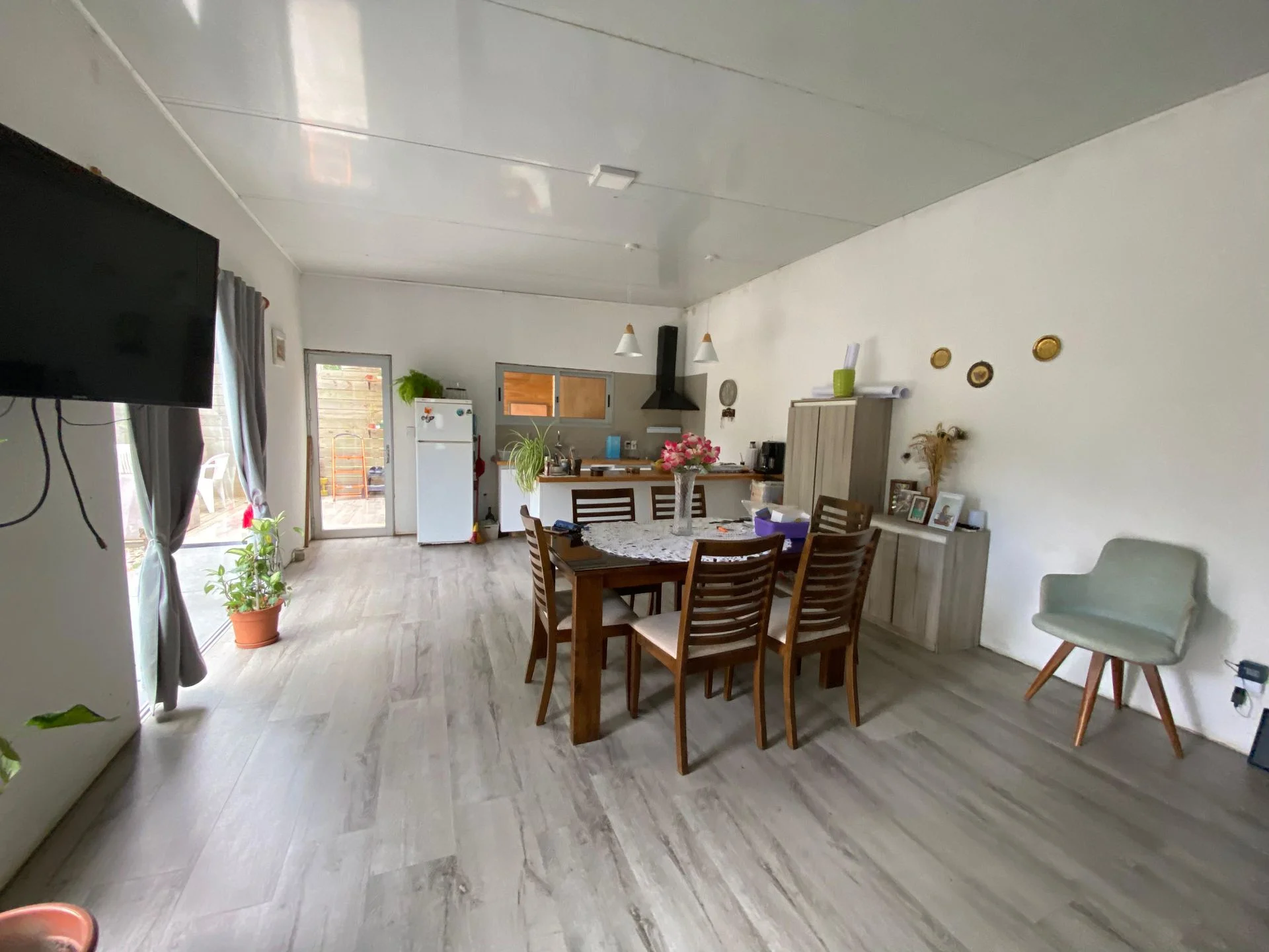Casa de 2 dormitorios; 1 de ellos con vestidor un baño, cocina living comedor integrados con puestas ventanas con salida al deck y jardín.