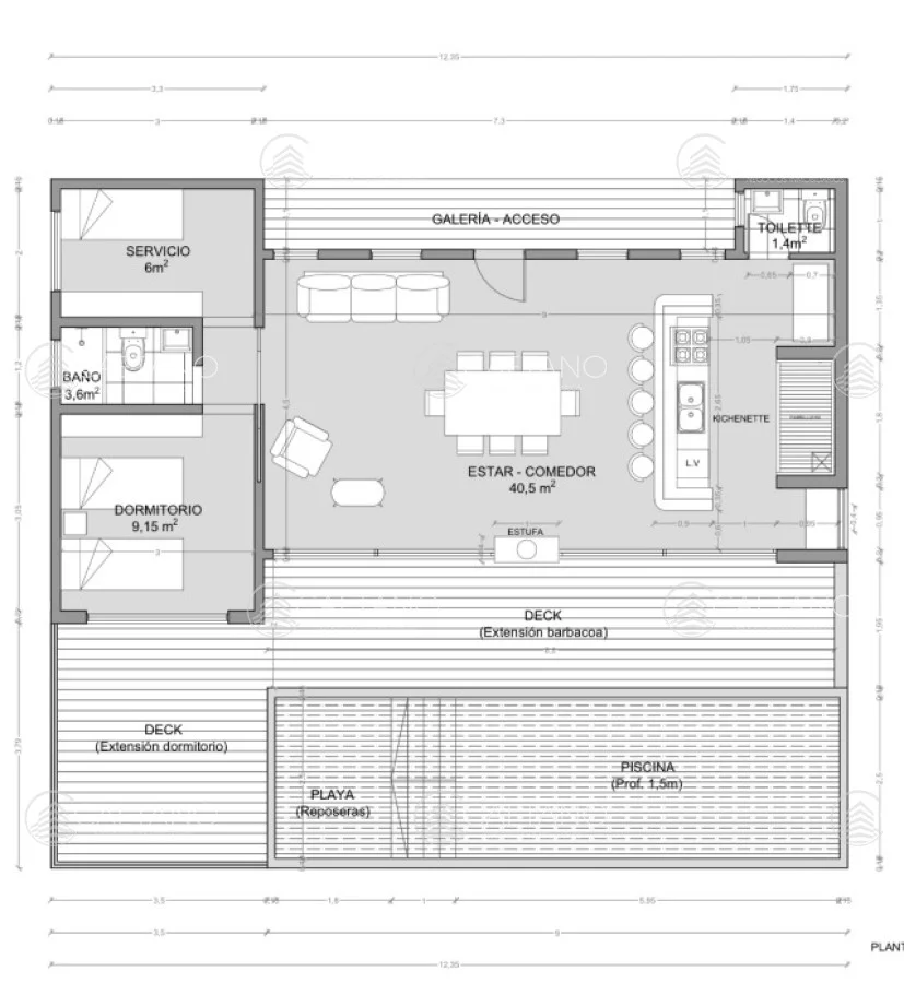 1 dormitorio, baño completo y un cómodo espacio exterior con fogón, barra y deck de madera.