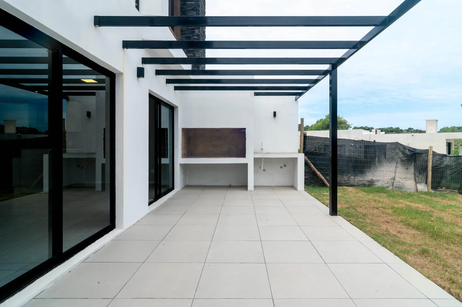 Pérgola exterior con parrillero, ideal para reuniones al aire libre.