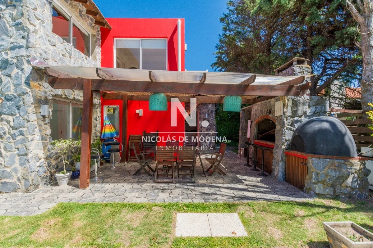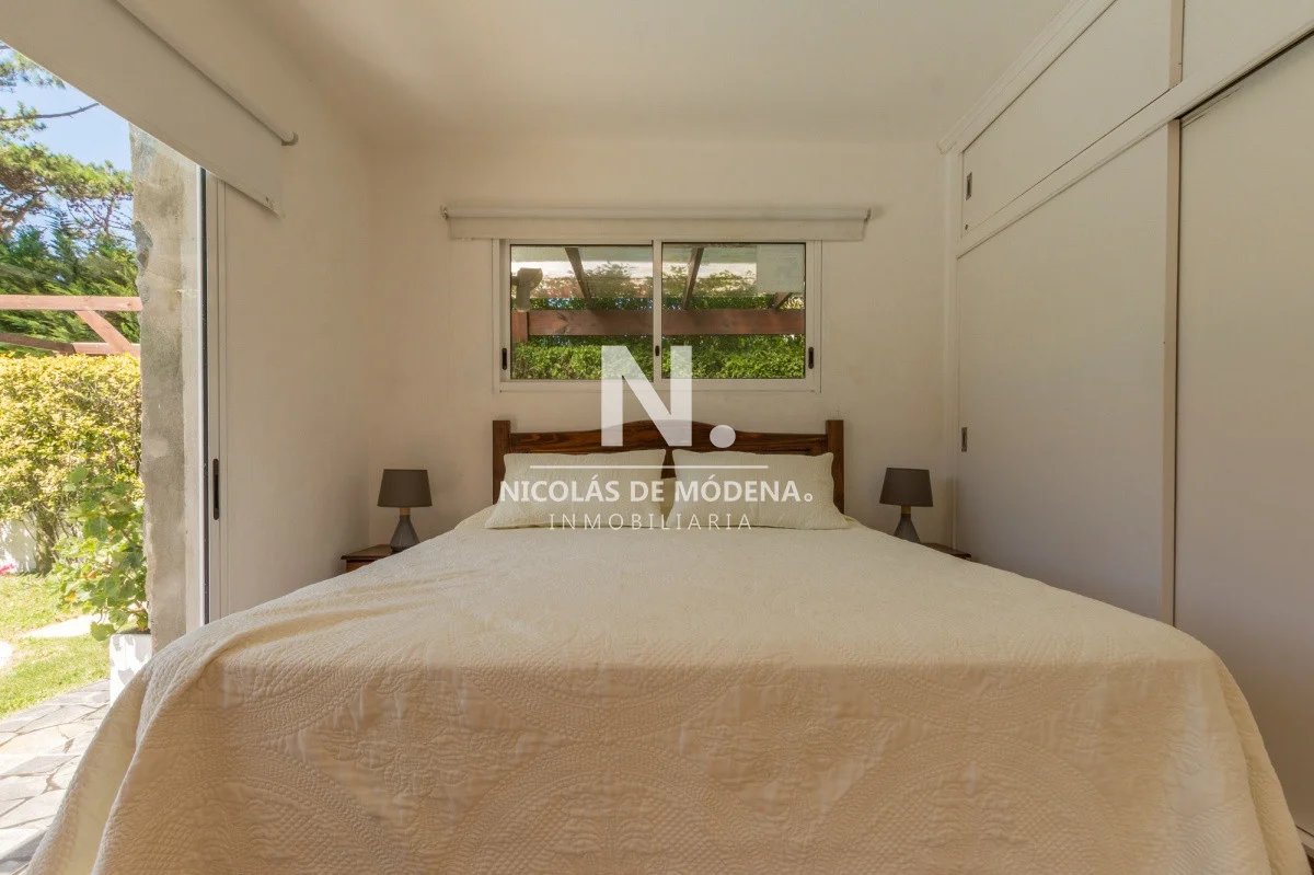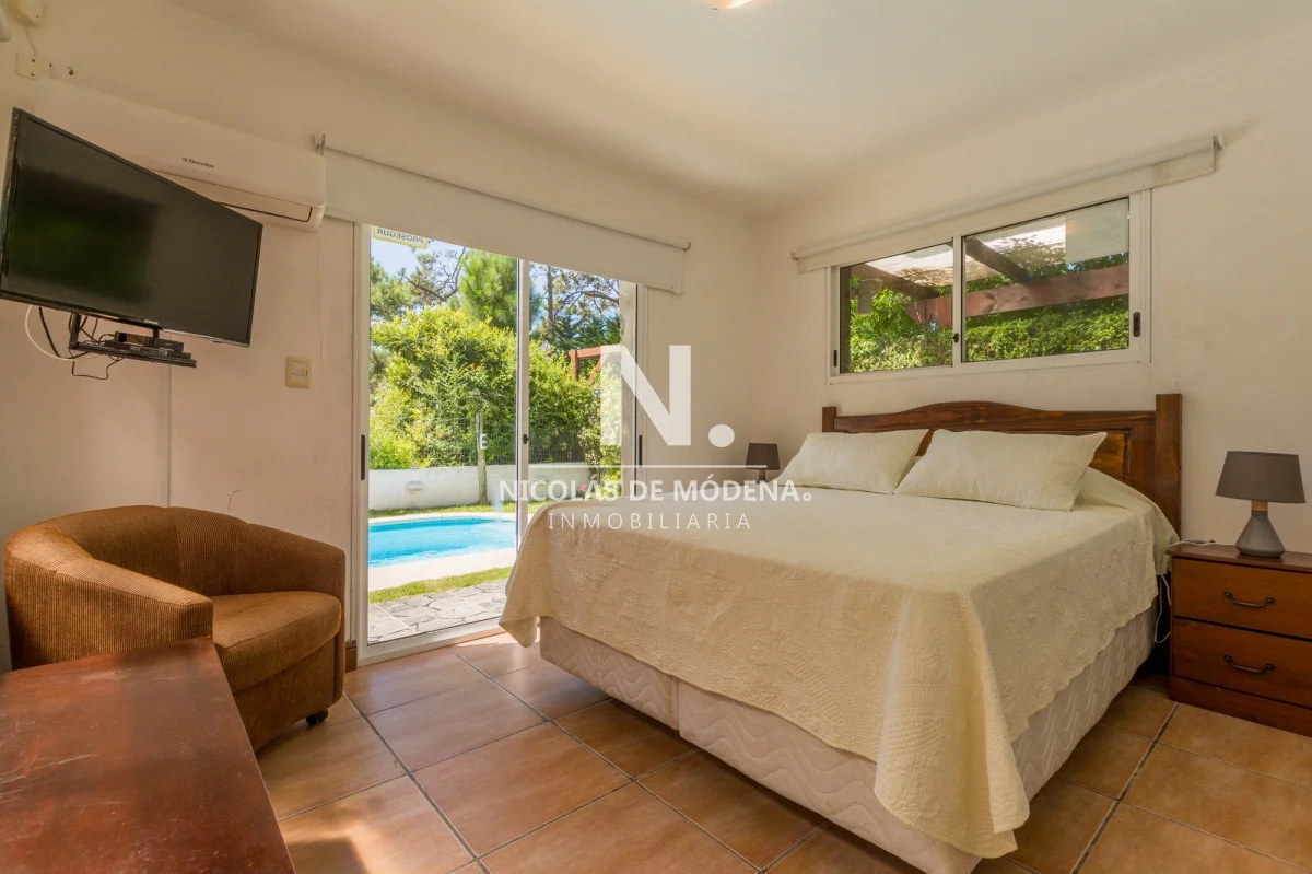 Con 3 dormitorios (1 en suite) distribuidos en planta baja la suite y dependencia con baño. En planta alta 2 dormitorios con baño y otro cuarto playroom. Totalmente equipada con aa, wifi, cable. Parrillero techado con horno de pizza y jardín muy disfrutable con piscina climatizada, totalmente cerrado.