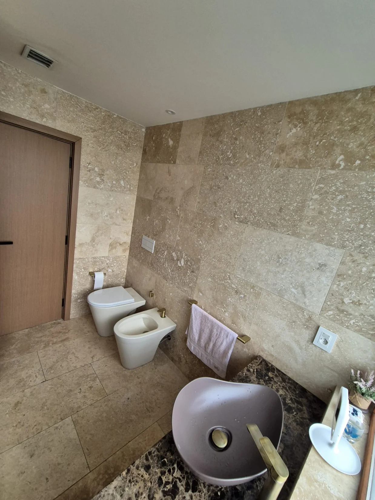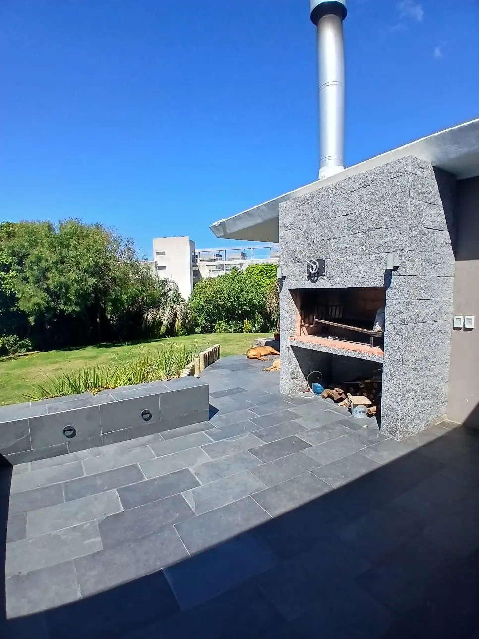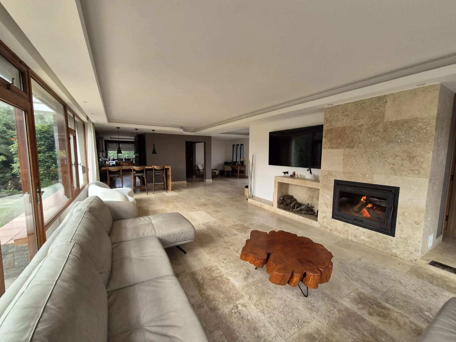 El corazón de la casa es un espectacular living-comedor de espacios abiertos, donde los pisos de piedra natural y una moderna estufa a leña de alto rendimiento crean una atmósfera de lujo despojado y calidez.