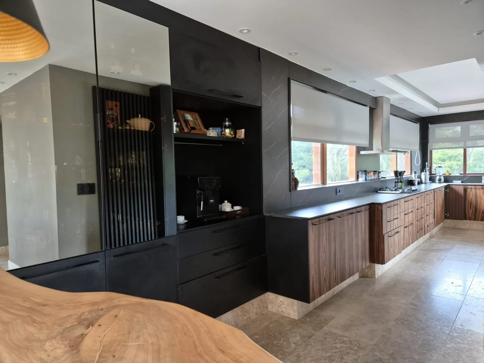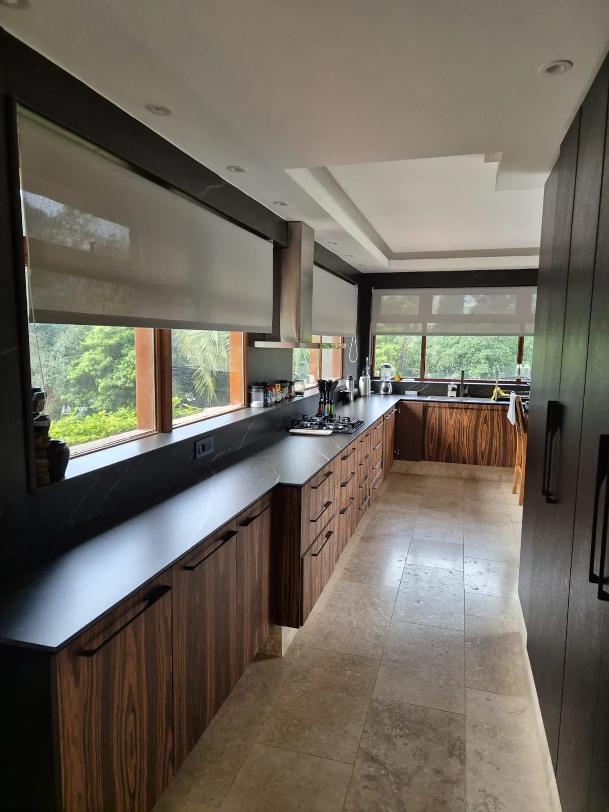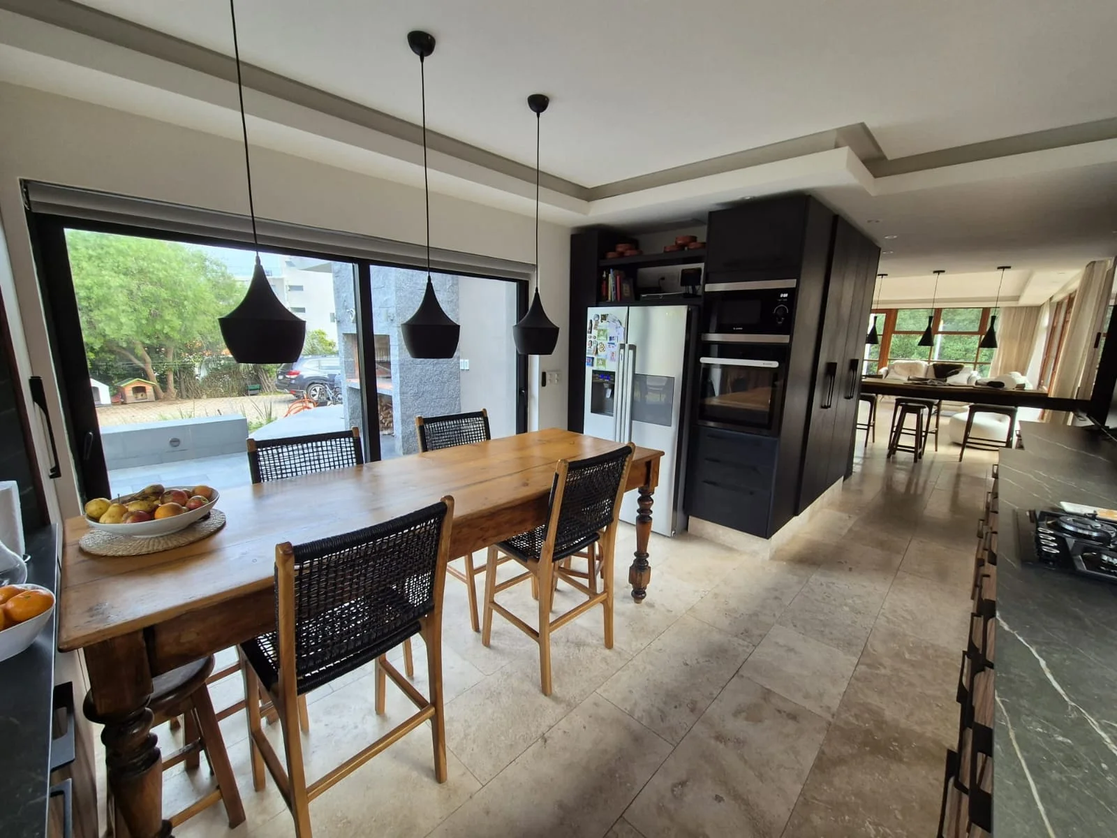 La cocina, protagonista indiscutida, combina maderas nobles de veta oscura con mesadas de alta gama y electrodomésticos de última generación. Es un espacio funcional y de diseño, que se complementa con un comedor diario que fusiona elementos rústicos y modernos, demostrando un "estilo que expresa exclusividad".