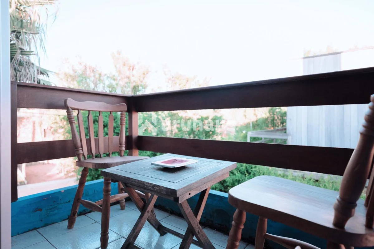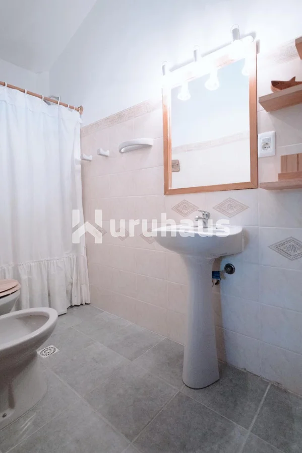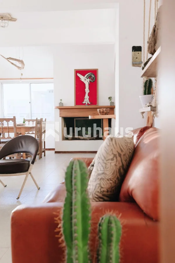 PB, gran living comedor con estufa a leña; tres habitaciones; un baño completo; y una puerta ventana que sale a un parrillero con vista a la piscina.