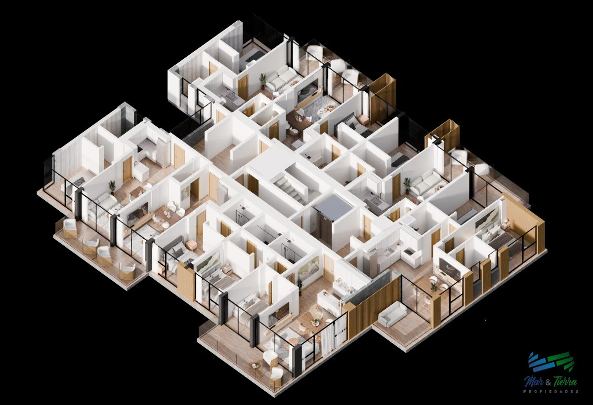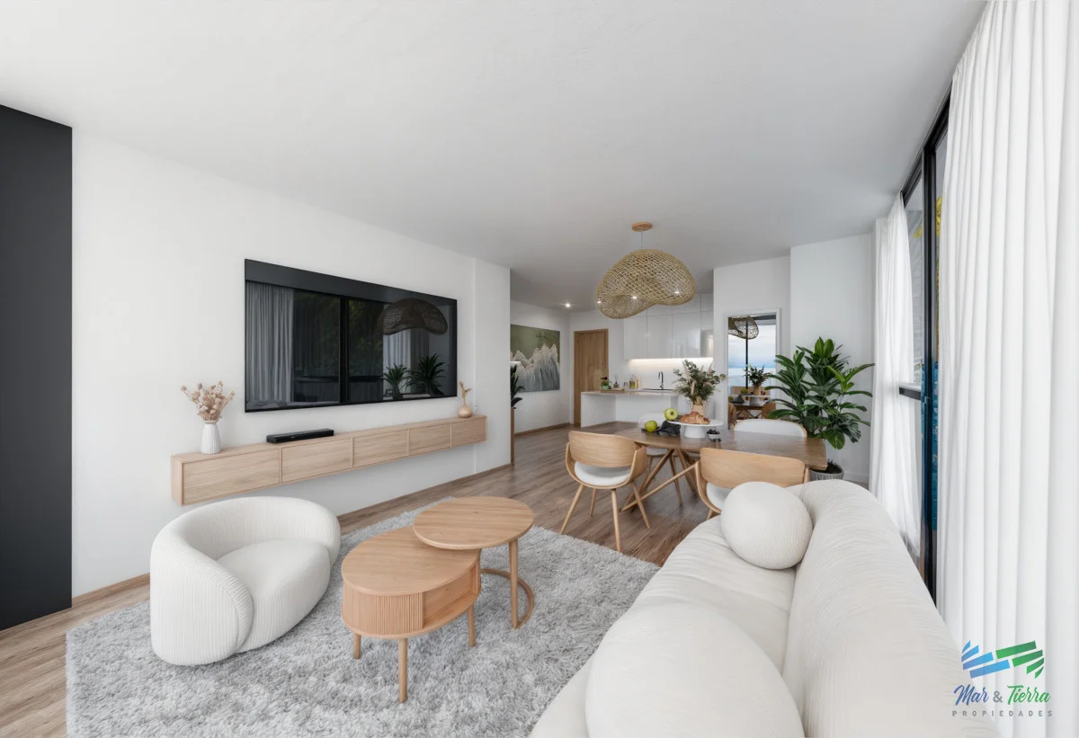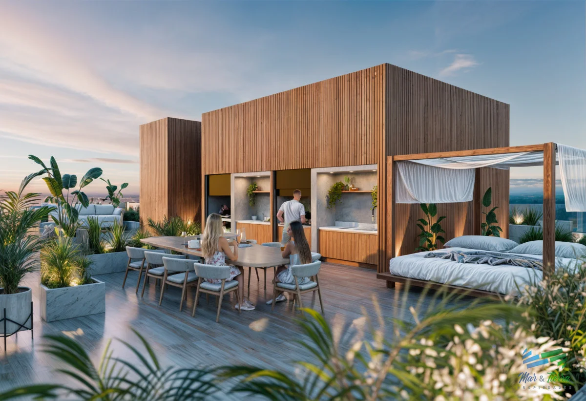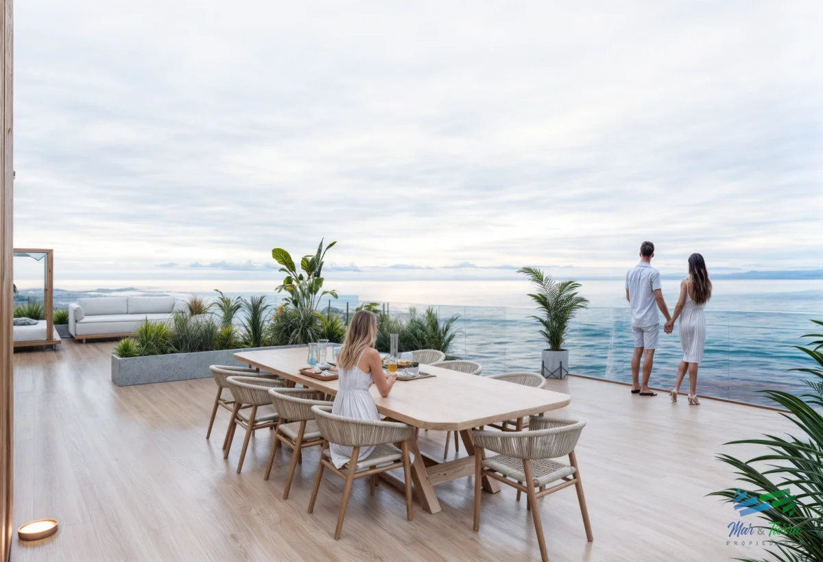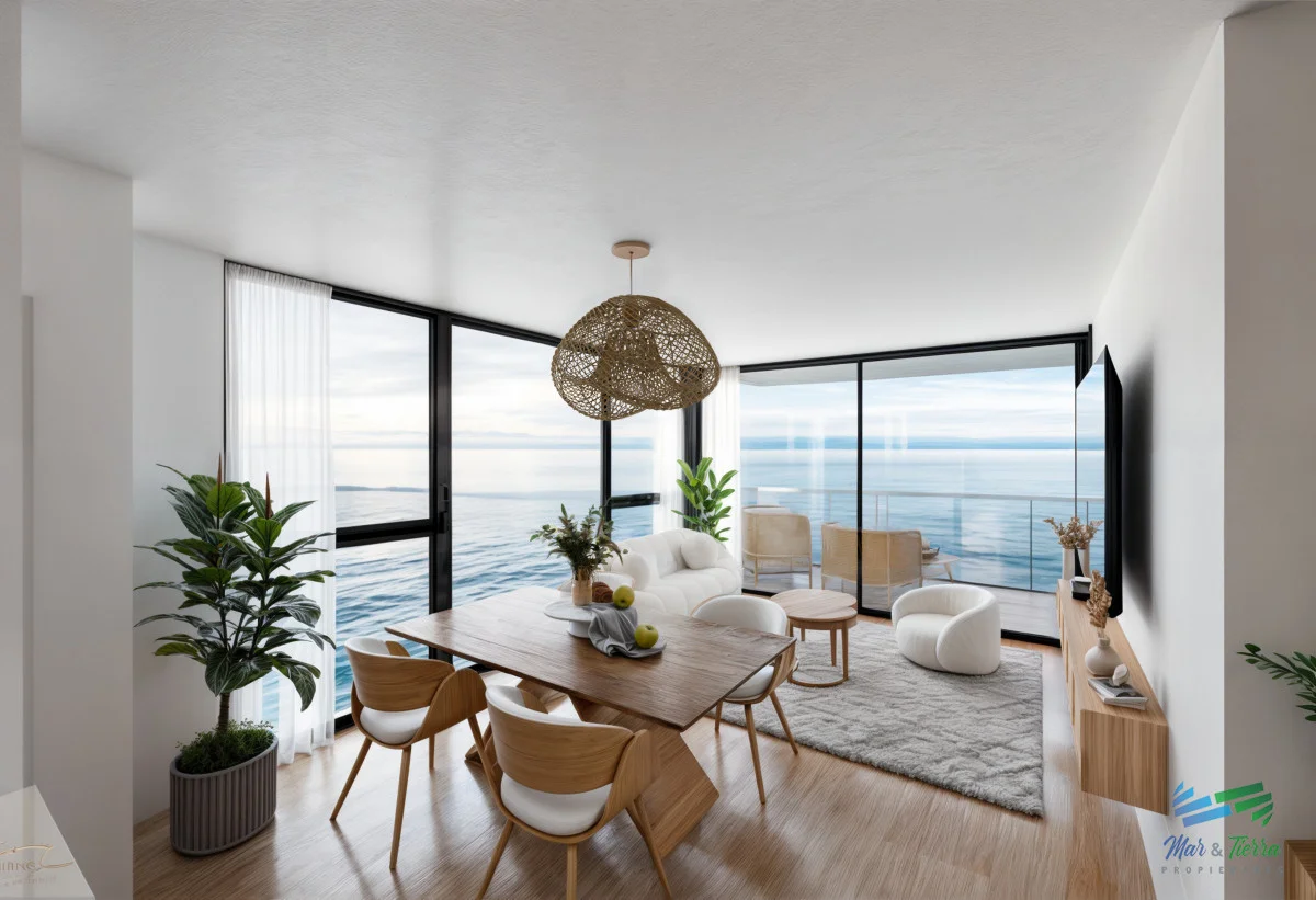 terminaciones y arquitectura amable con el entorno, donde se destacan materiales nobles como el hormigón, la madera, y el vidrio, generando transparencias que funden amplios ambientes con el cielo y el mar.